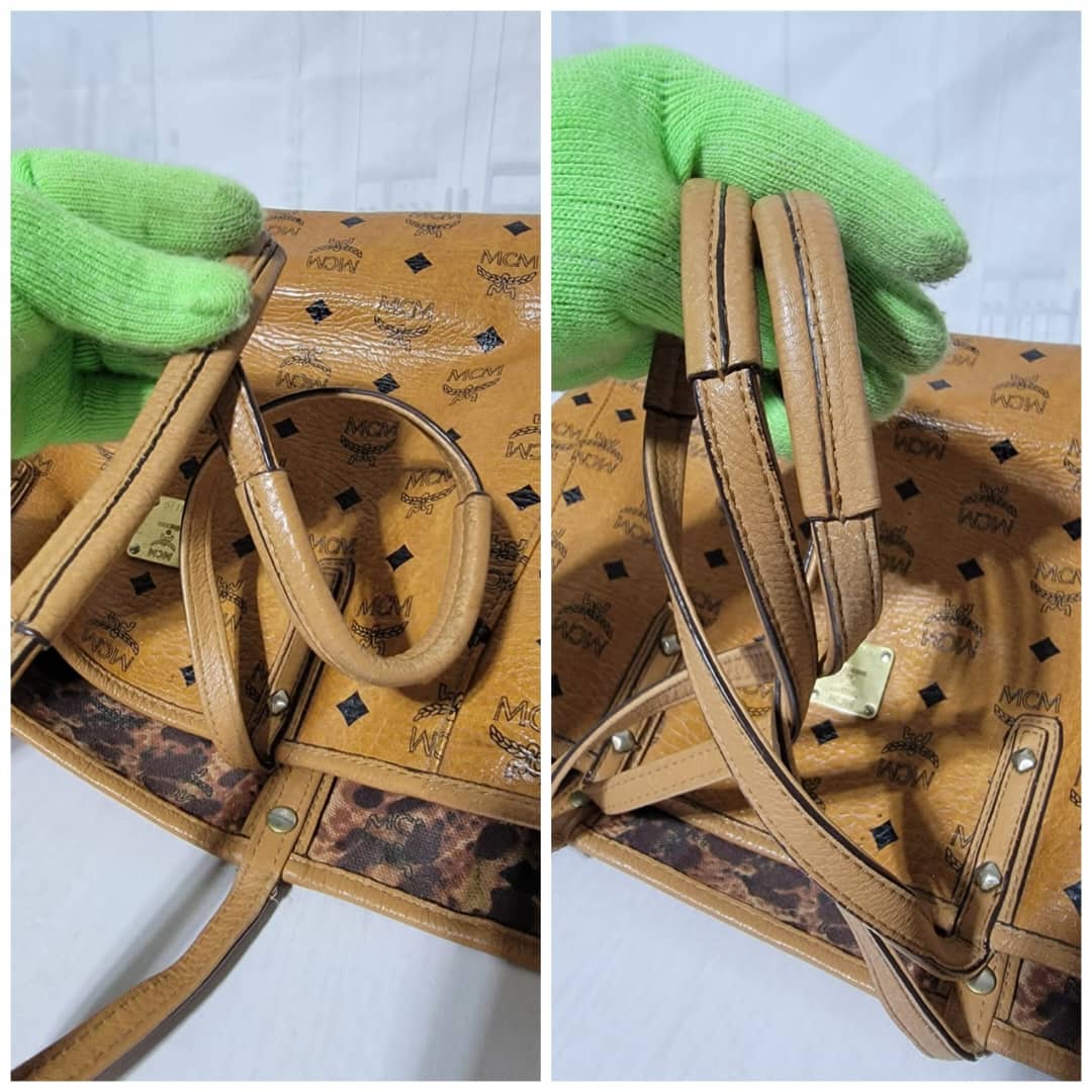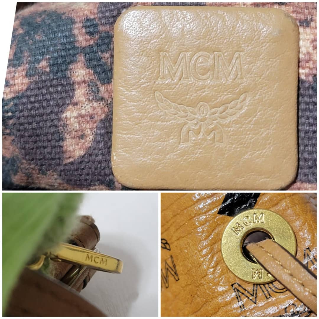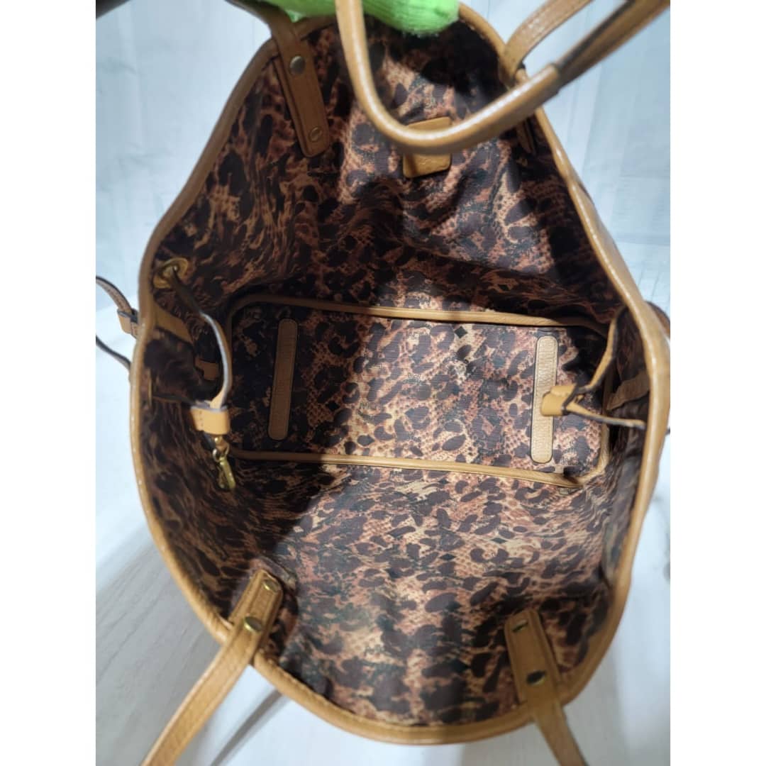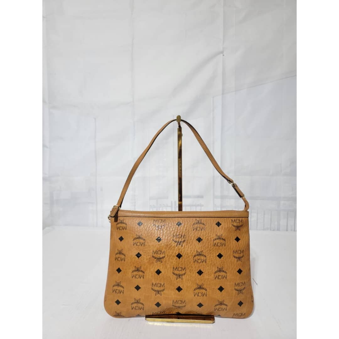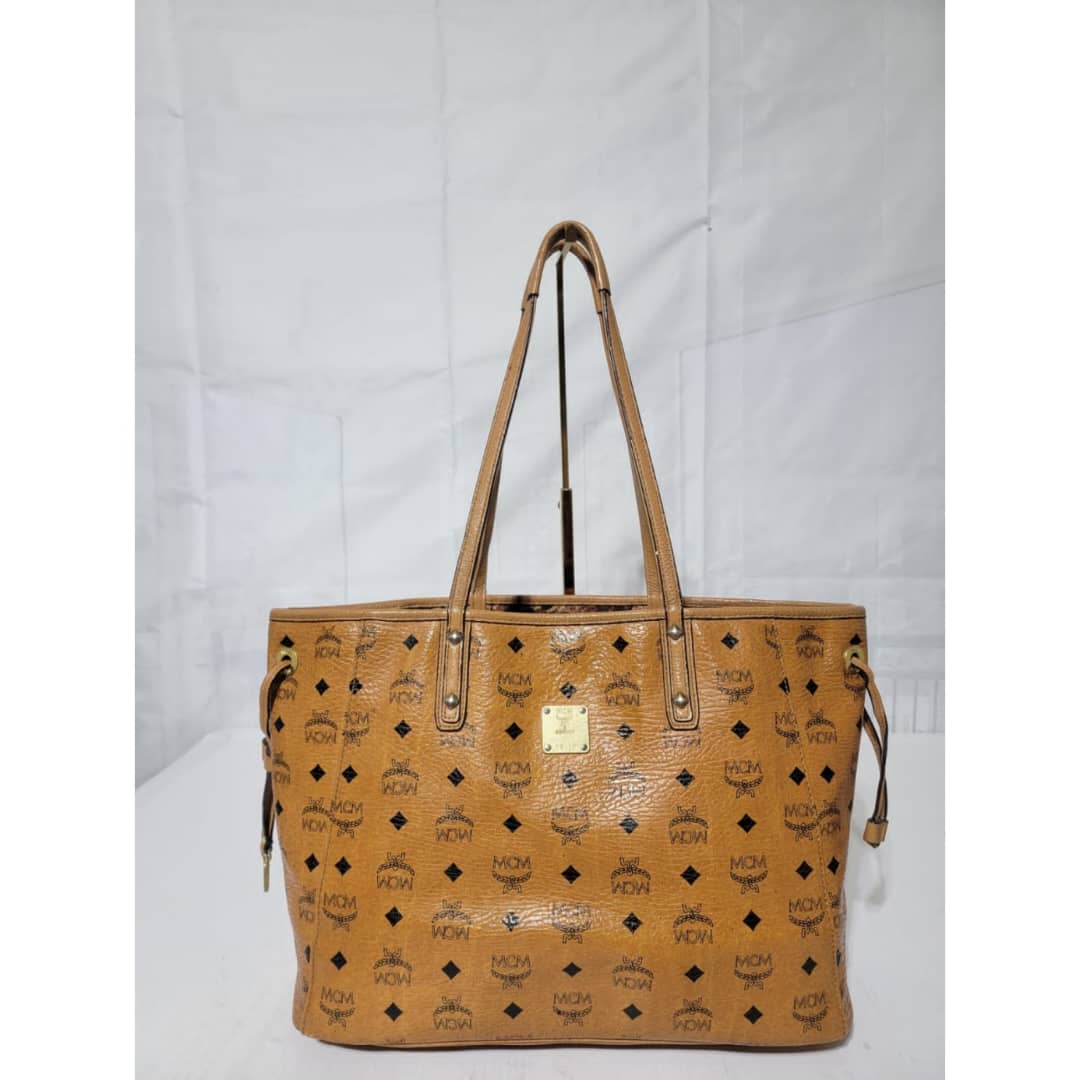 This authentic MCM Visetos Coated Canvas Project Reversible Shopper Tote and Pochette Cognac is in it’s good pre-owned condition. The exterior is clean and beautiful. Interior is clean. It can be worn separately like a tote and also like a shoulder Pochette. Gold hardware shows rubbing.
