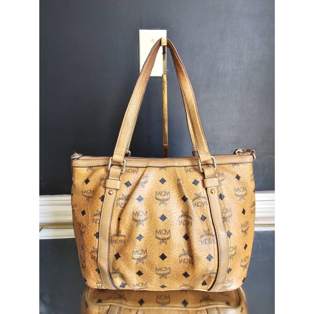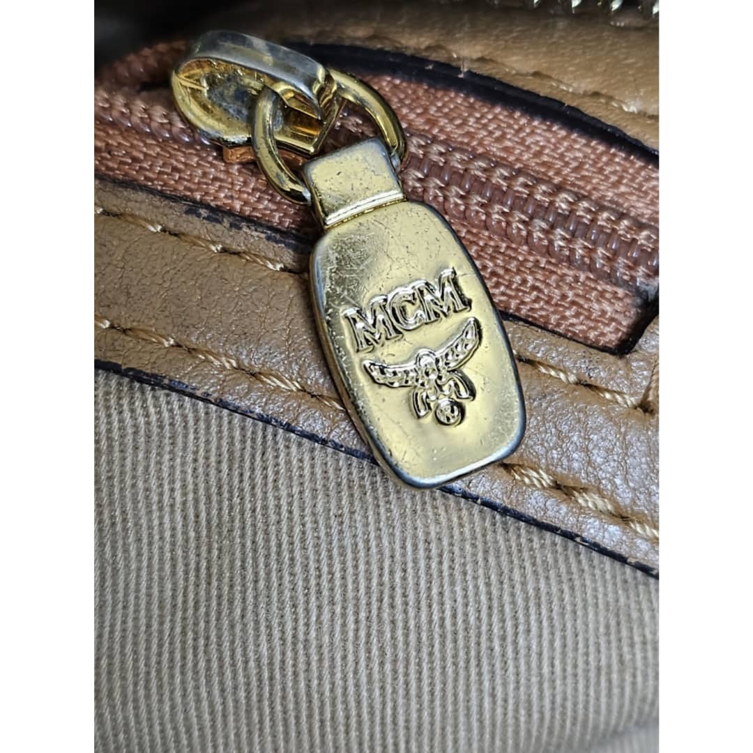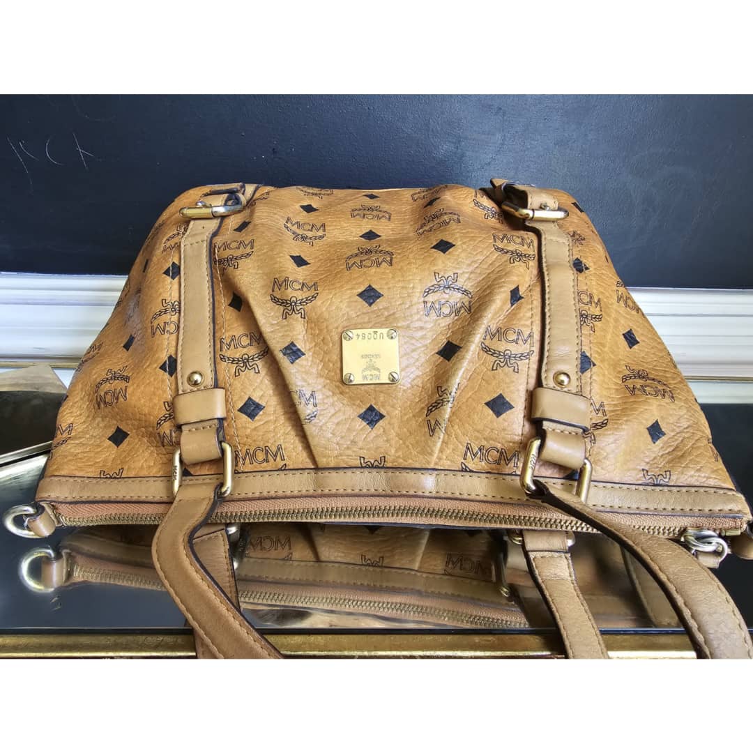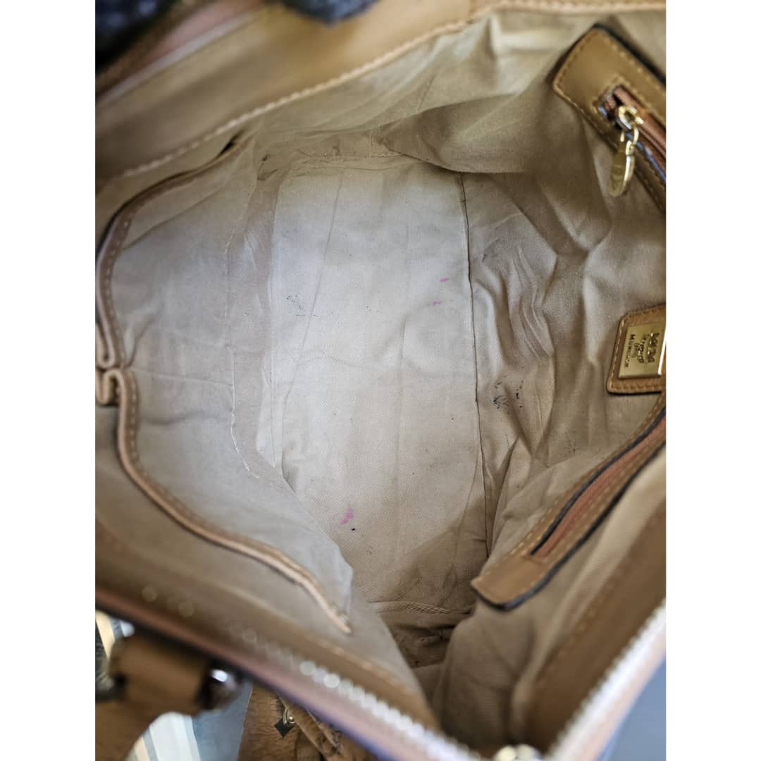This authentic MCM Visetos PVC Handbag/Shoulder Bag Brown is in it’s good pre-owned condition. The exterior leather is clean and beautiful, shows some wear at the pleated corner of the bag. Handle shows some rubbing. Interior is clean. Gold hardware. No long strap but a chain strap can be added.