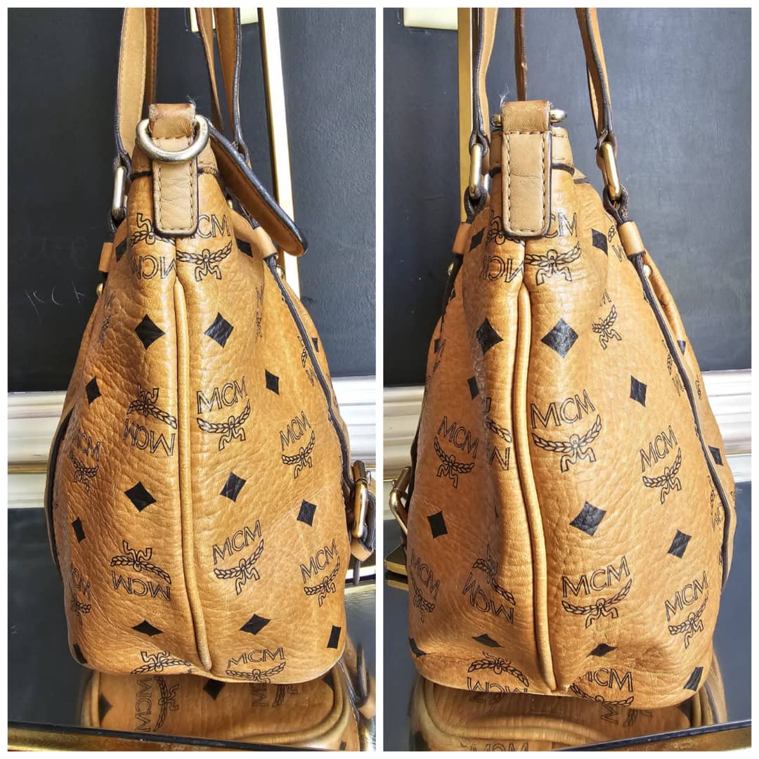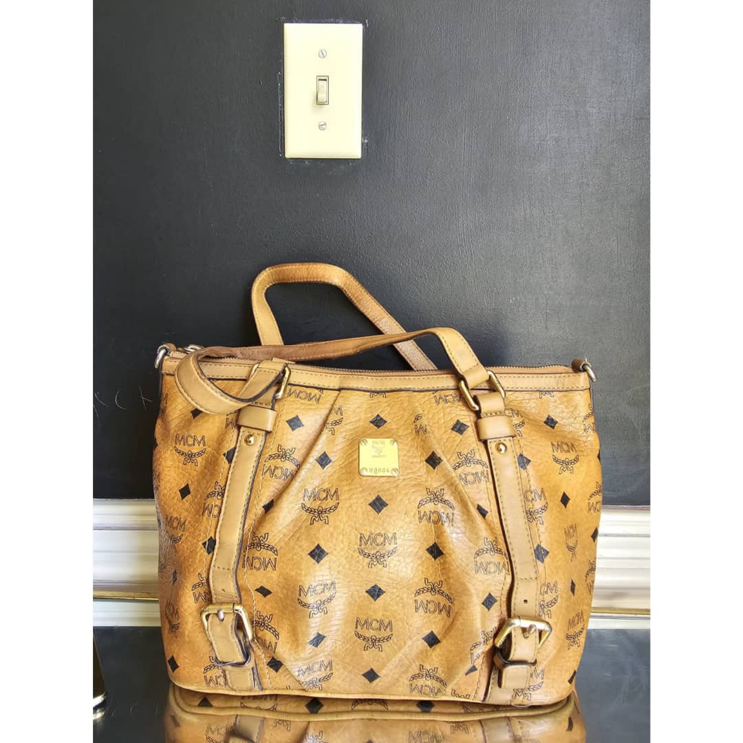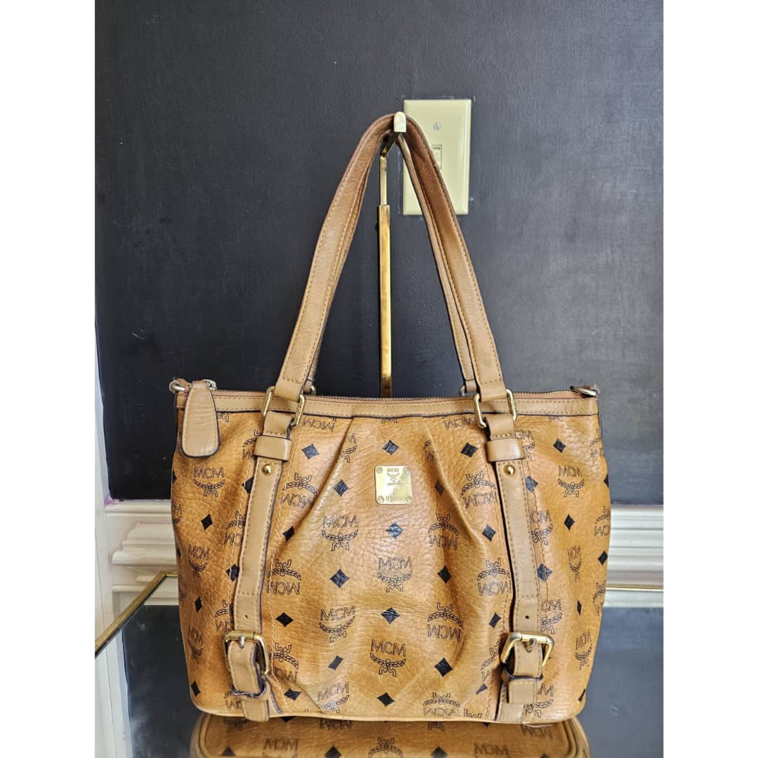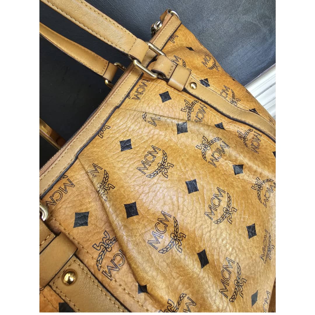 This authentic MCM Visetos PVC Handbag/Shoulder Bag Brown is in it’s good pre-owned condition. The exterior leather is clean and beautiful, shows some wear at the pleated corner of the bag. Handle shows some rubbing. Interior is clean. Gold hardware. No long strap but a chain strap can be added.