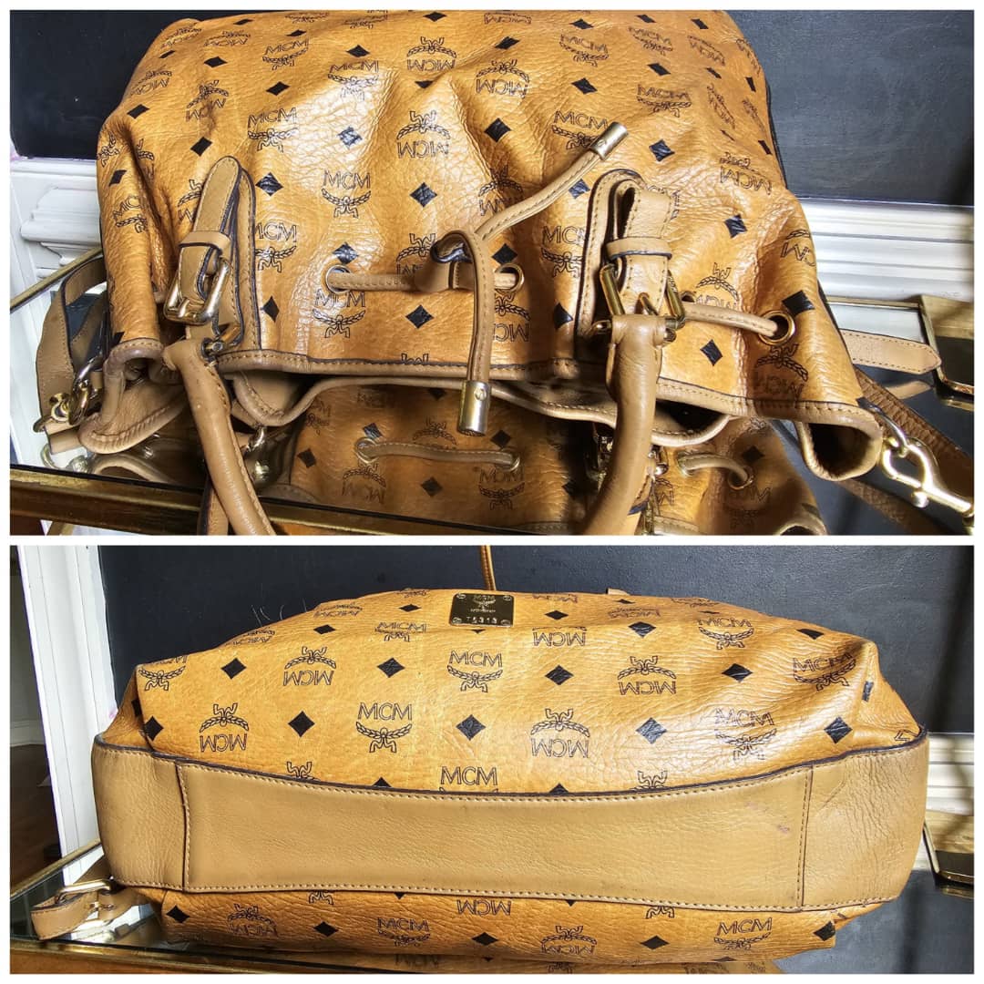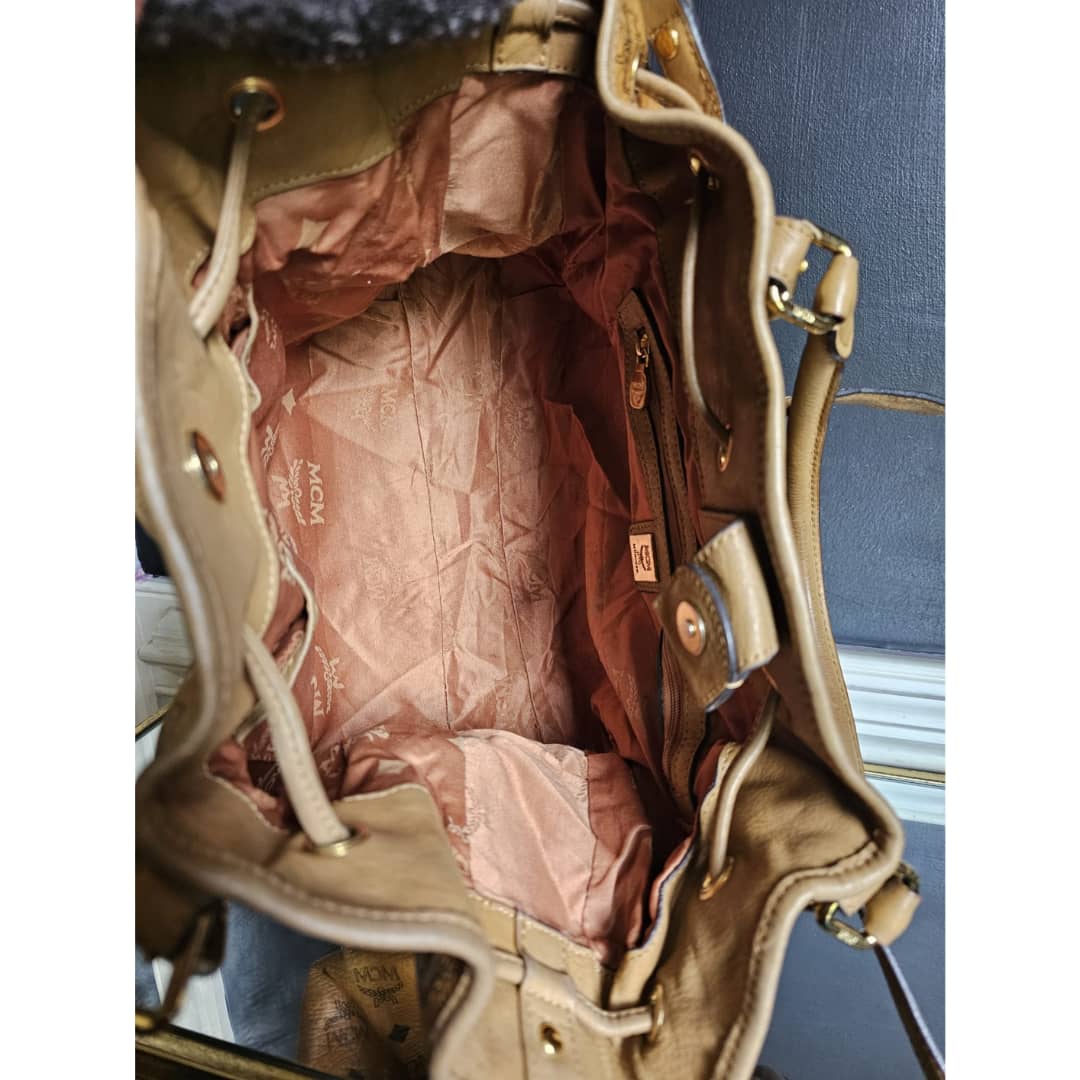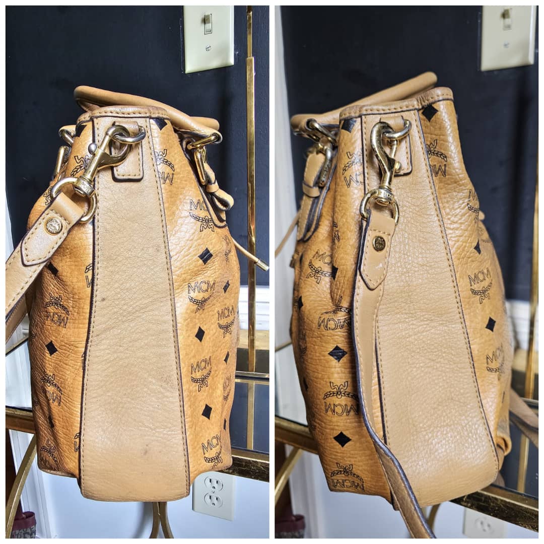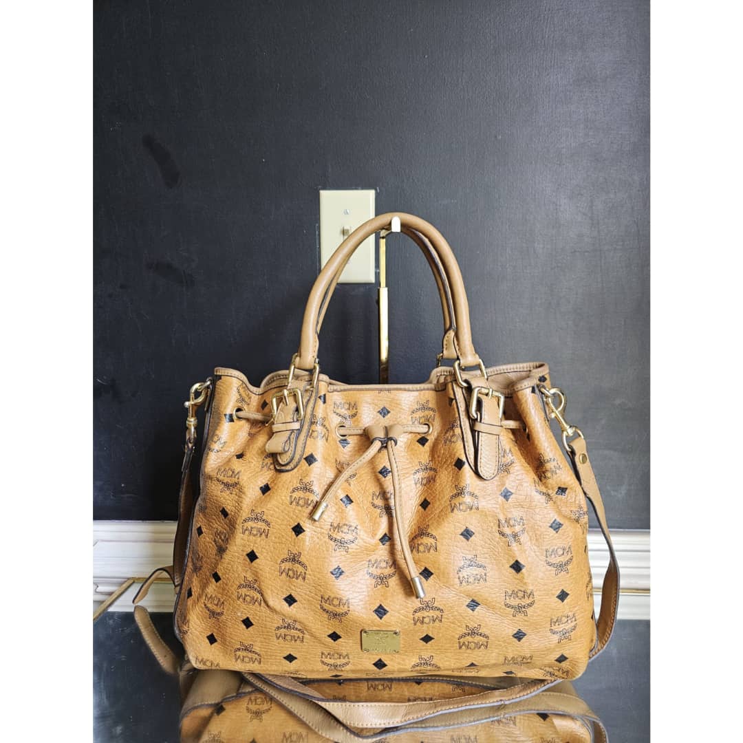This authentic MCM Visetos Drawstring Bucket Bag Cognac is in it’s good pre-owned condition. The front exterior leather is clean and beautiful. Back exterior is clean but shows little rubbing wear to the coated leather, base edges shows little rubbing (Kindly review pictures above). Interior is clean. Gold hardware.