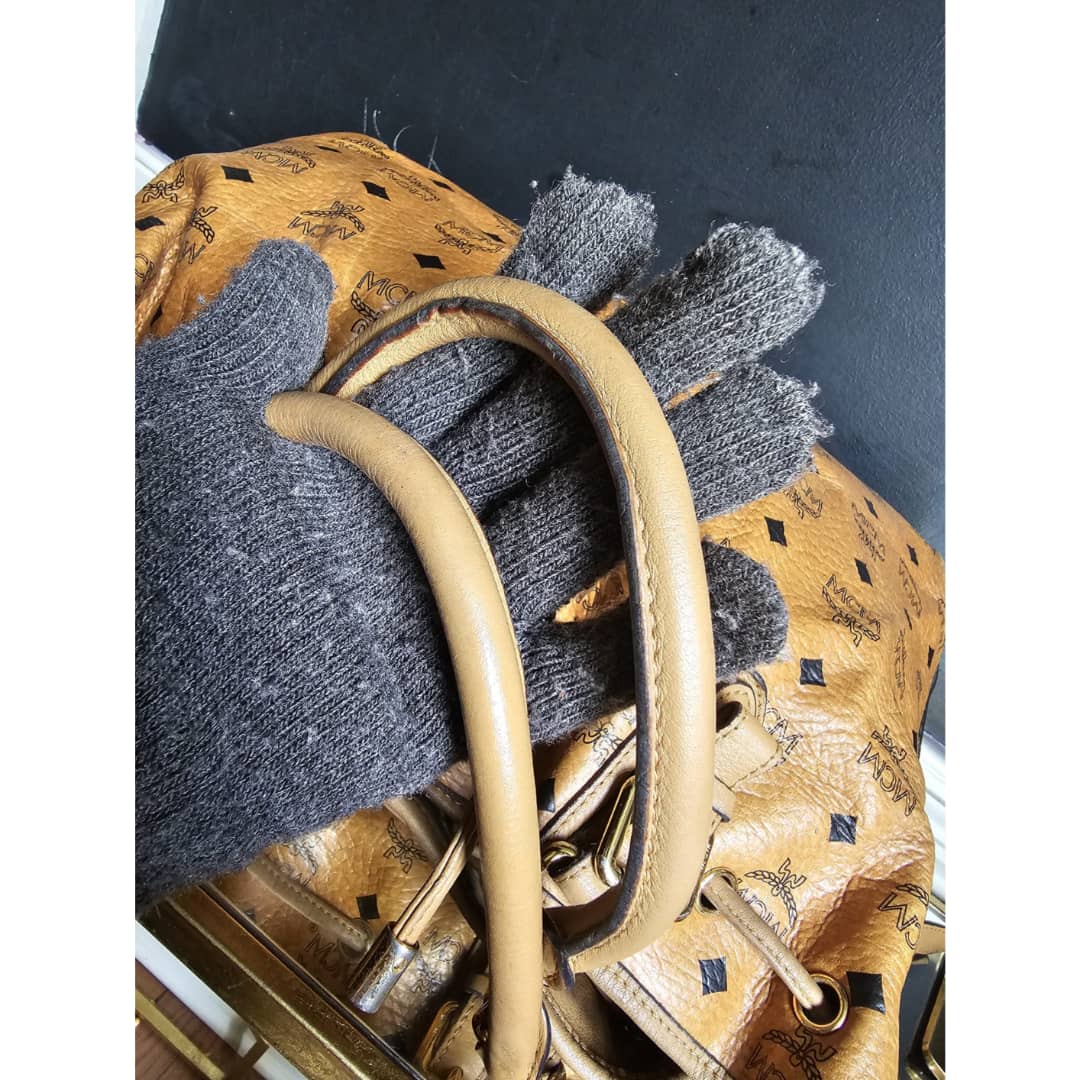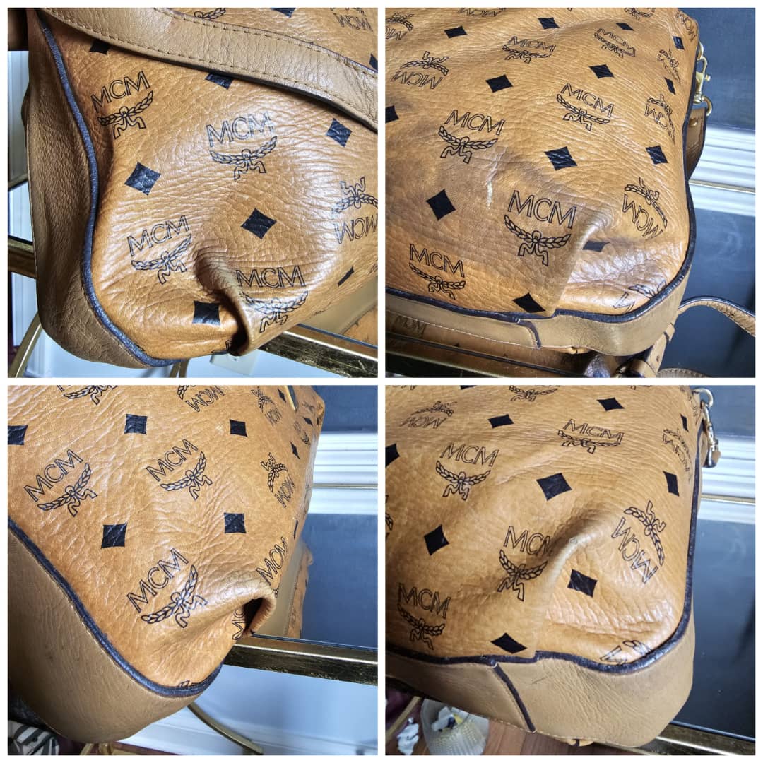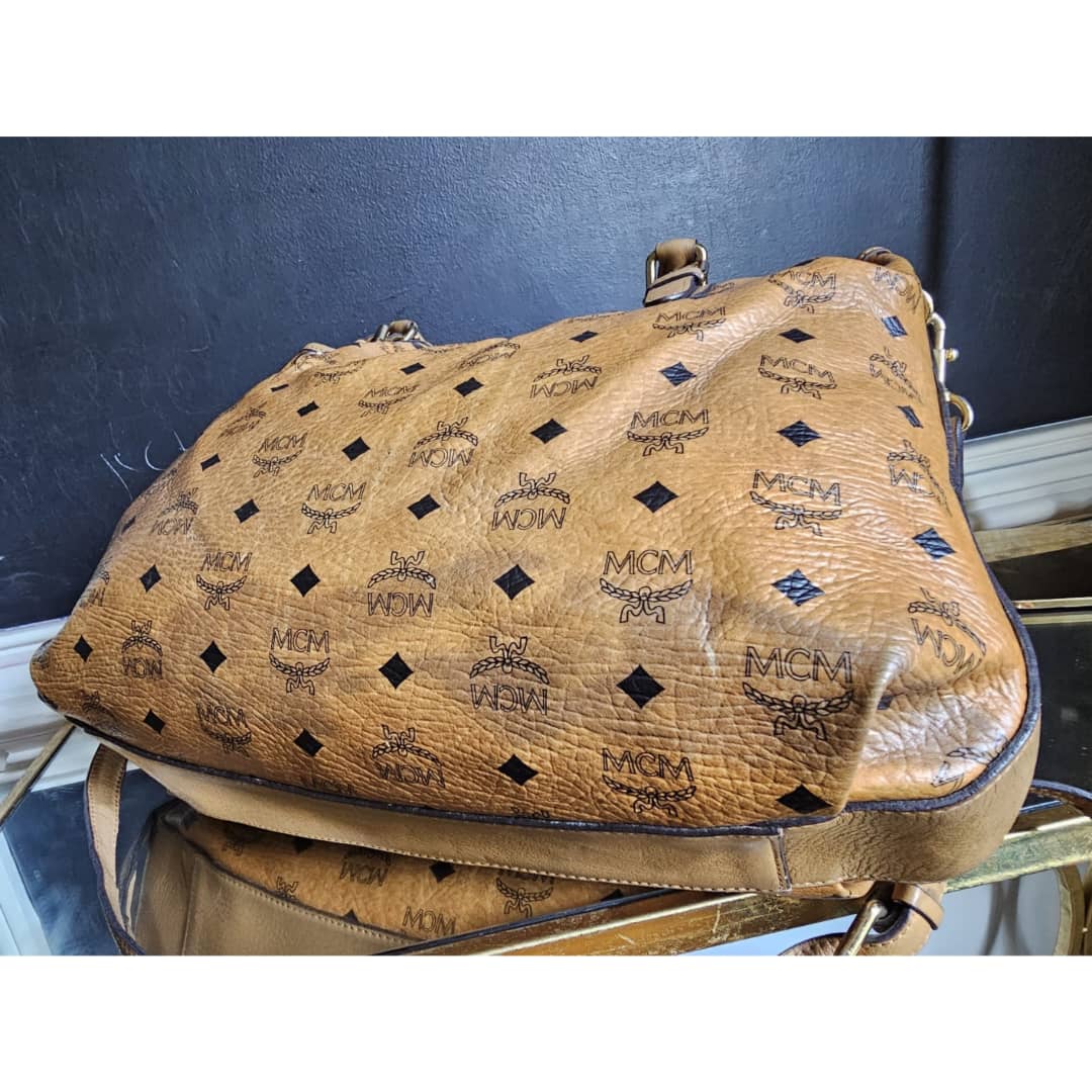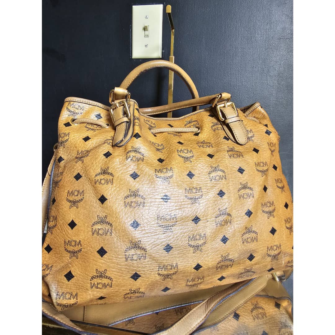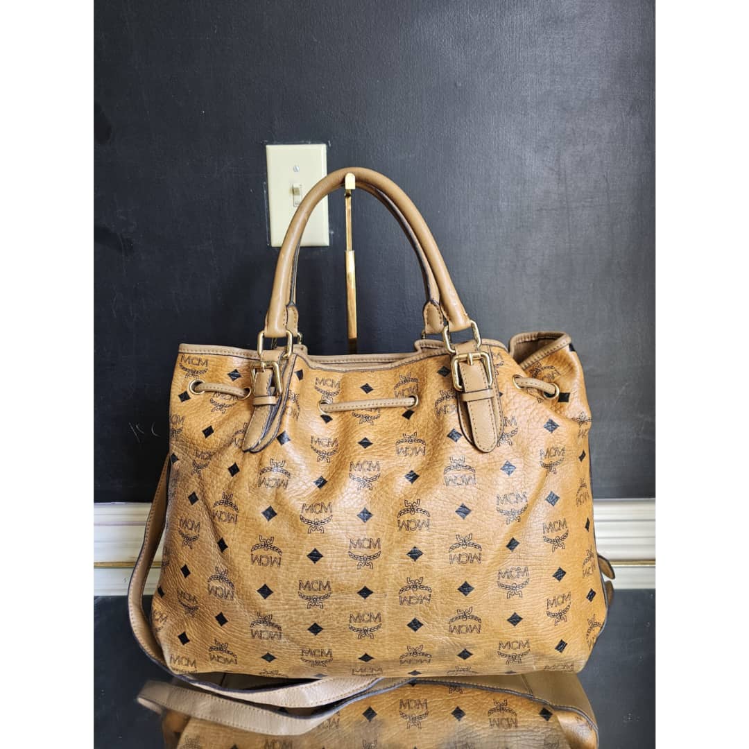 This authentic MCM Visetos Drawstring Bucket Bag Cognac is in it’s good pre-owned condition. The front exterior leather is clean and beautiful. Back exterior is clean but shows little rubbing wear to the coated leather, base edges shows little rubbing (Kindly review pictures above). Interior is clean. Gold hardware.