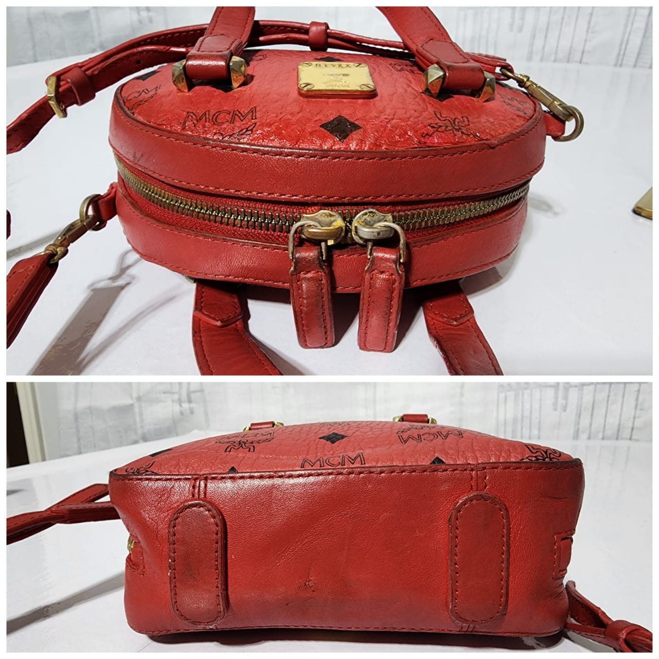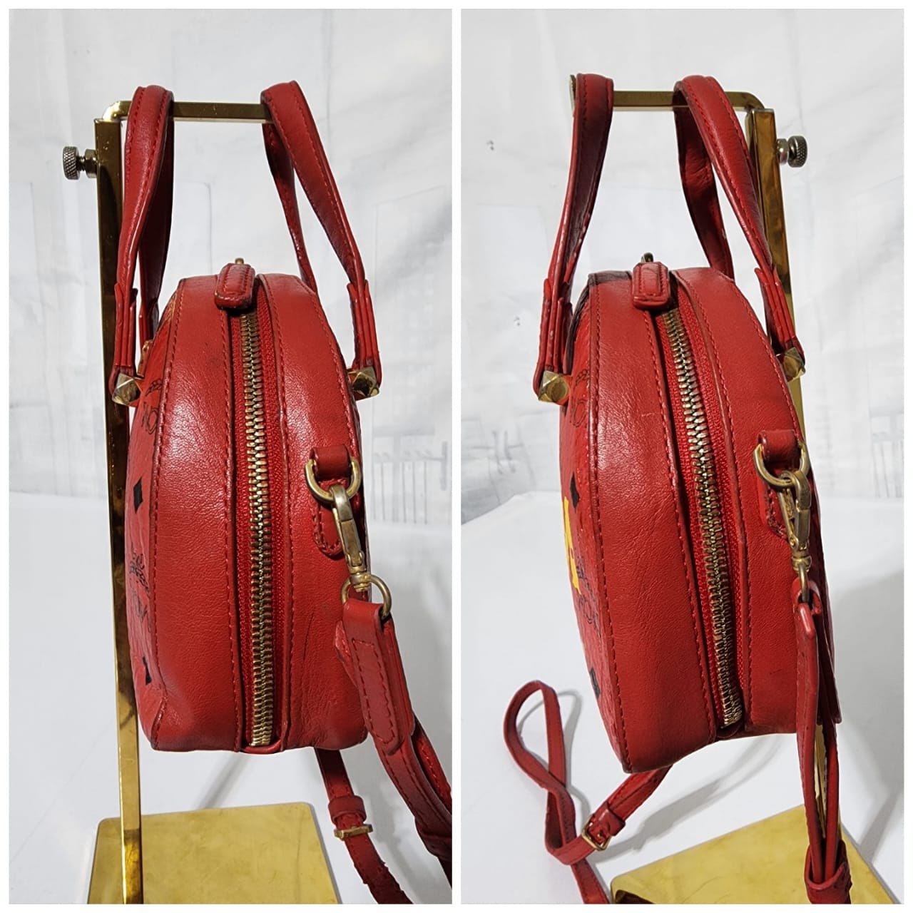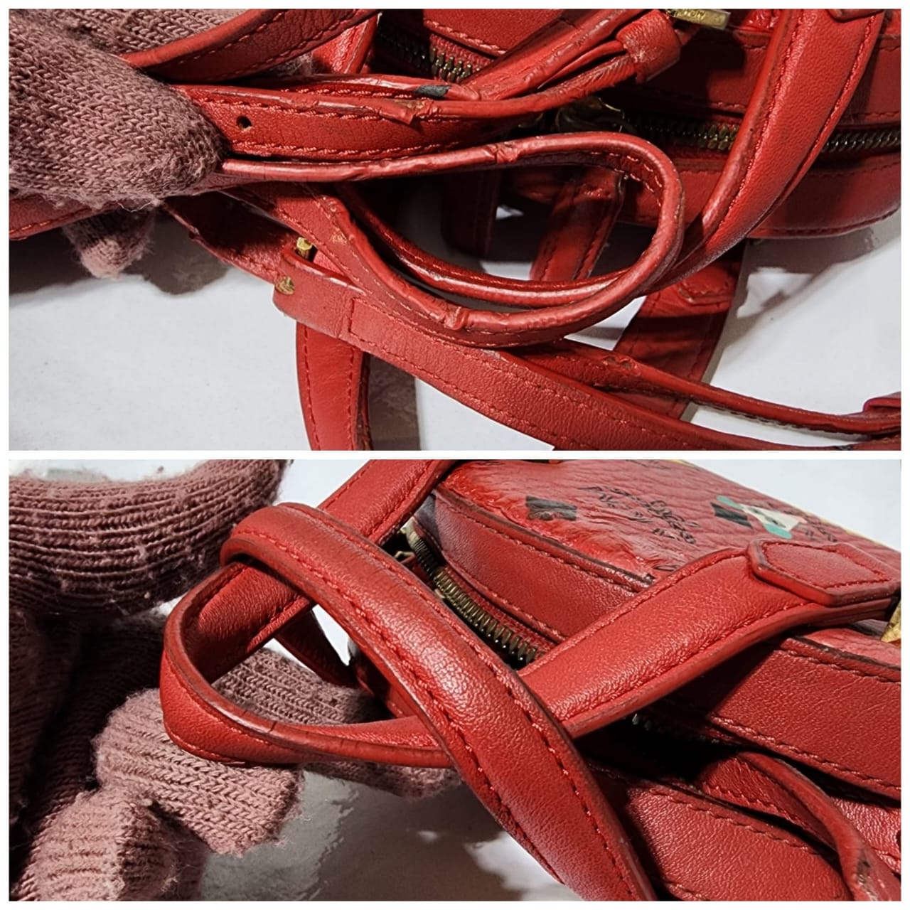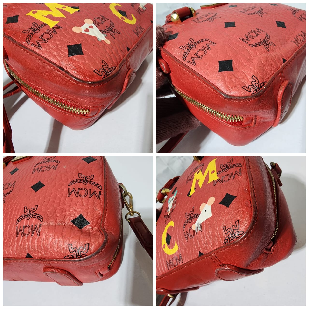 This authentic MCM Visetos Essential Mini Tote Bag Red is in it’s pre-owned condition. The exterior coated canvas is clean however, it shows some sign of wear to it. The top trim shows some smudging of the canvas. The top back of the bag shows some smudging to it (Kindly look at pictures above for details). Interior is clean. Hardware shows scratches and rubbing to it. The long strap shows sign of wear.