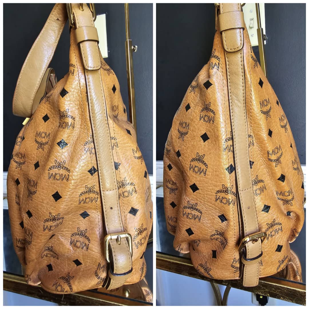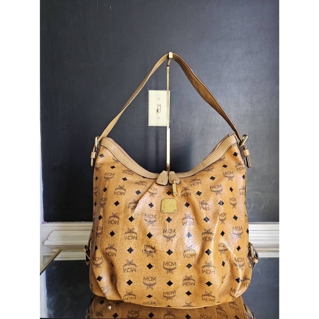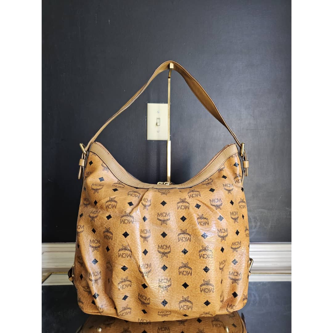This authentic MCM Visetos Hobo Cognac is in it’s good pre-owned condition. The exterior canvas is very clean and beautiful. Interior is clean. Gold hardware with little scratches. It can be worn as a shoulder/crossbody bag. Has an adjustable strap.
