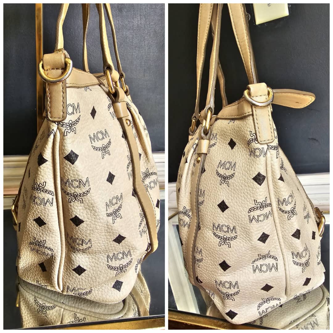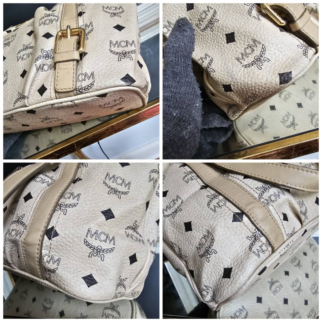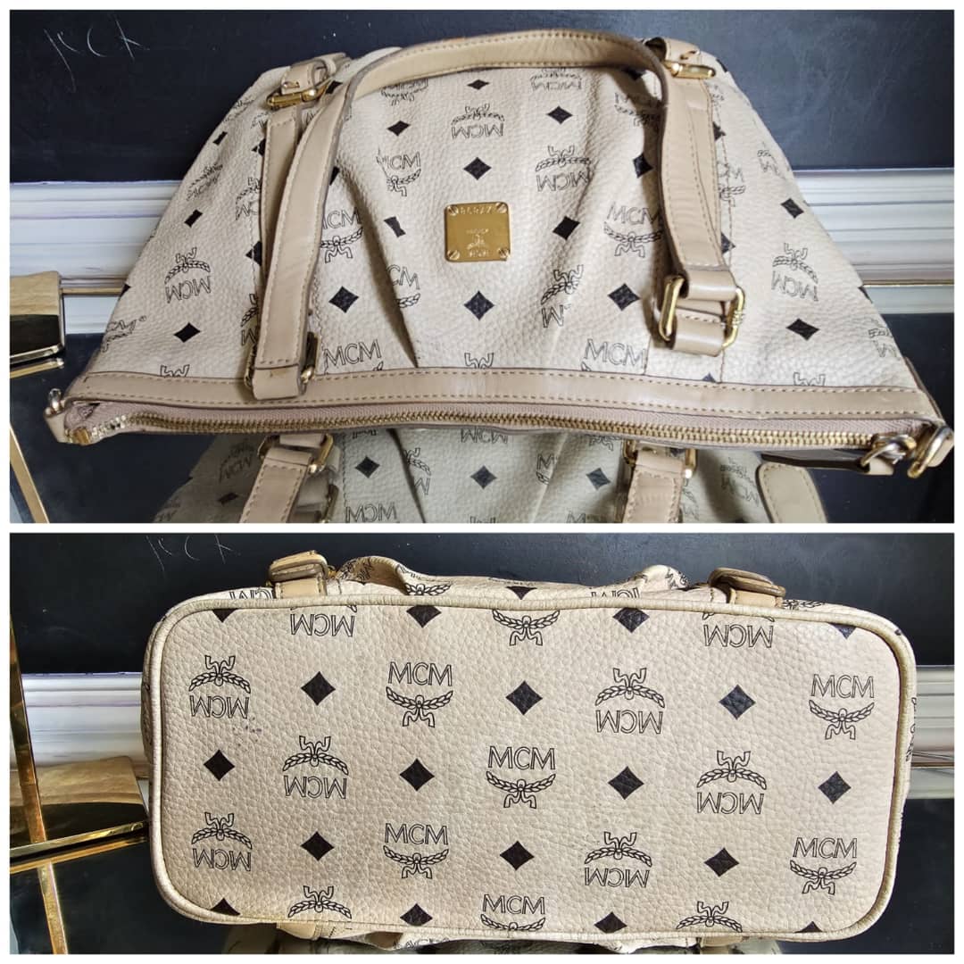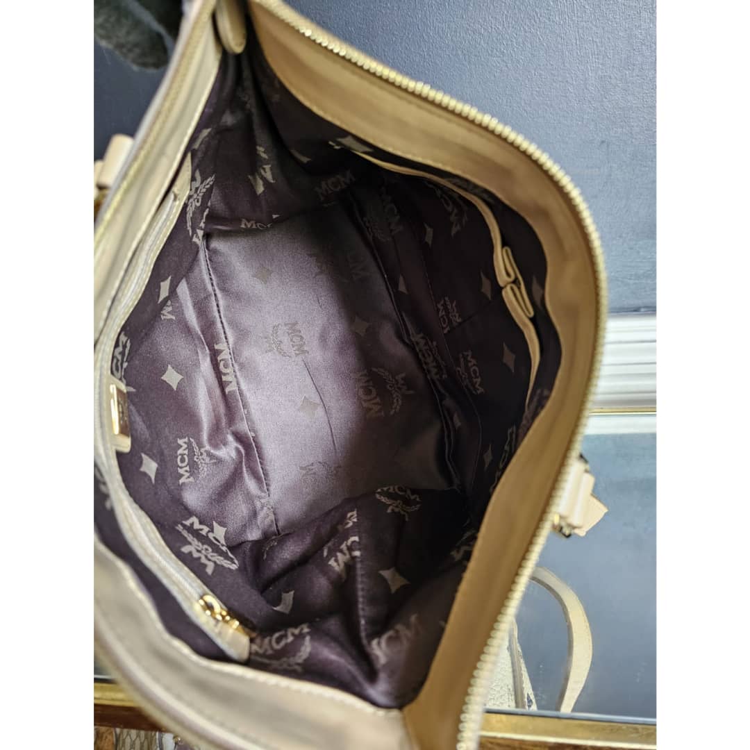 This authentic MCM Visetos Leather Bag Black/Beige is in it’s good pre-owned condition. The exterior leather is clean and beautiful. Interior is clean. Gold hardware,shows little scratches. No long shoulder strap. I will add a chain strap