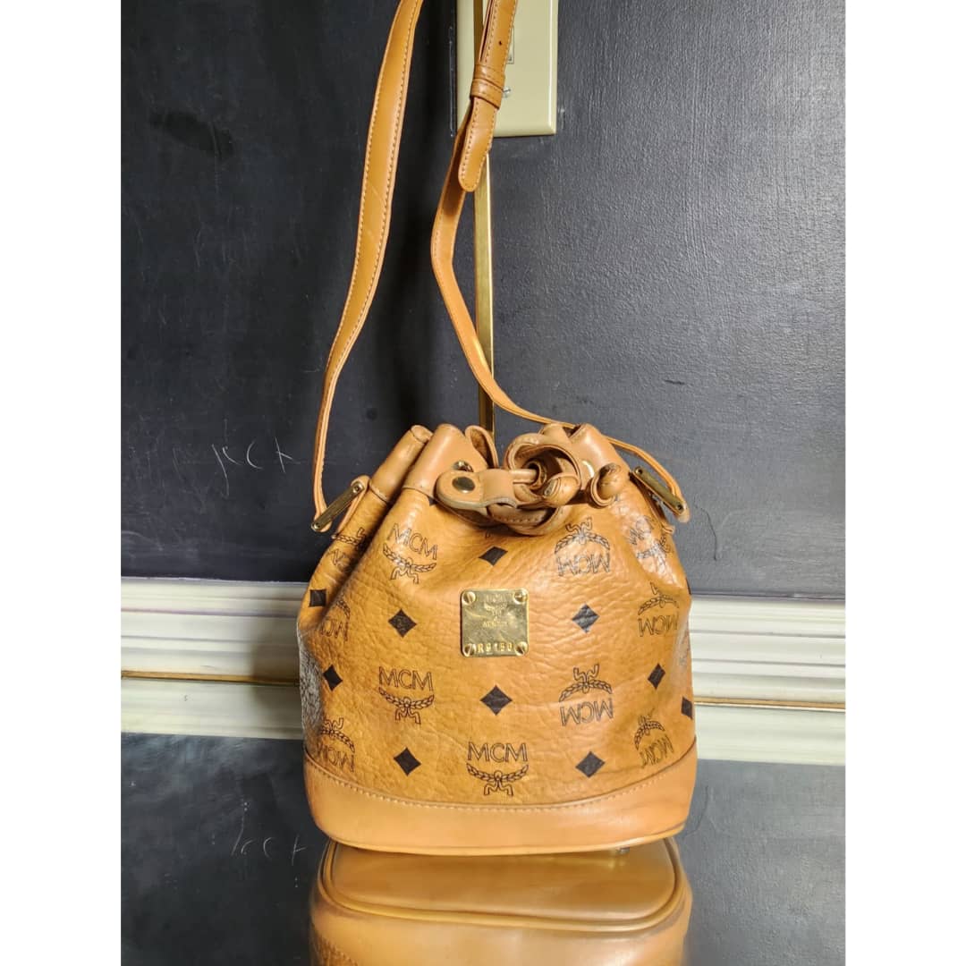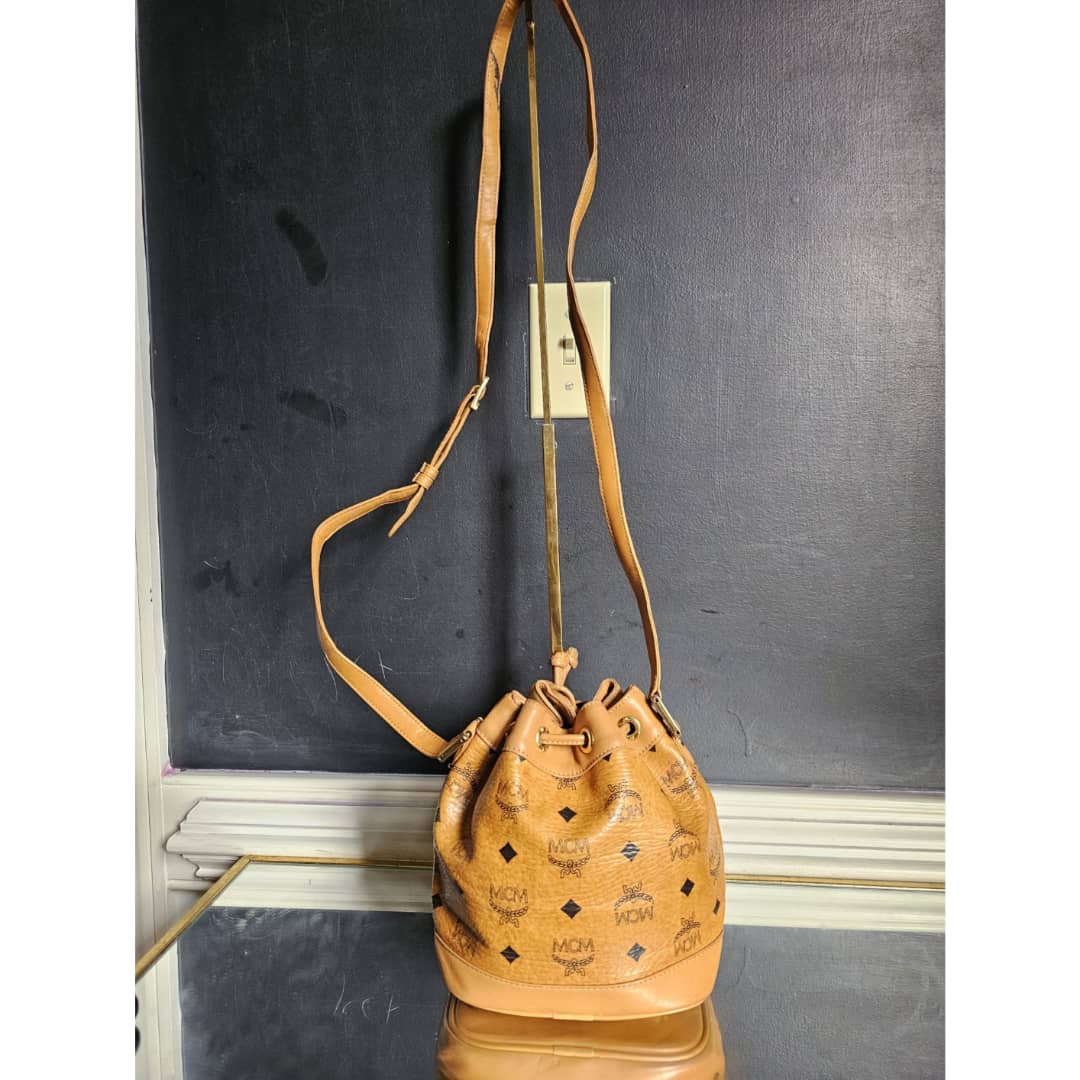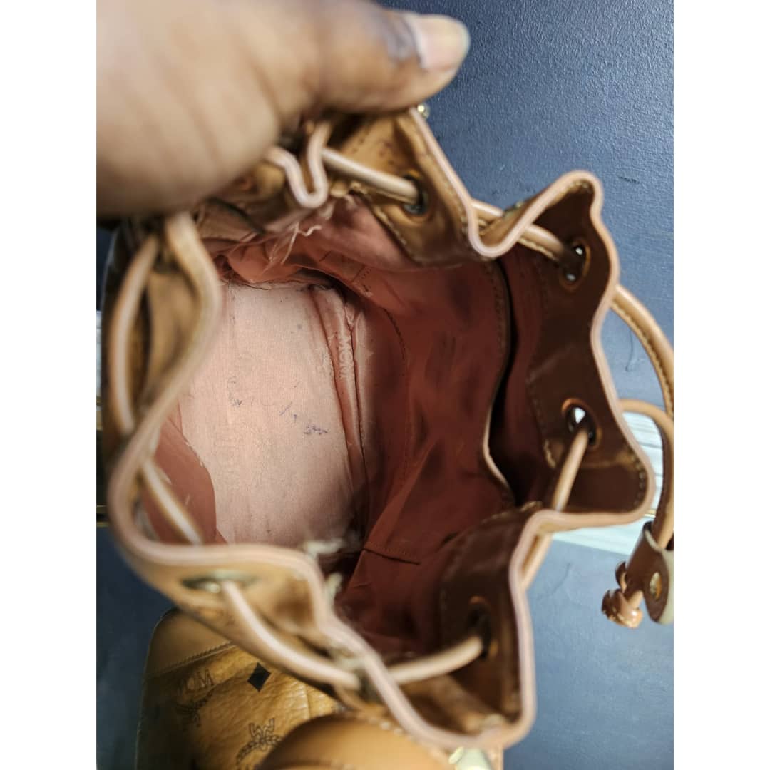 This authentic MCM Brown Visetos Leather Drawstring Bucket Bag is in it’s good pre-owned condition. The exterior leather is clean and beautiful. Some scratches on the base edges. Interior is clean. Gold hardware.