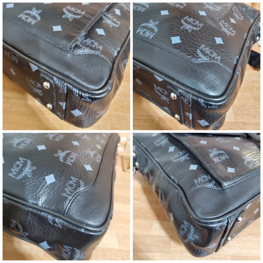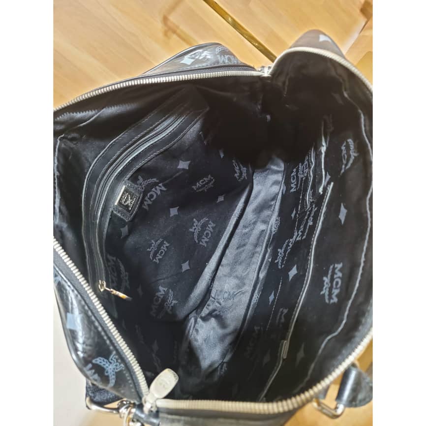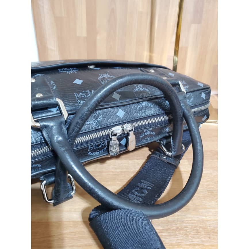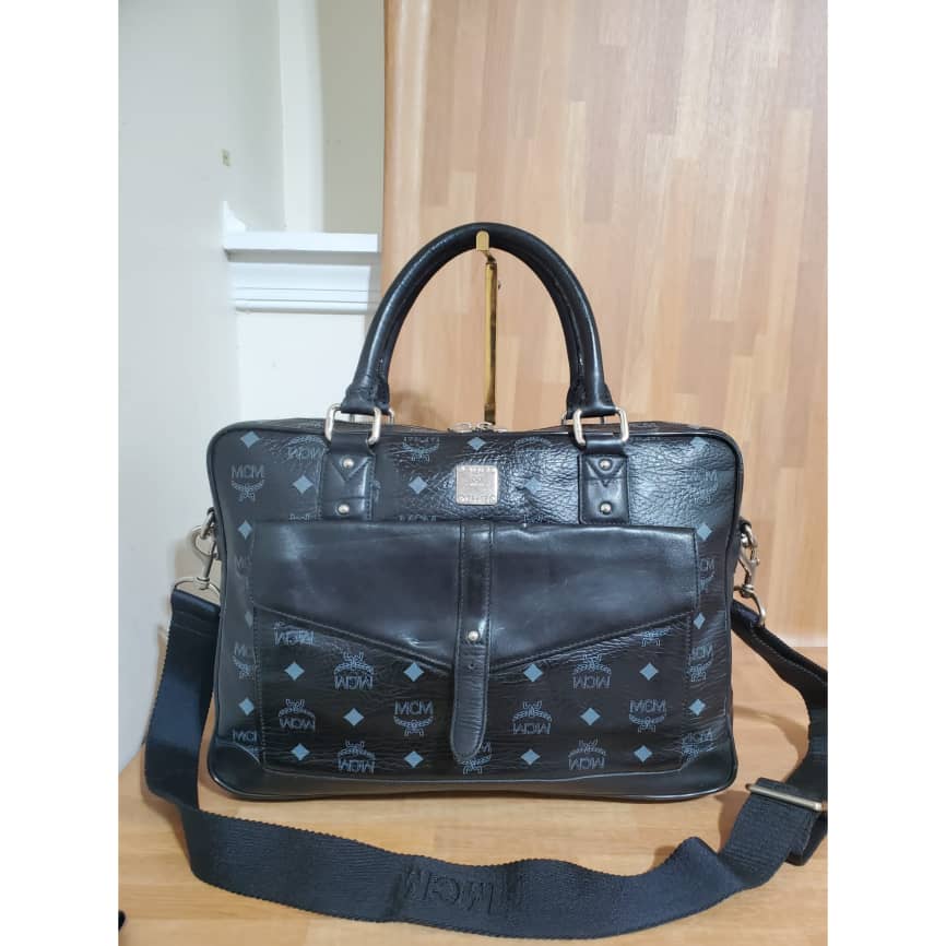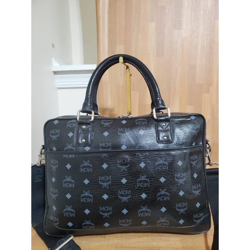 This authentic Mcm Visetos Black Leather Laptop Bag is in it’s pre-owned condition.has sign of use. The exterior coated canvas is clean and beautiful. Interior is excellent. Great work bag. Had a Shoulder strap.