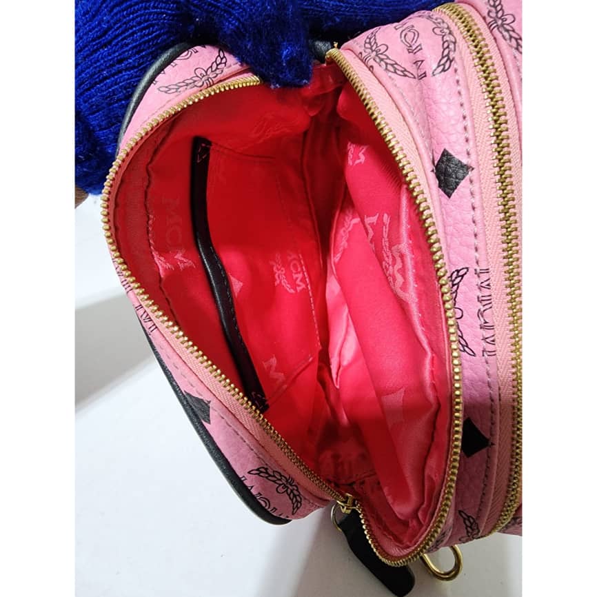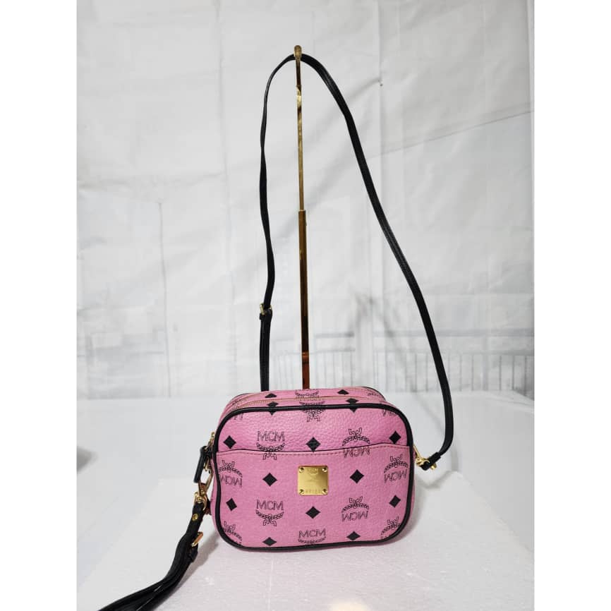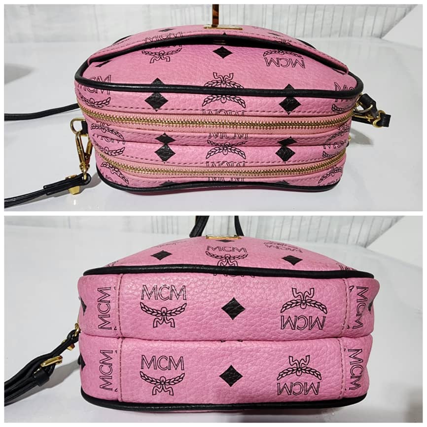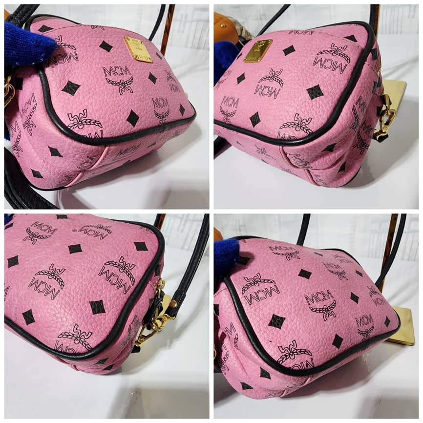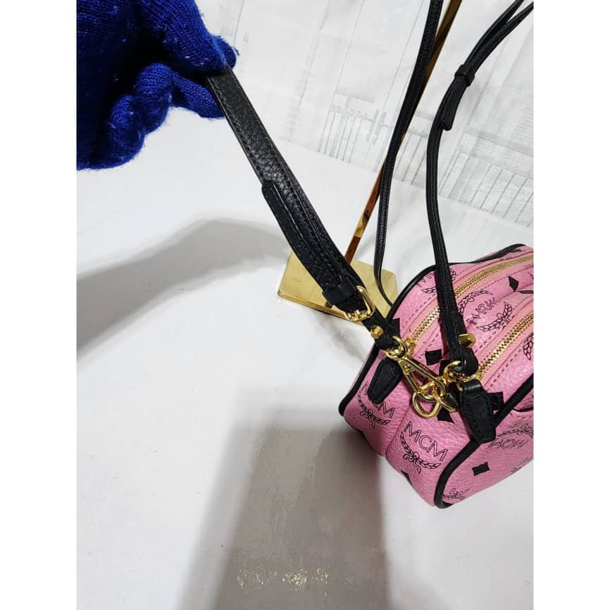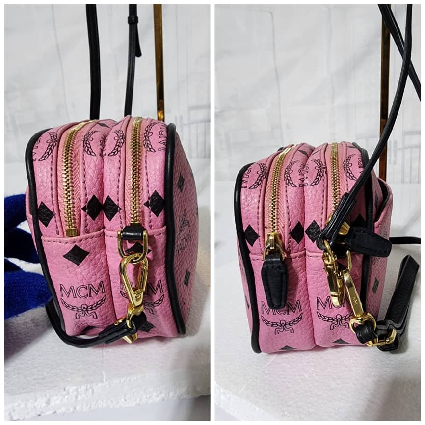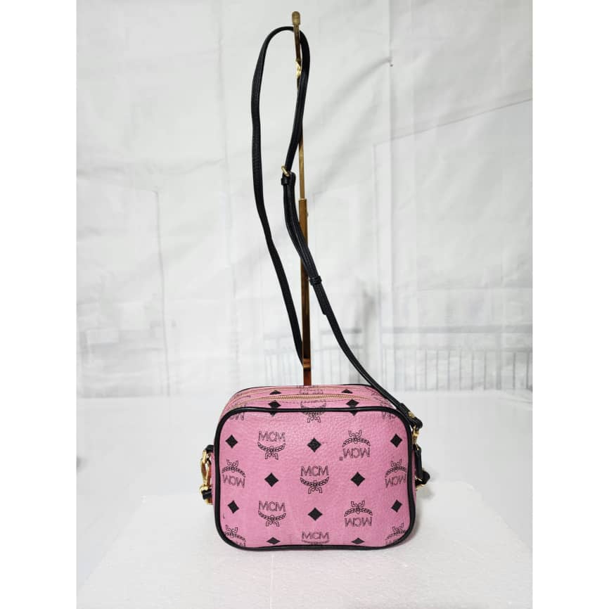 This authentic MCM Visetos Mini Camera Crossbody Bag Pink/Black is in it’s good pre-owned condition. The exterior is clean and beautiful. Interior is clean. It can be worn as a crossbody or shoulder bag. It can also be worn as a wristlet.