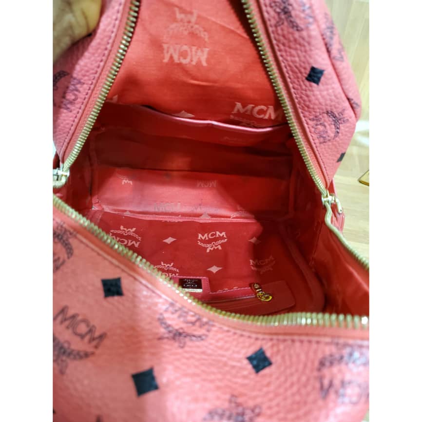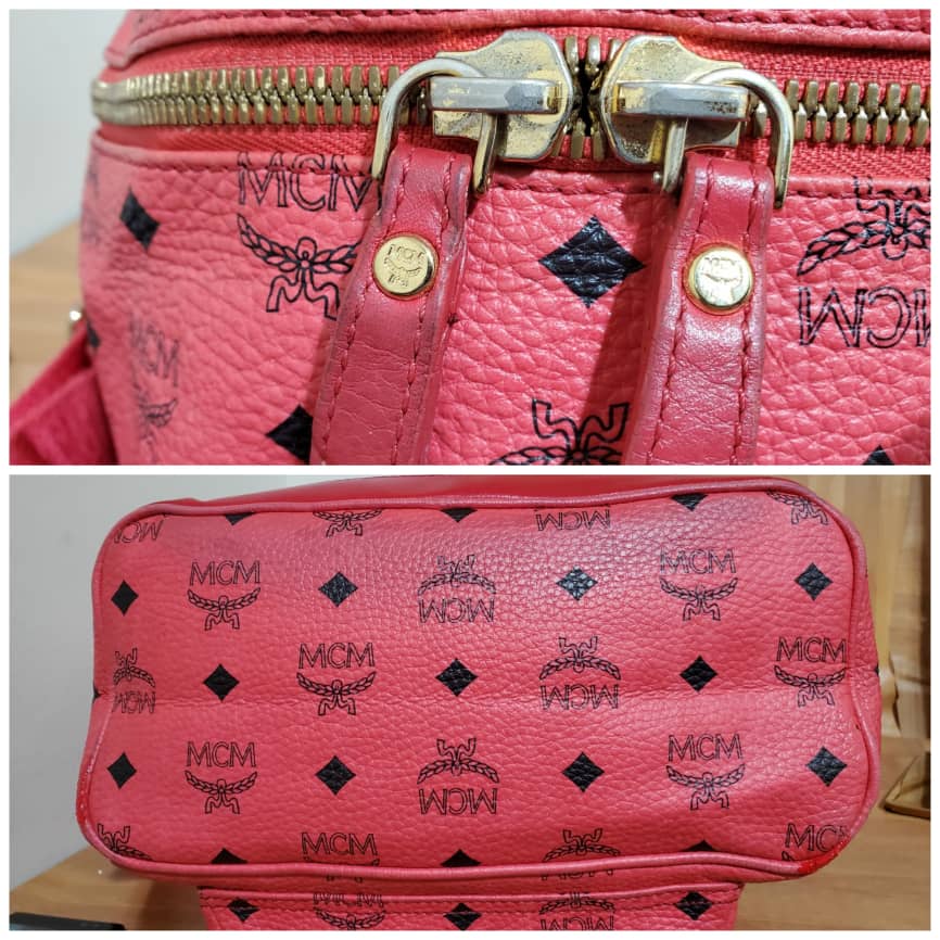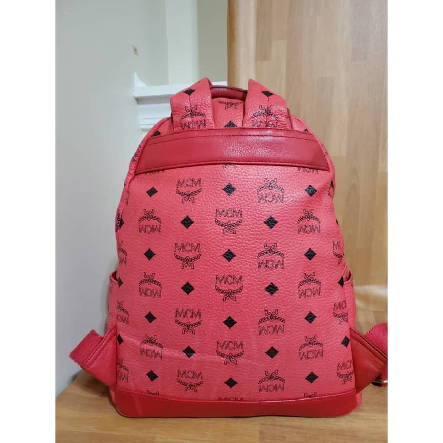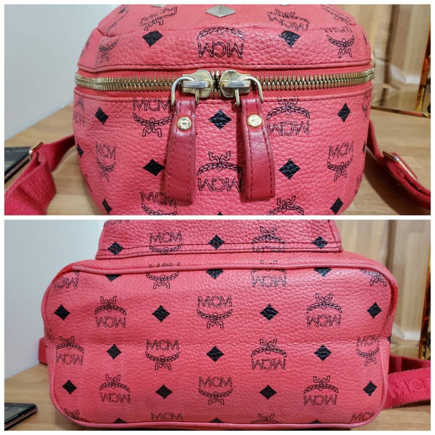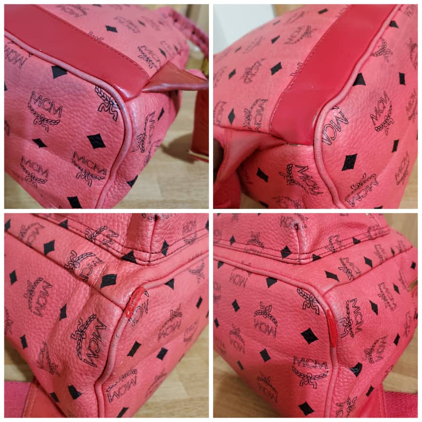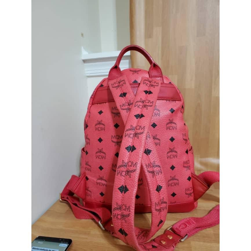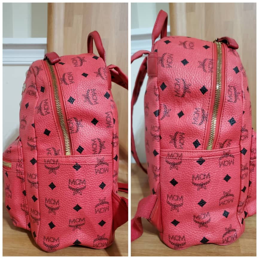 This authentic MCM Visetos Pink Stark Backpack Gold Studs. Small Backpack is in good preowned condition. Has sign of use. The exterior Visetos Canvas leather is clean and beautiful. The interior is clean. The edges show a little scuff. The hardware shows little rubbing.