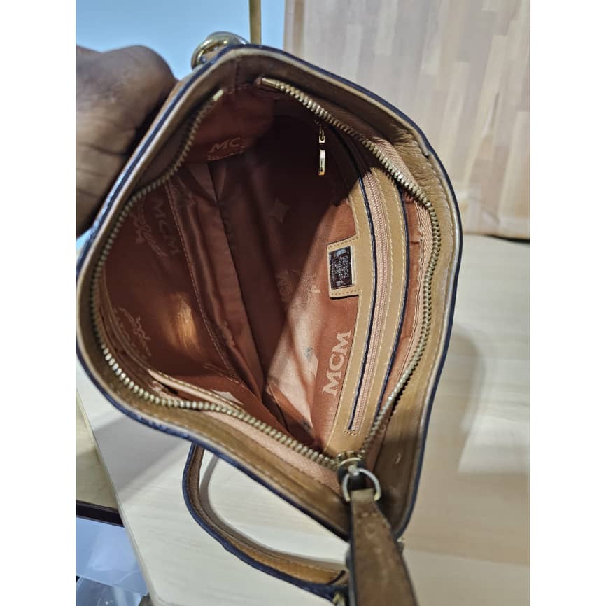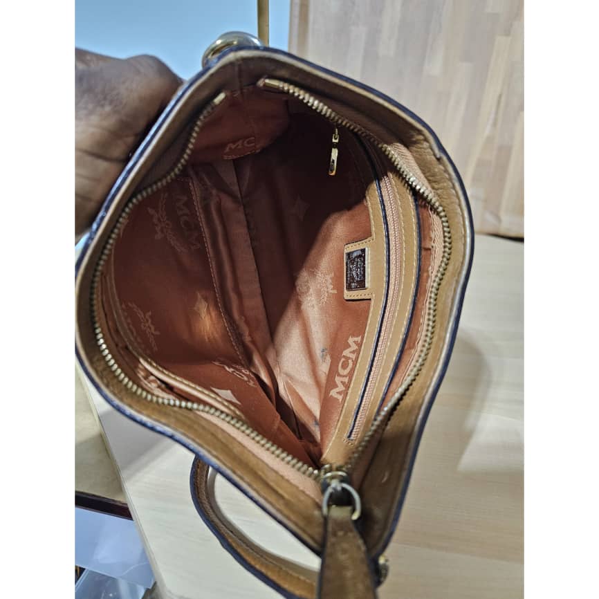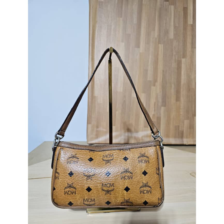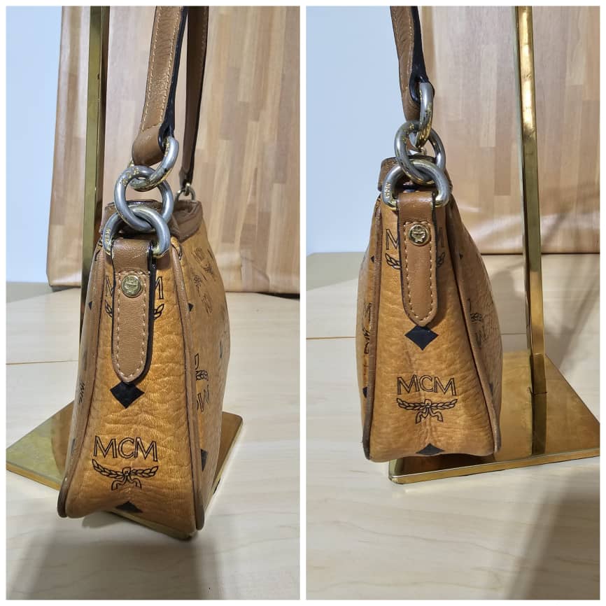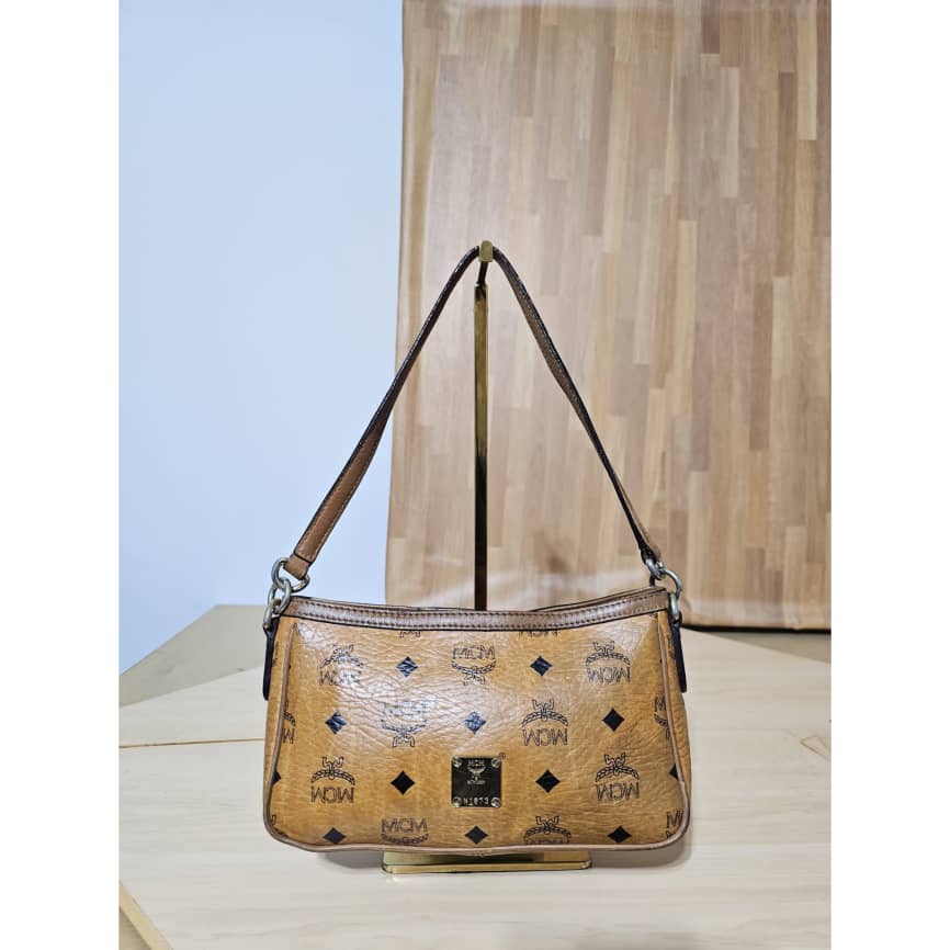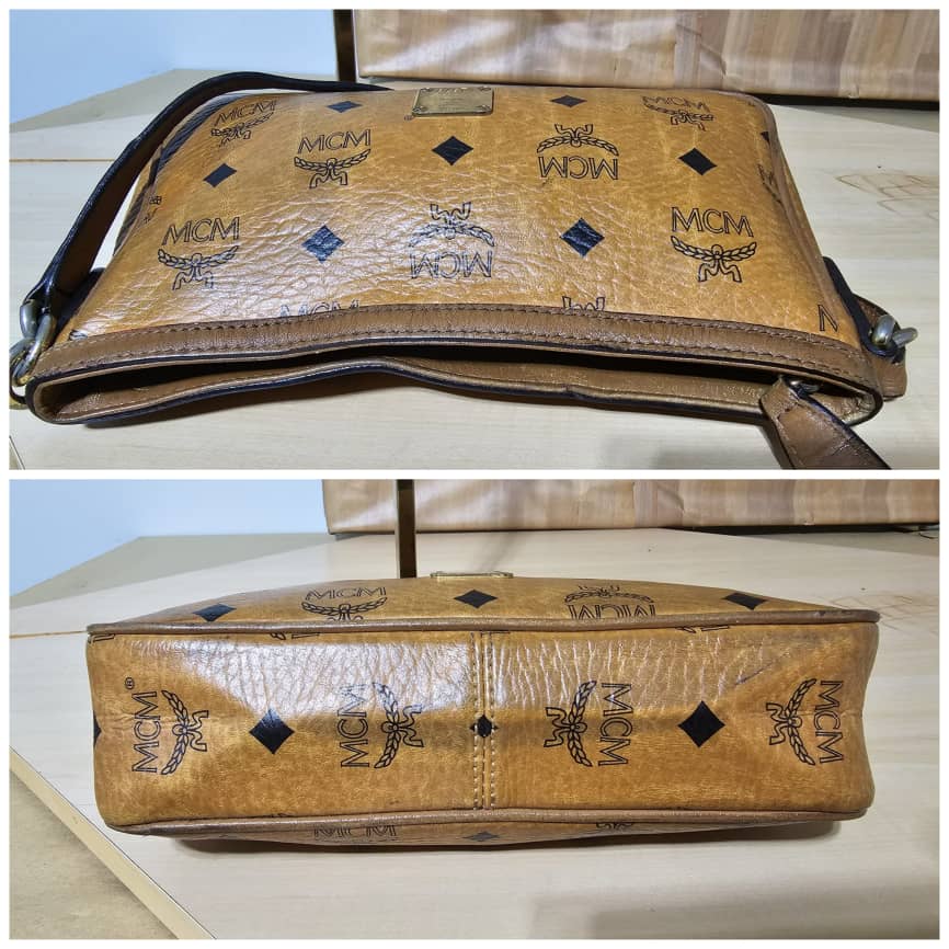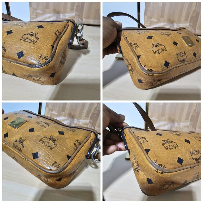This authentic MCM VISETOS POCHETTE SHOULDER BAG COGNAC is in it’s good pre-owned condition. The exterior is clean and beautiful, the interior is clean. The gold hardware and base edges shows rubbing.