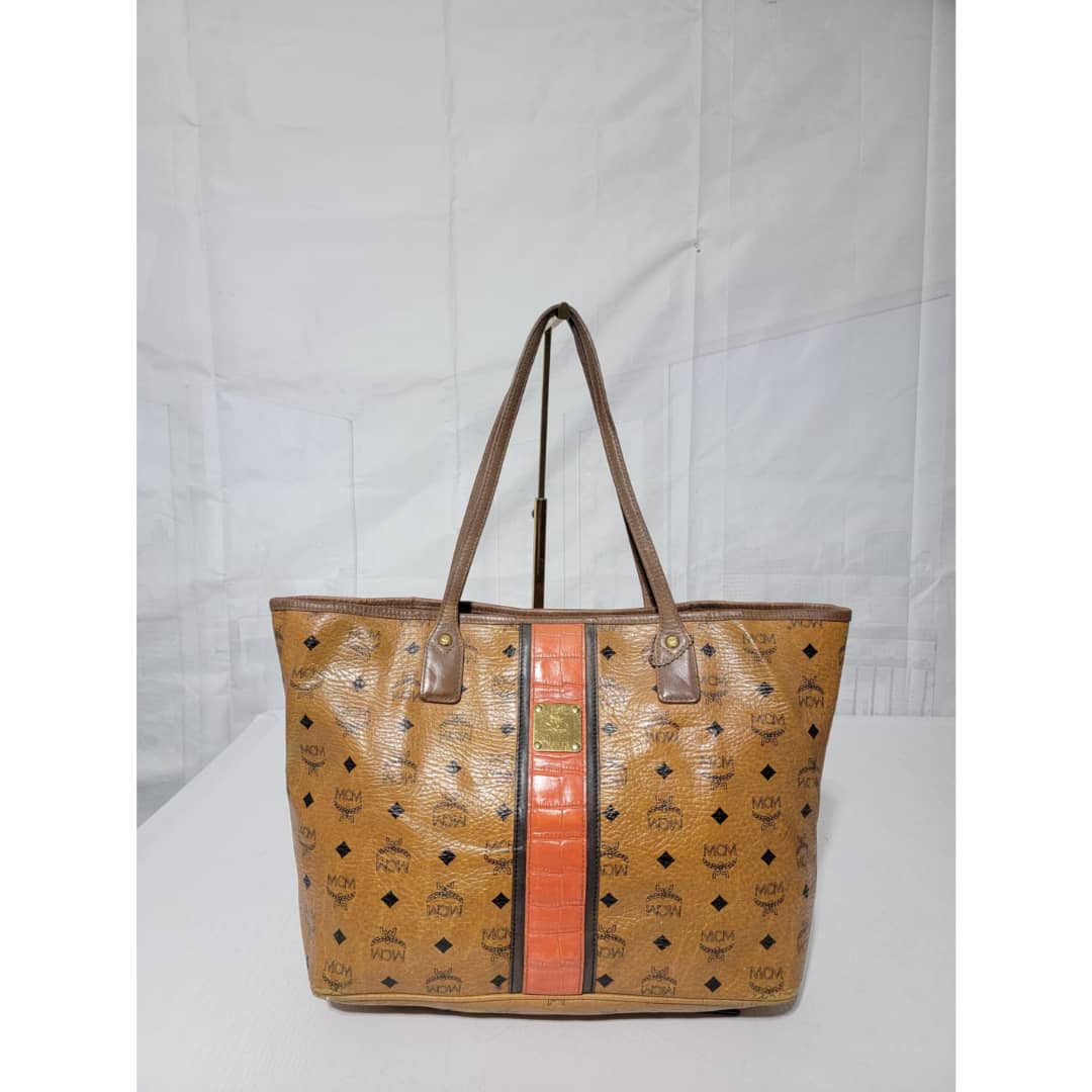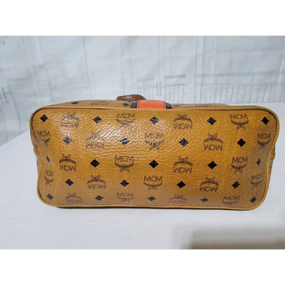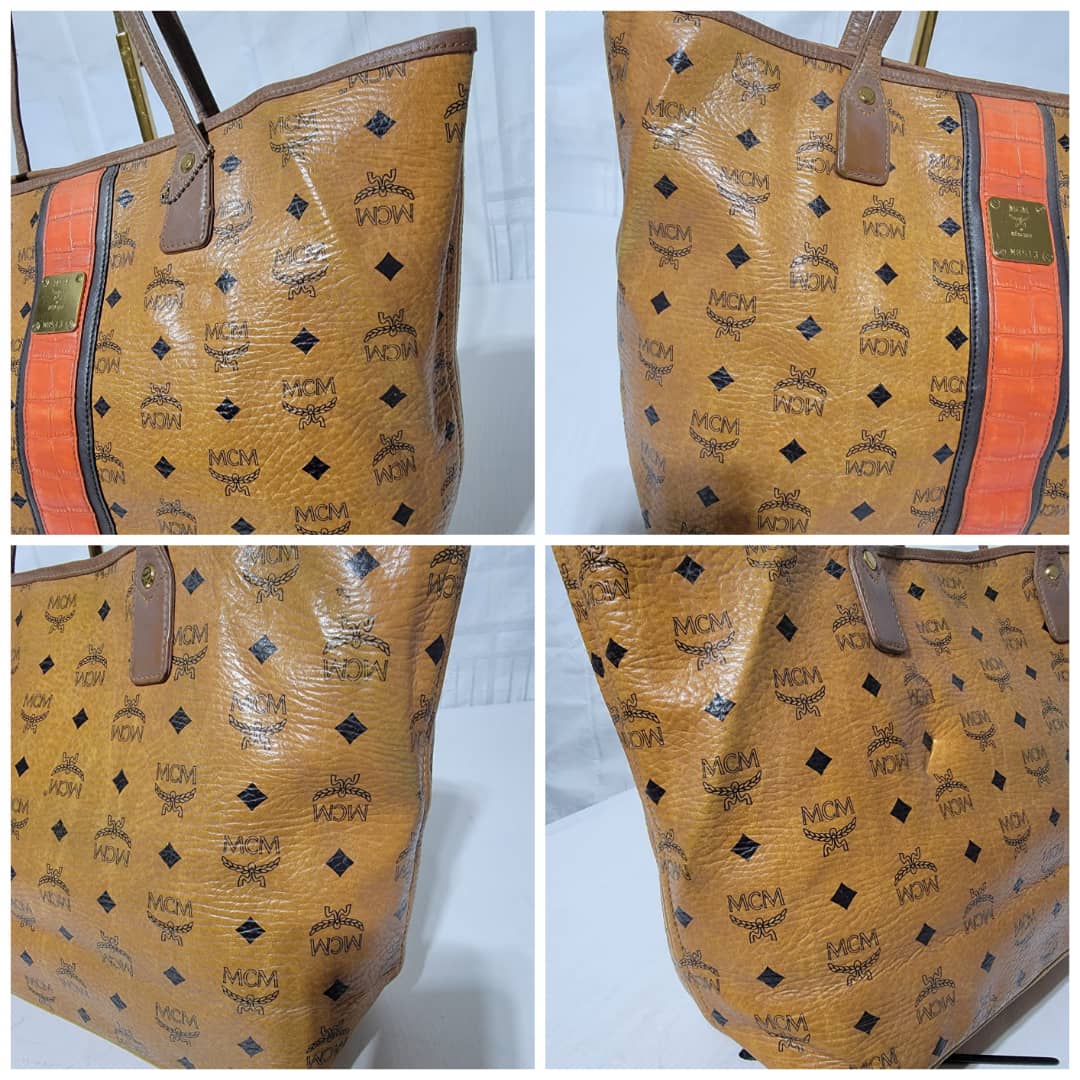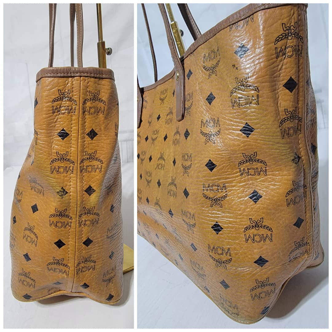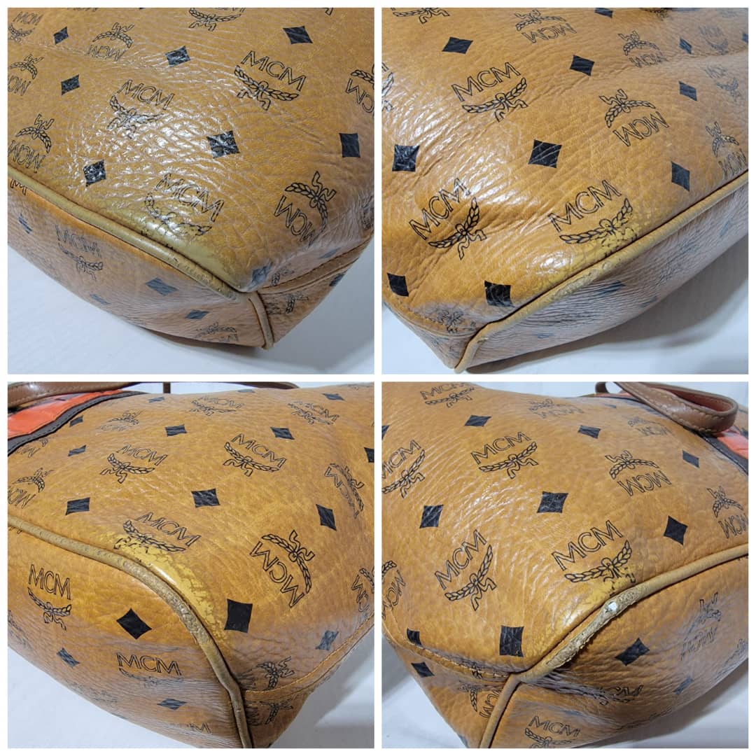 This authentic MCM TOP ZIP SHOPPER BAG COGNAC STRIPE SHOULDER BAG is in it’s good pre-owned condition. The exterior cognac leather is clean and beautiful. The sides of the bag shows very little slight discoloration, it is not obvious (Kindly look at pictures above). The leather trim that runs across the bag and handles shows scratches. The base edges shows scratches. Interior is clean. Gold hardware.