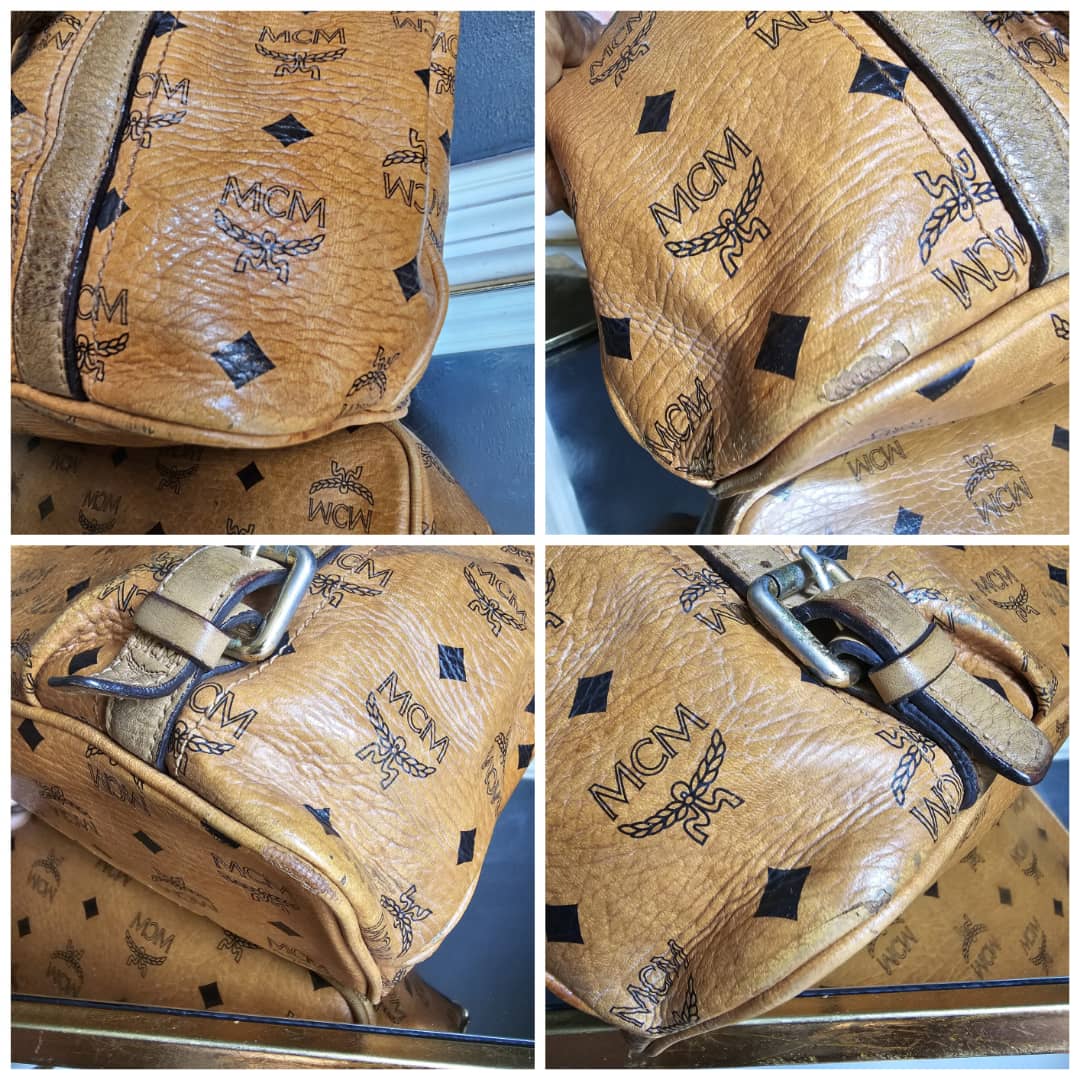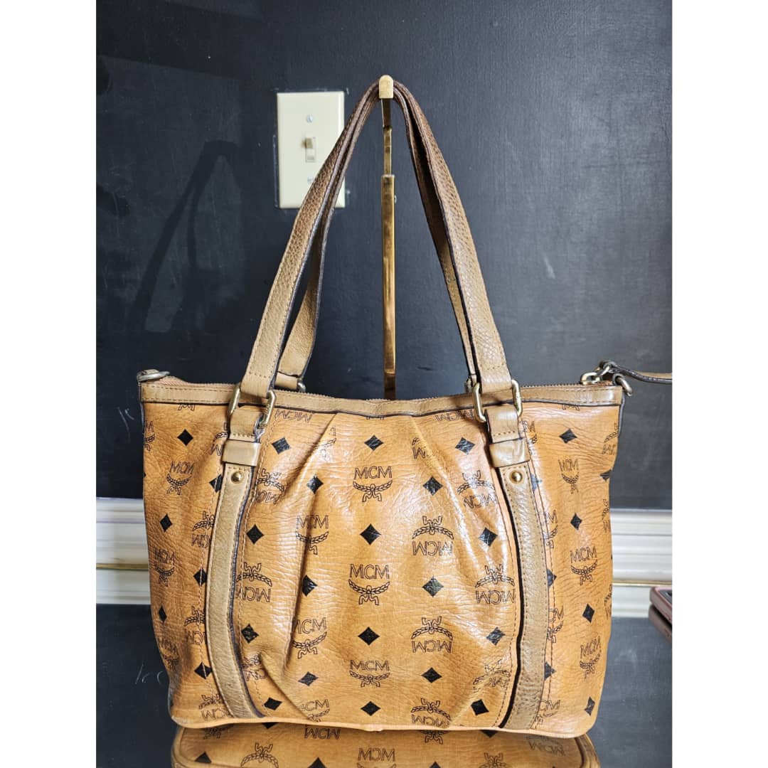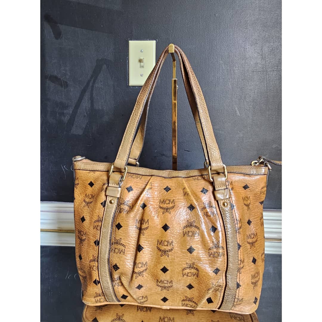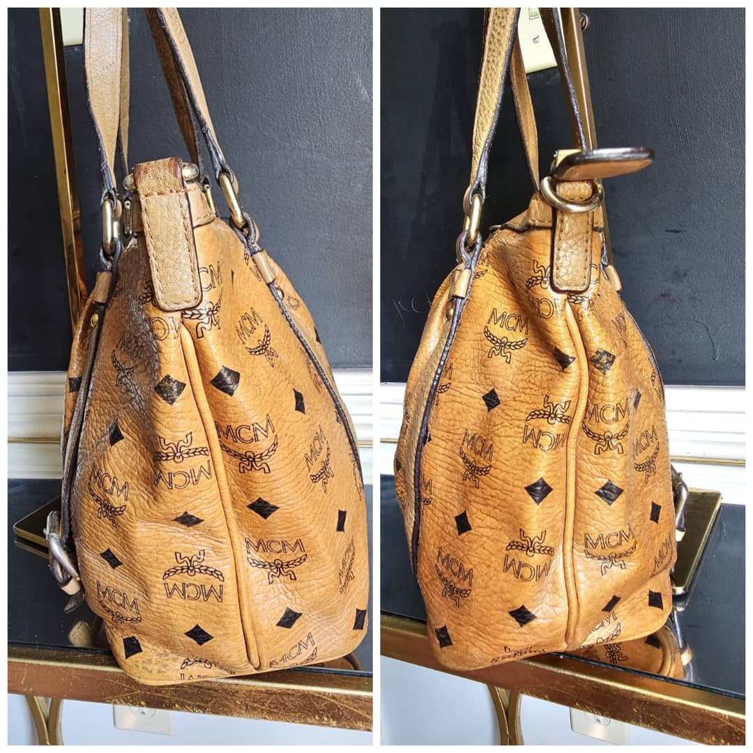 This authentic MCM Visetos Small PVC Cognac Leather Brown is in it’s good pre-owned condition. The exterior leather is clean and beautiful, the front exterior shows some stains below the bag (Kindly review pictures above). Interior is clean. The brown leather trim that runs across the bag shows wear. Handle shows little rubbing and wear. Gold hardware, shows some scratches. No long strap.