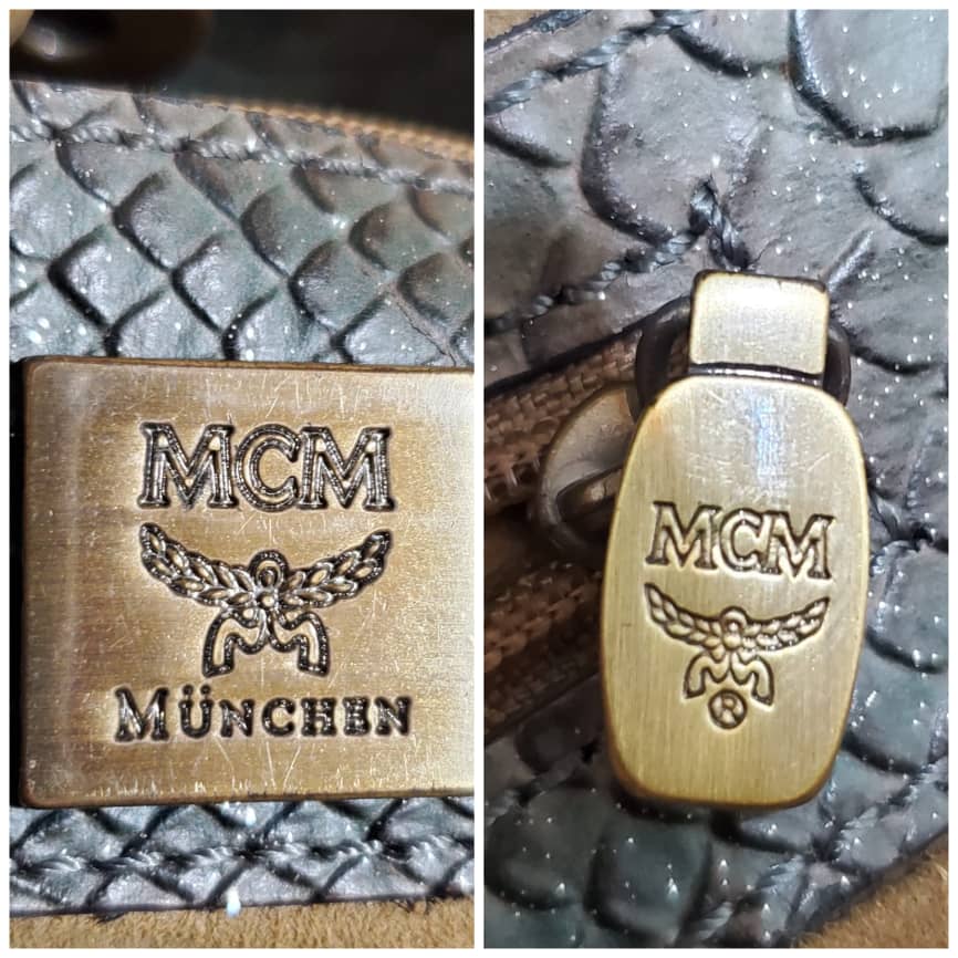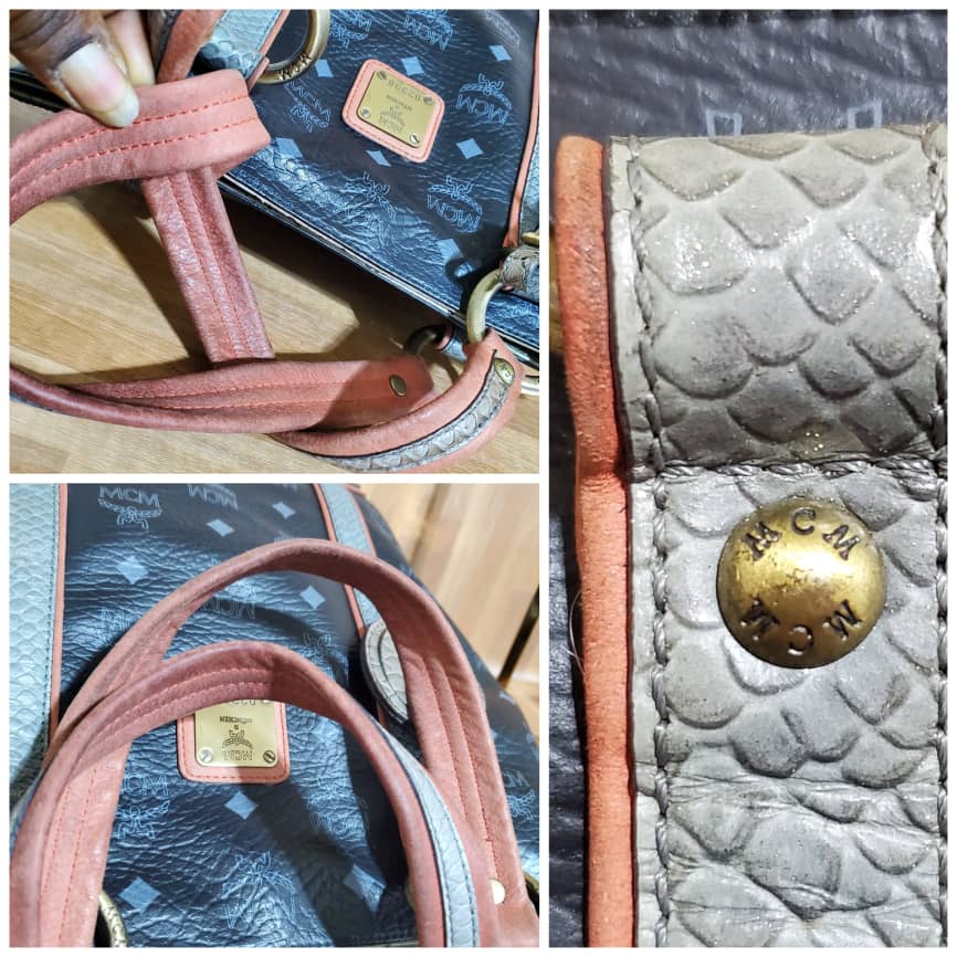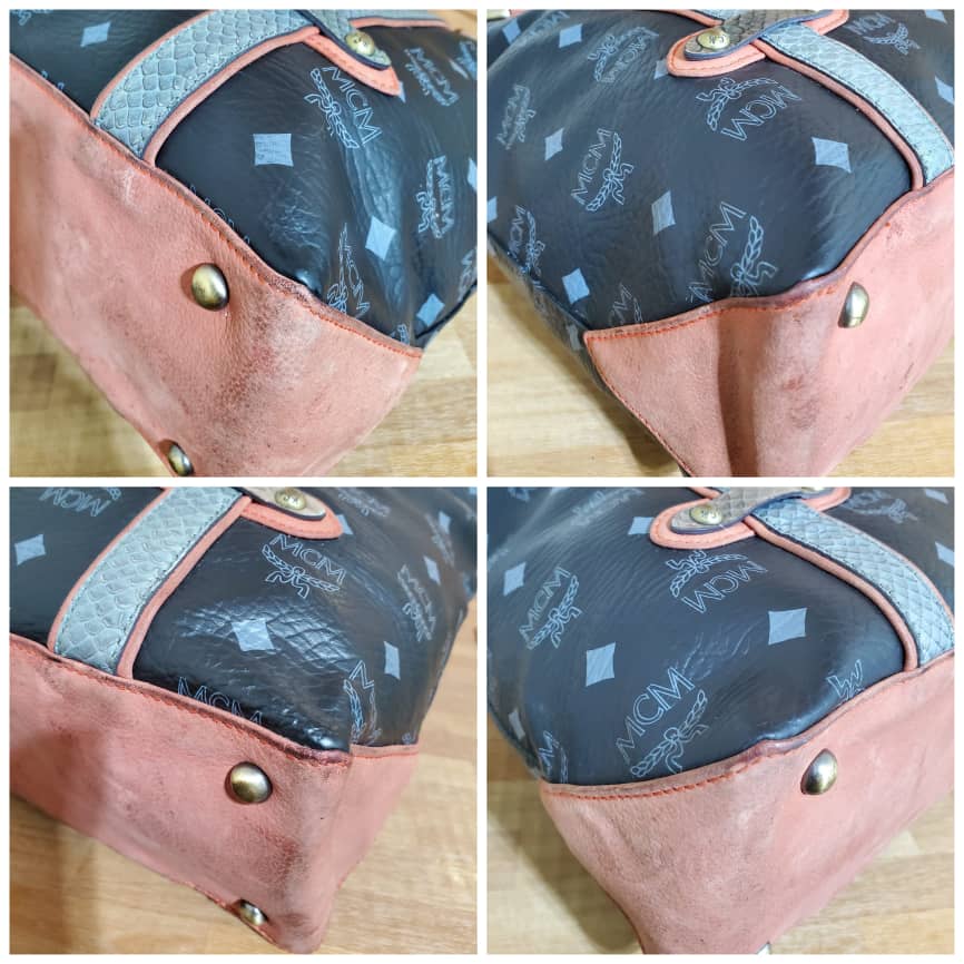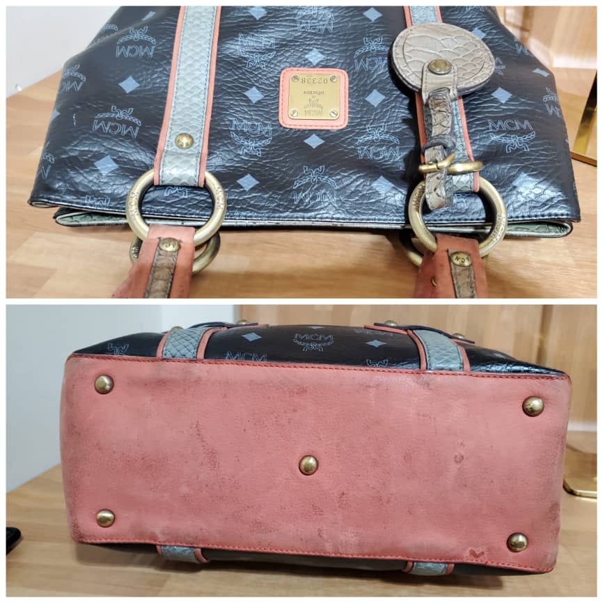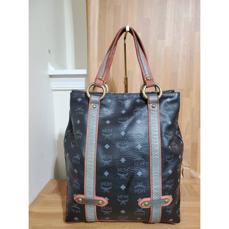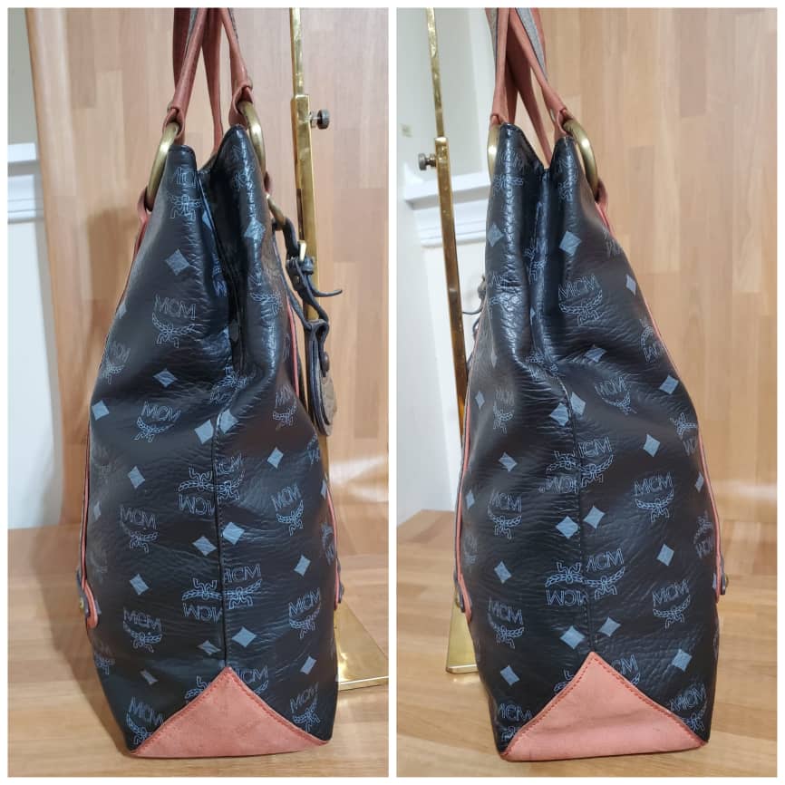 This authentic Mcm Visetos strip Long Tote Black, Grey, Peach, Gold hardware bag. is in its pre-owned good condition. The exterior coated canvas is clean and beautiful. Interior is clean. The base and base edges shows some slight dots wear. And handles. But good condition.