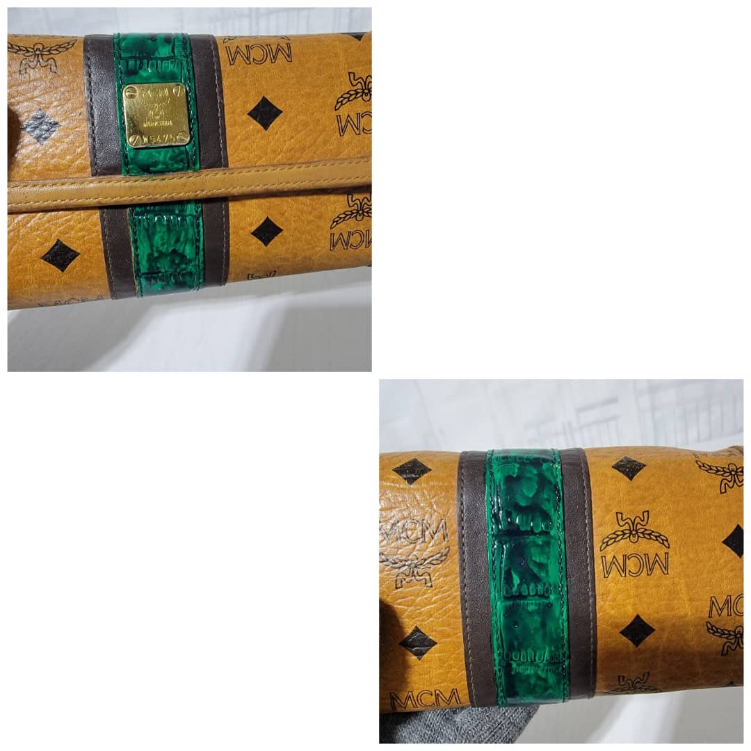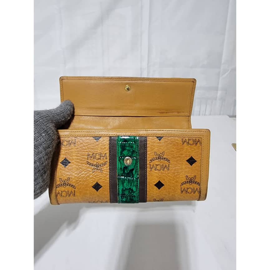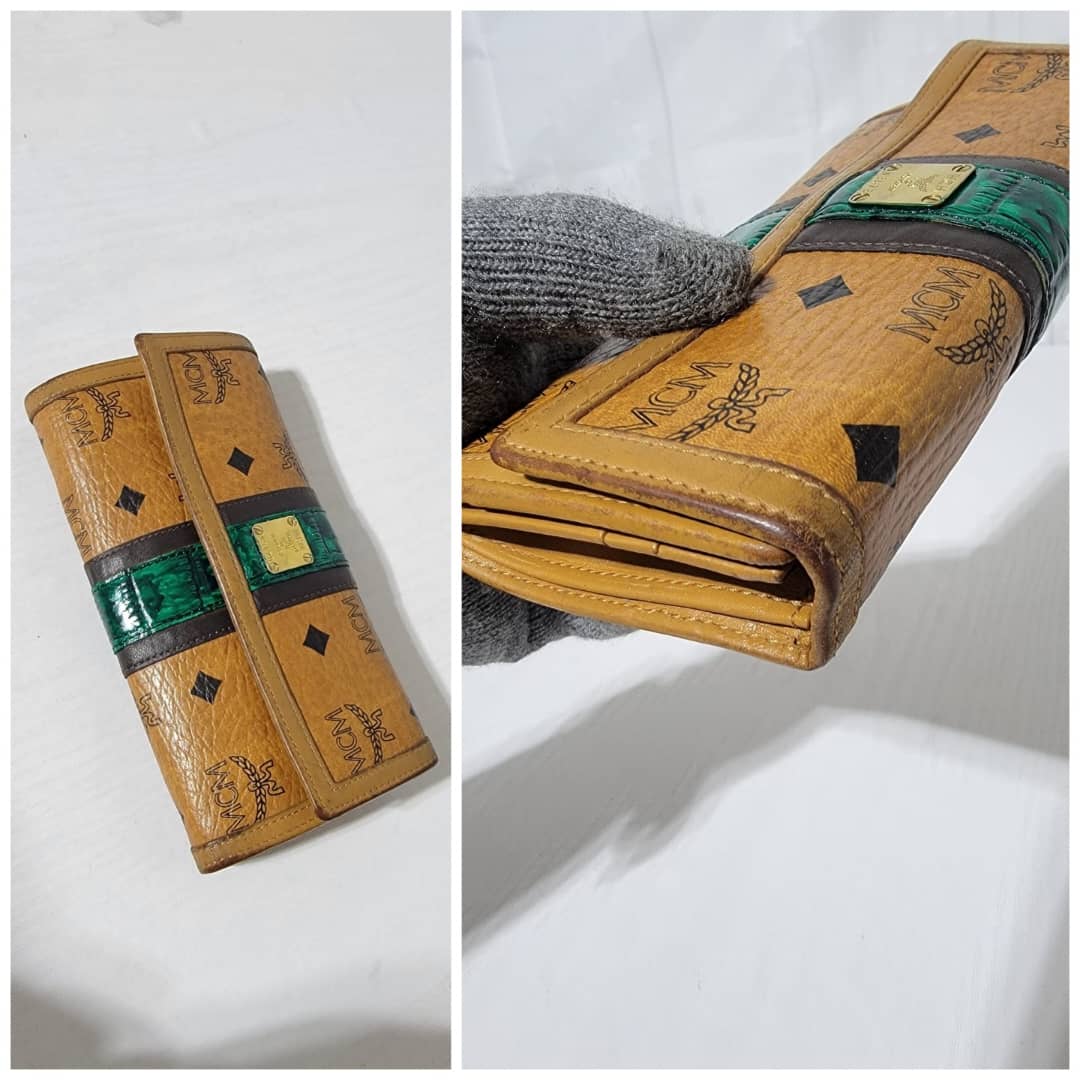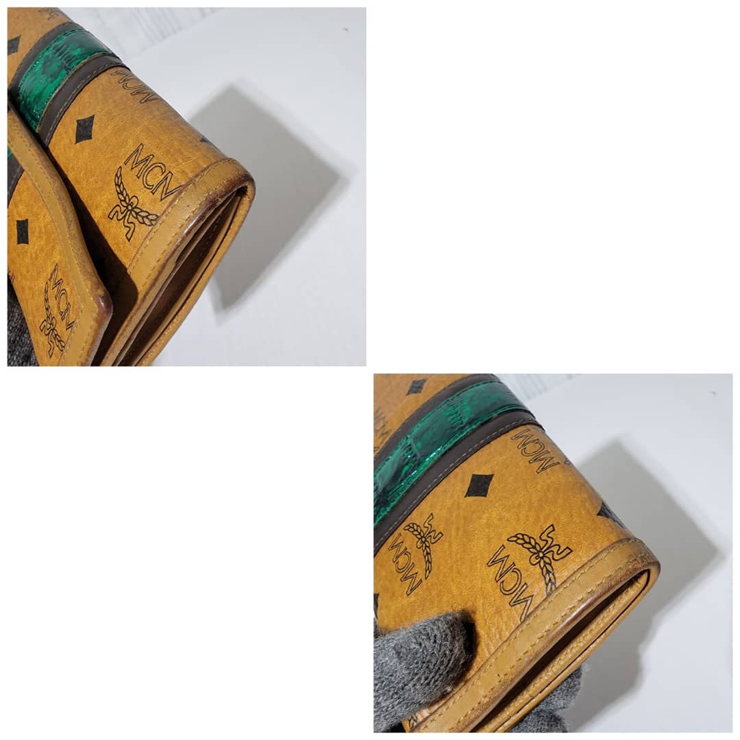 This authentic MCM visetos wallet monogram leather Green/Brown is in it’s good pre-owned condition. The exterior coated canvas is clean and beautiful. Interior is clean. The edges of the wallet shows rubbing and scuffing. The green coating trim in between the wallet was retouched however, it is in good condition.
