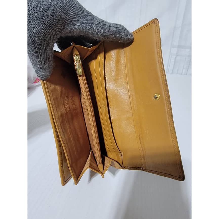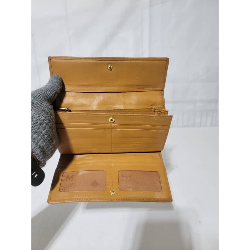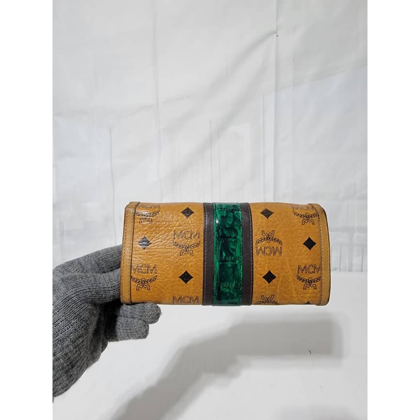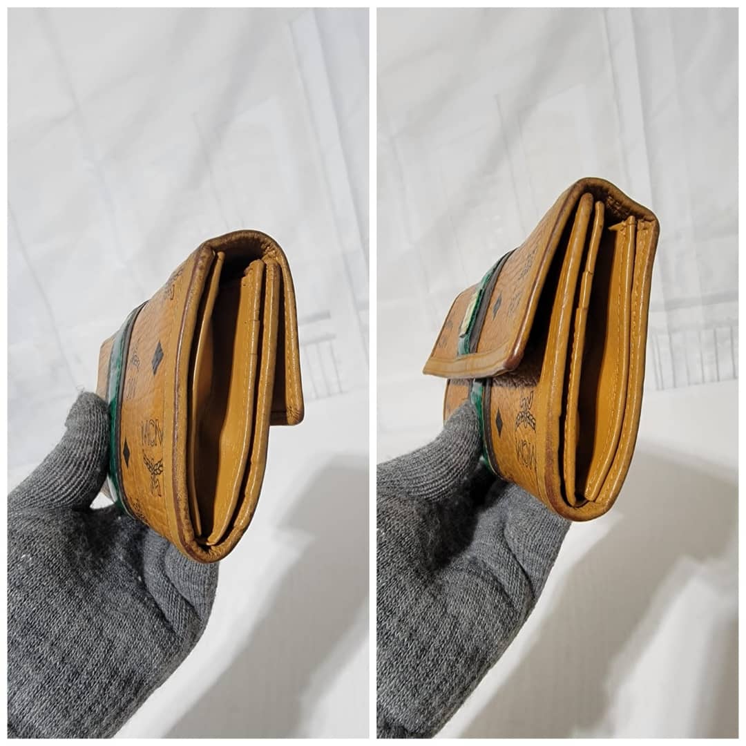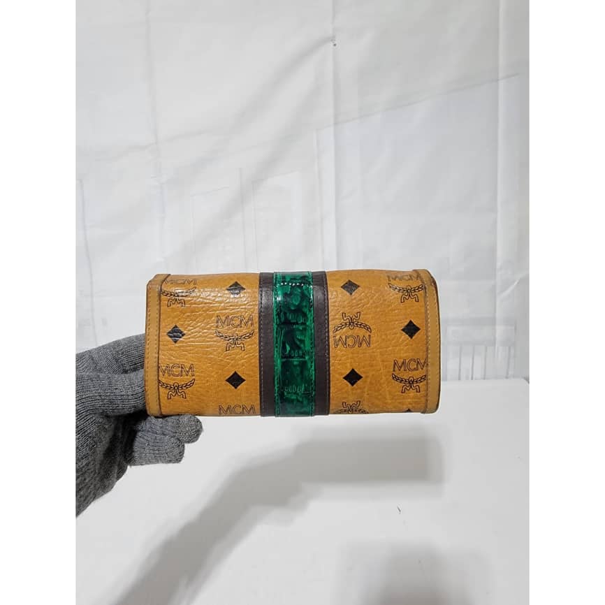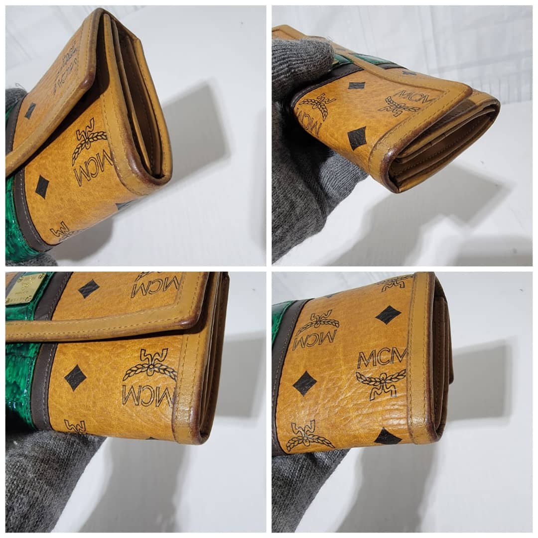 This authentic MCM visetos wallet monogram leather Green/Brown is in it’s good pre-owned condition. The exterior coated canvas is clean and beautiful. Interior is clean. The edges of the wallet shows rubbing and scuffing. The green coating trim in between the wallet was retouched however, it is in good condition.