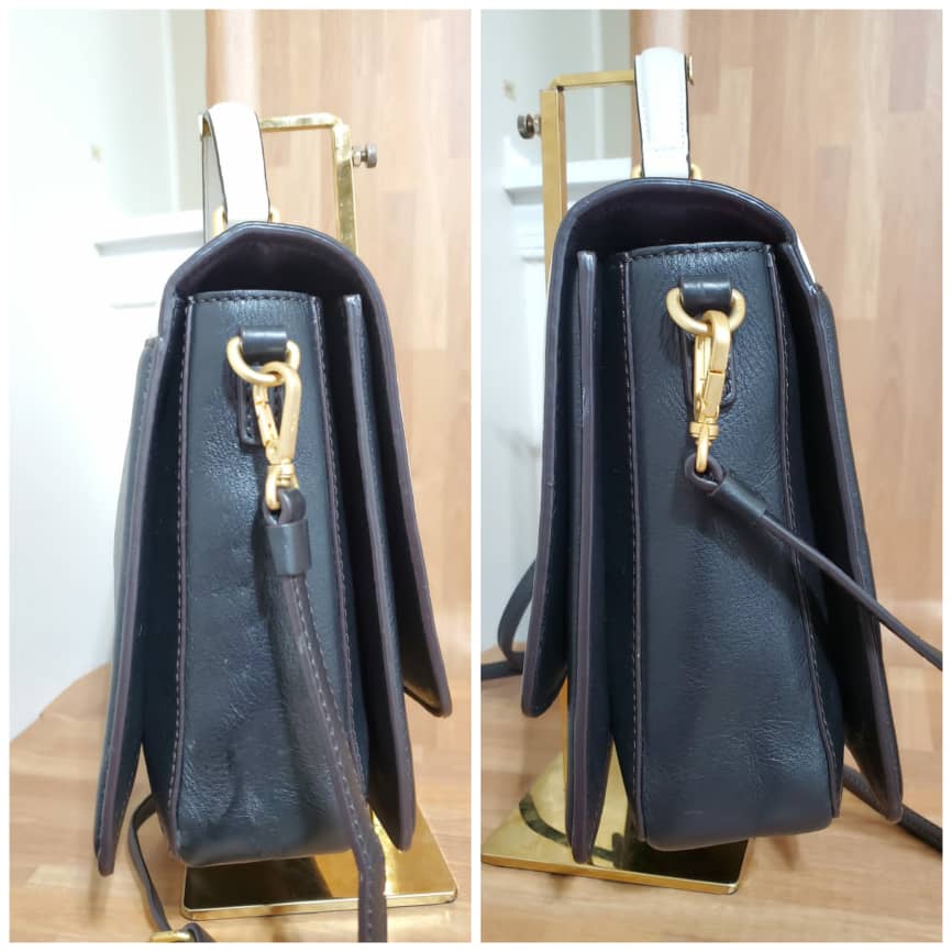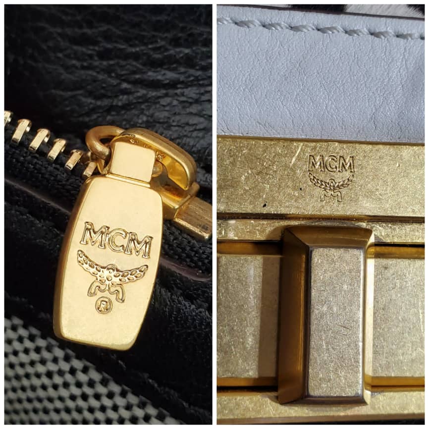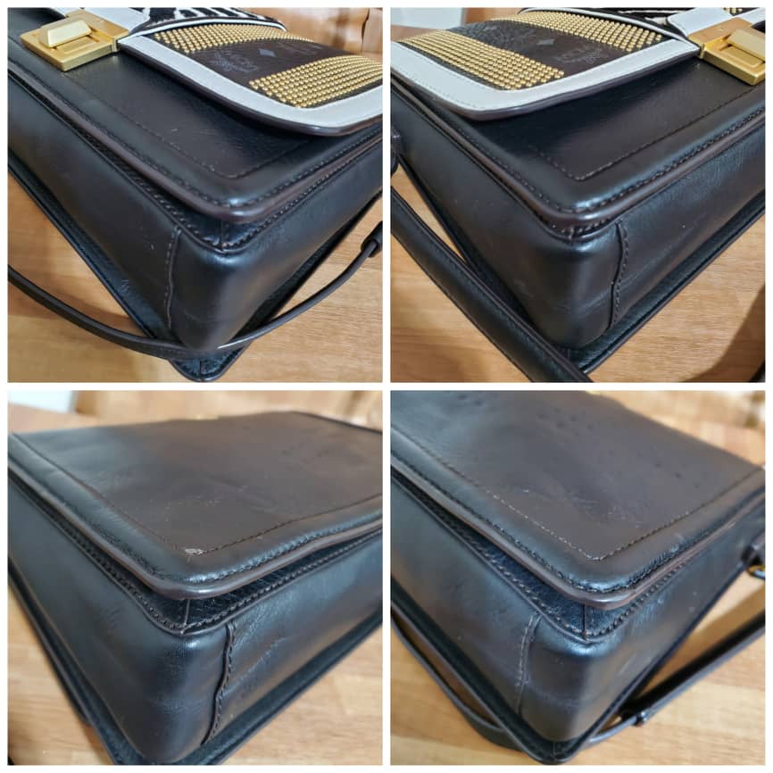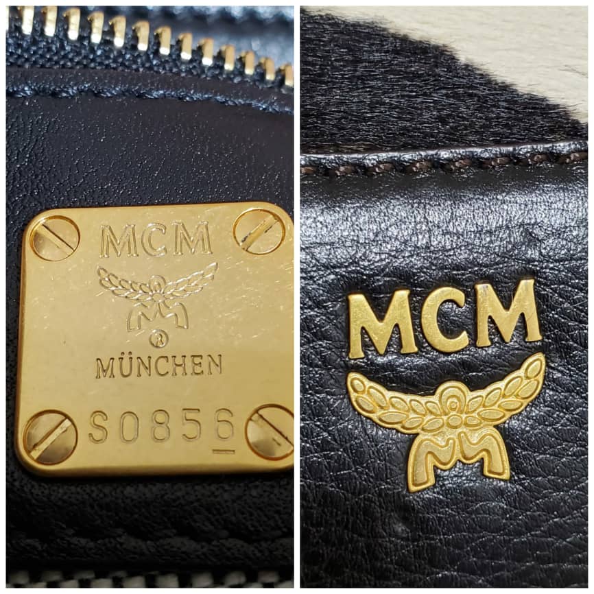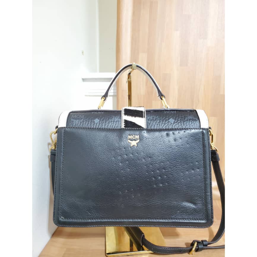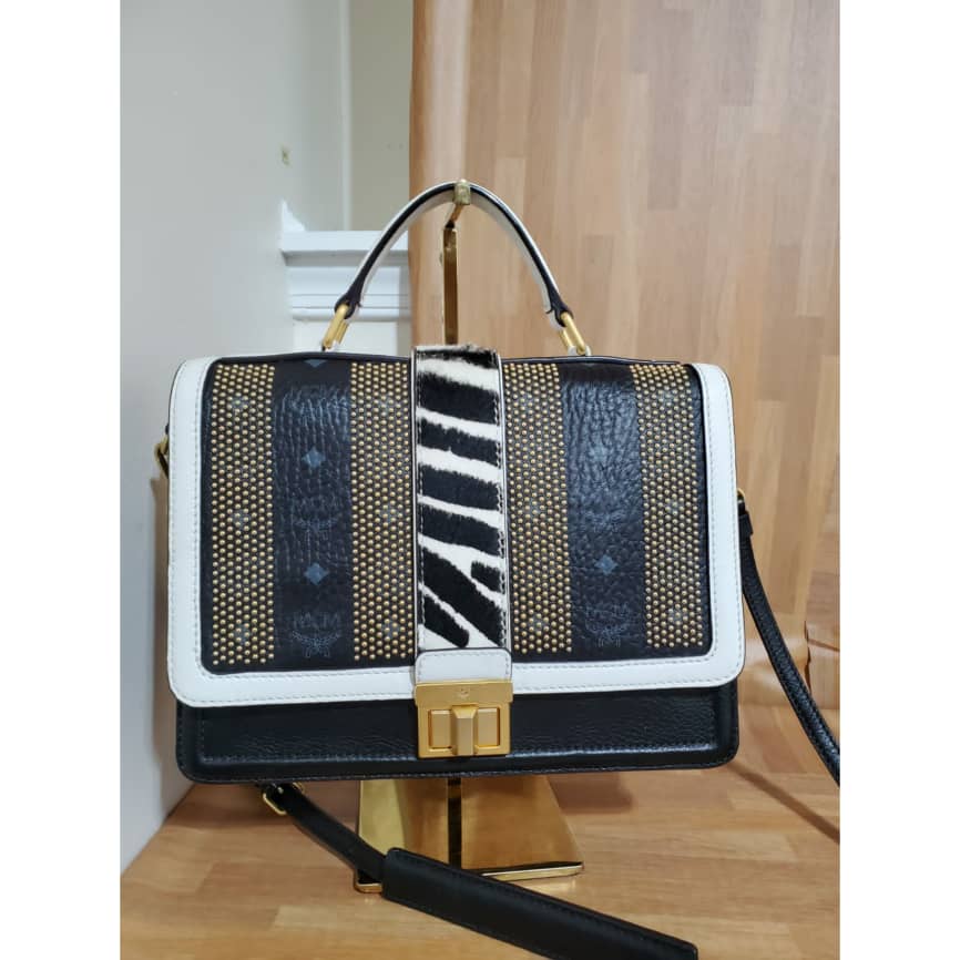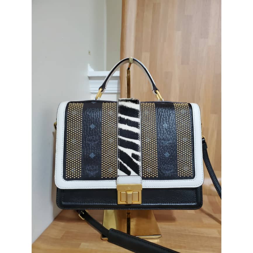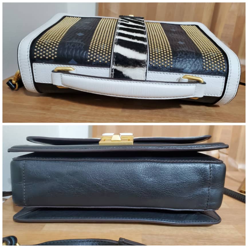 This authentic mcm visetos Zebra studded Top Handle black Monogram and leather top handle bag is in its good pre-owned condition. The exterior leather is clean and beautiful. The back of the bag is good and had a little studded indention. The interior is clean. It’s a beautiful bag
