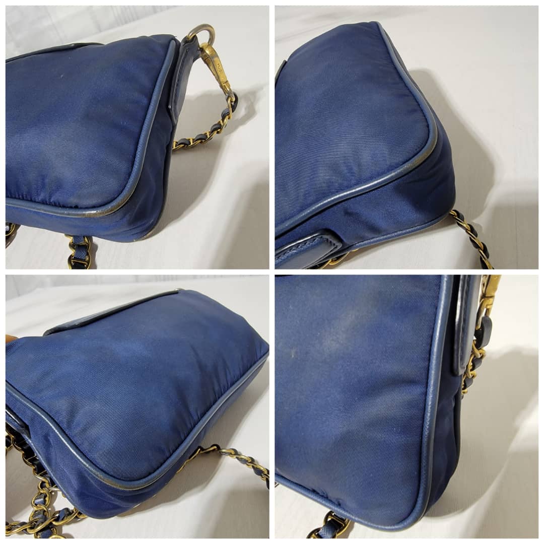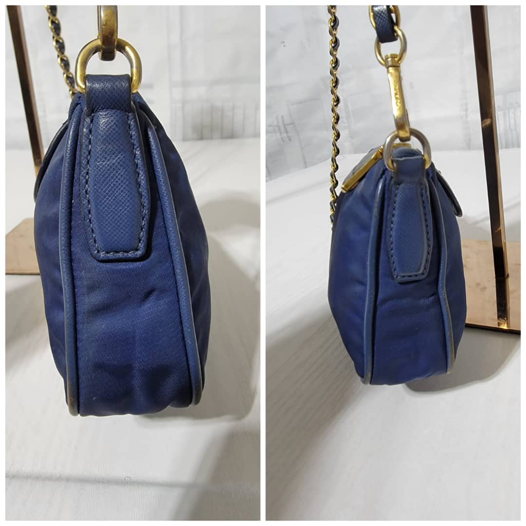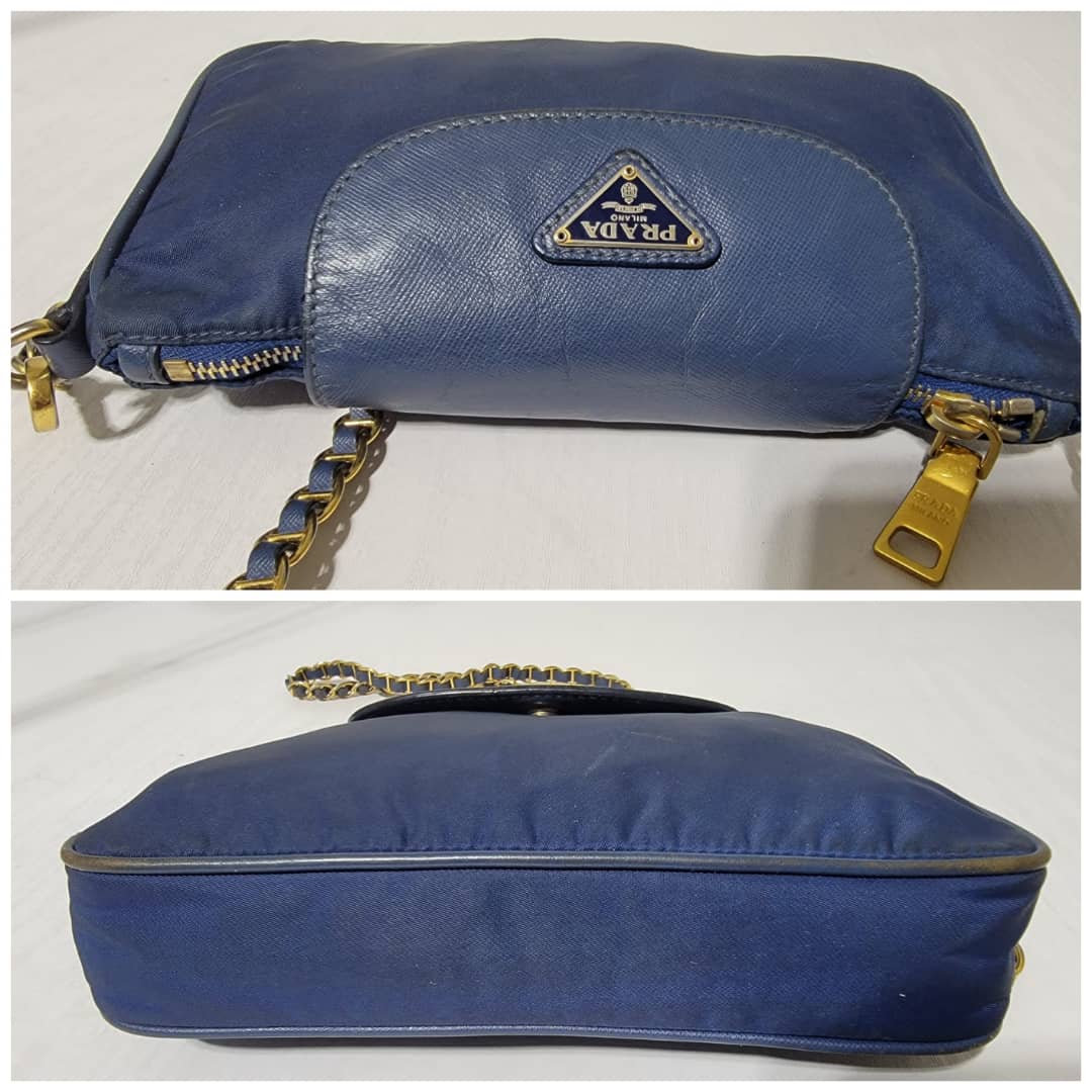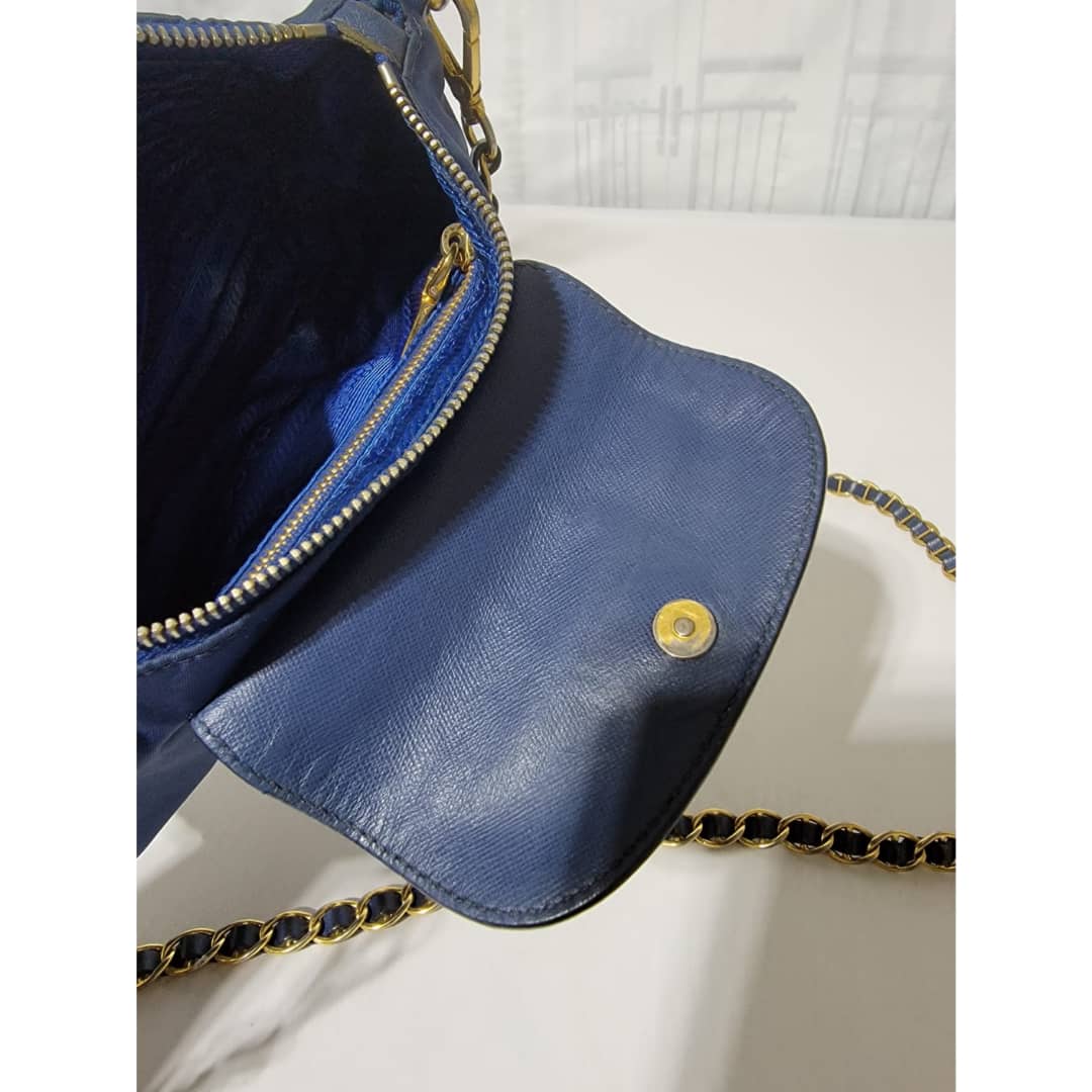 This authentic Prada Tessuto Nylon Saffiano Crossbody Bag Blue is in it’s good pre-owned condition. The exterior is clean and beautiful, base edges shows some scratches, the gold crossbody chain is clean but shows little scratches (Kindly look at pictures above). Interior is clean and beautiful.