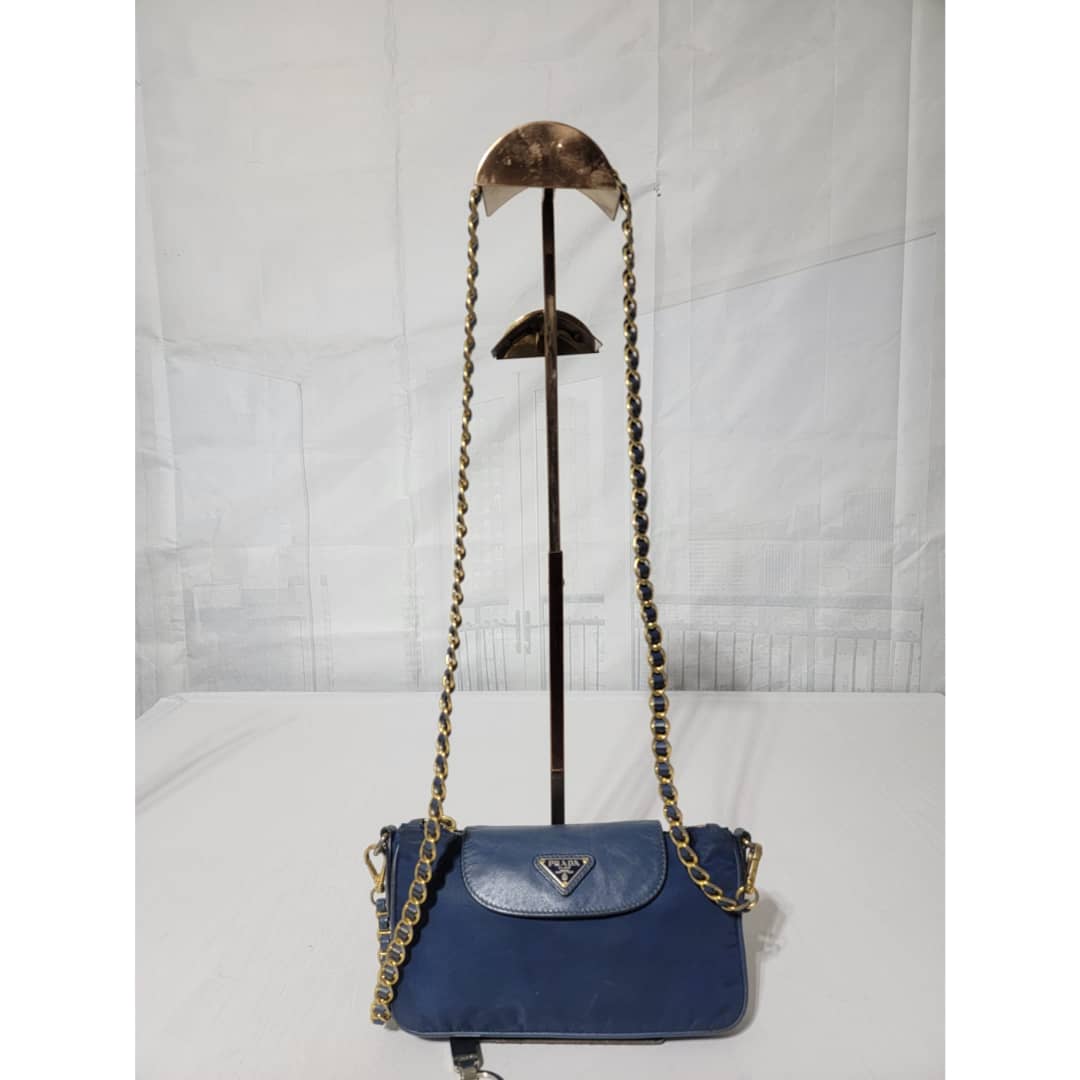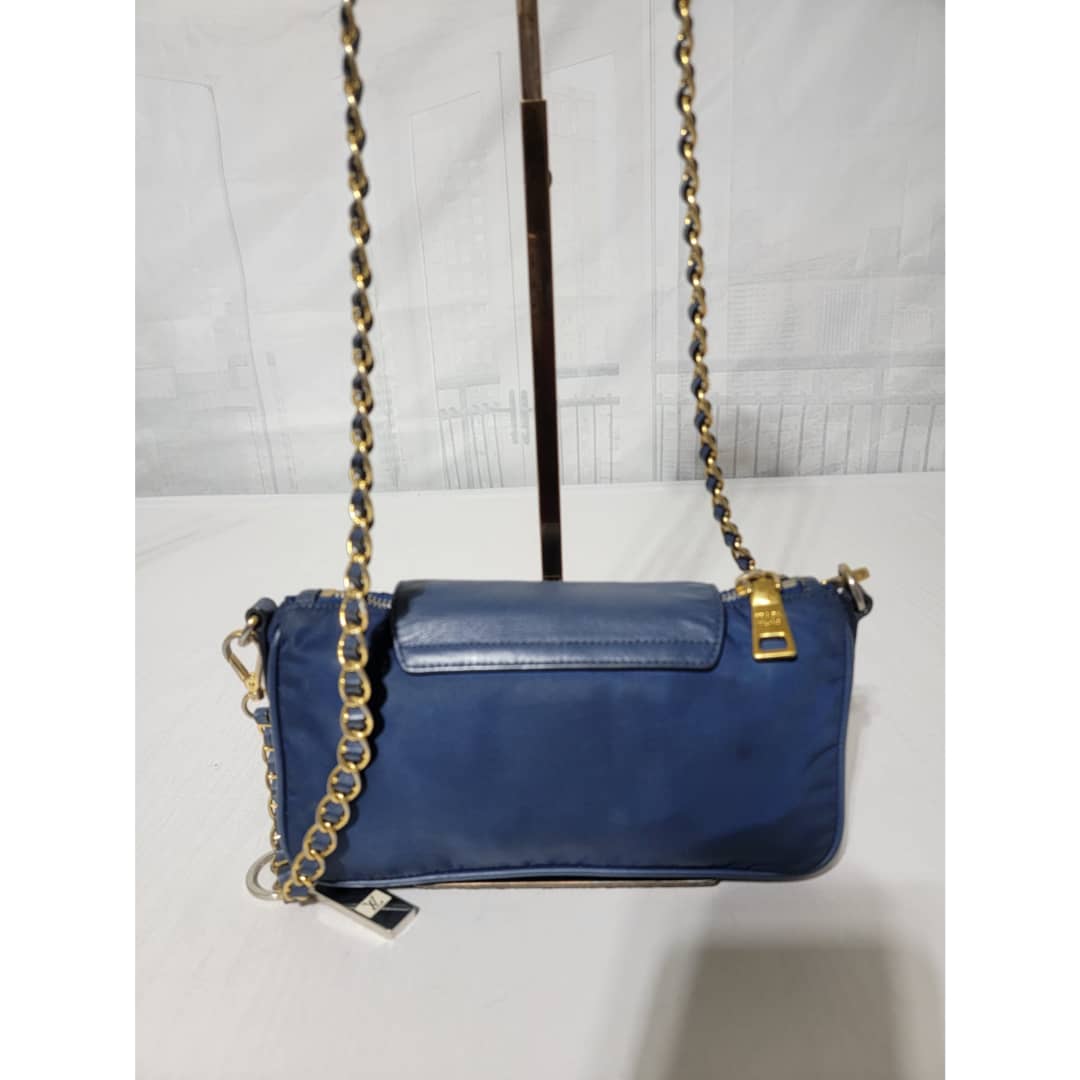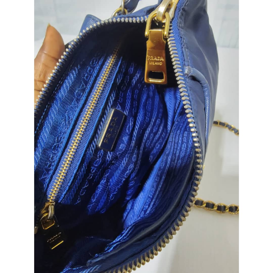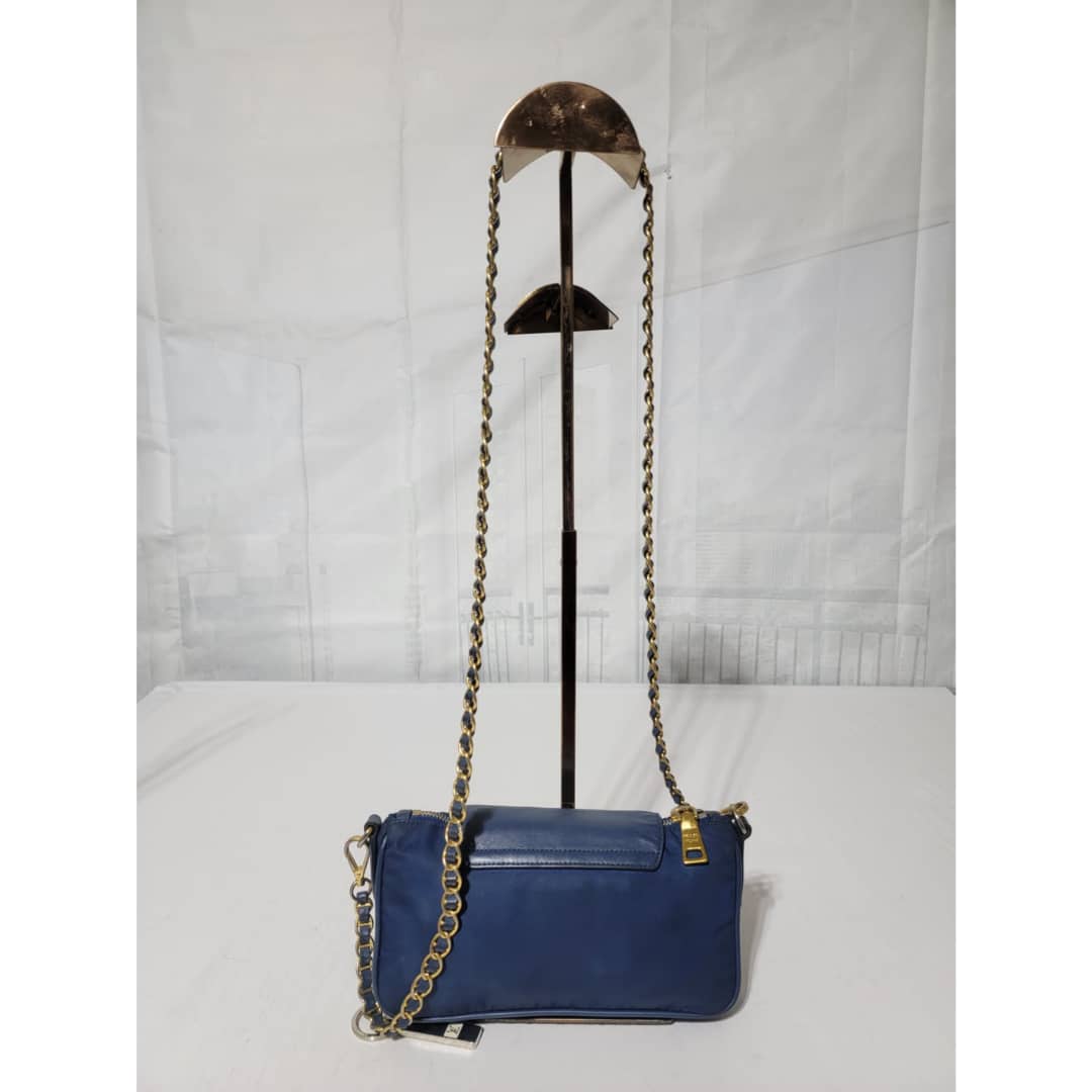 This authentic Prada Tessuto Nylon Saffiano Crossbody Bag Blue is in it’s good pre-owned condition. The exterior is clean and beautiful, base edges shows some scratches, the gold crossbody chain is clean but shows little scratches (Kindly look at pictures above). Interior is clean and beautiful.