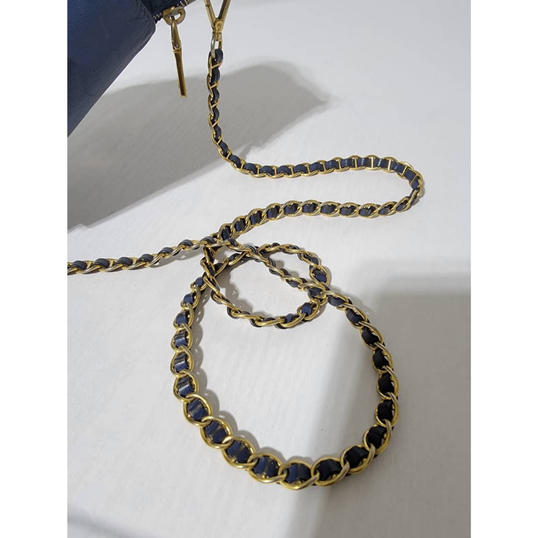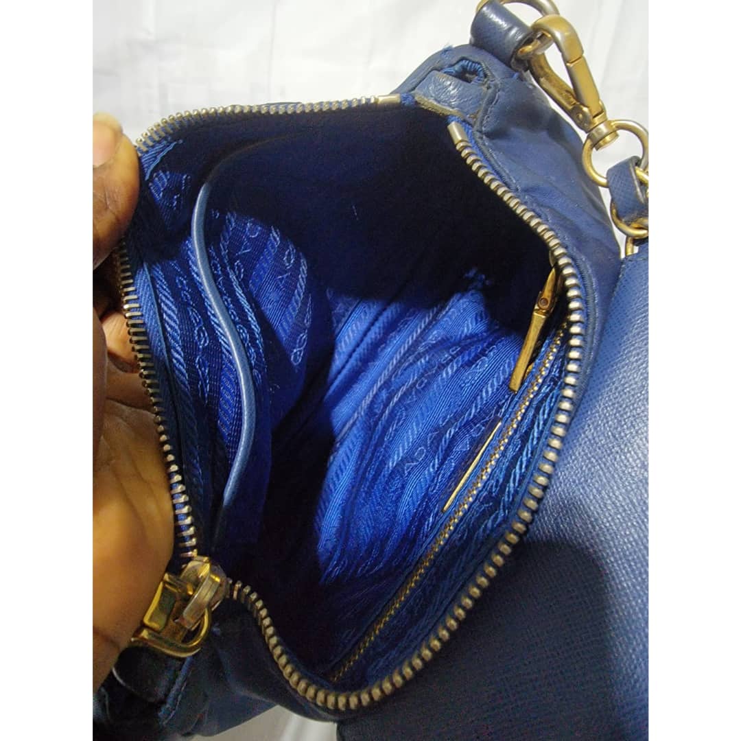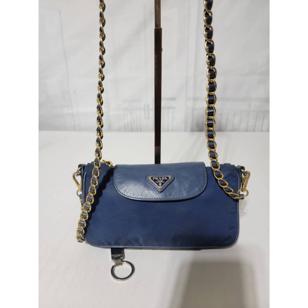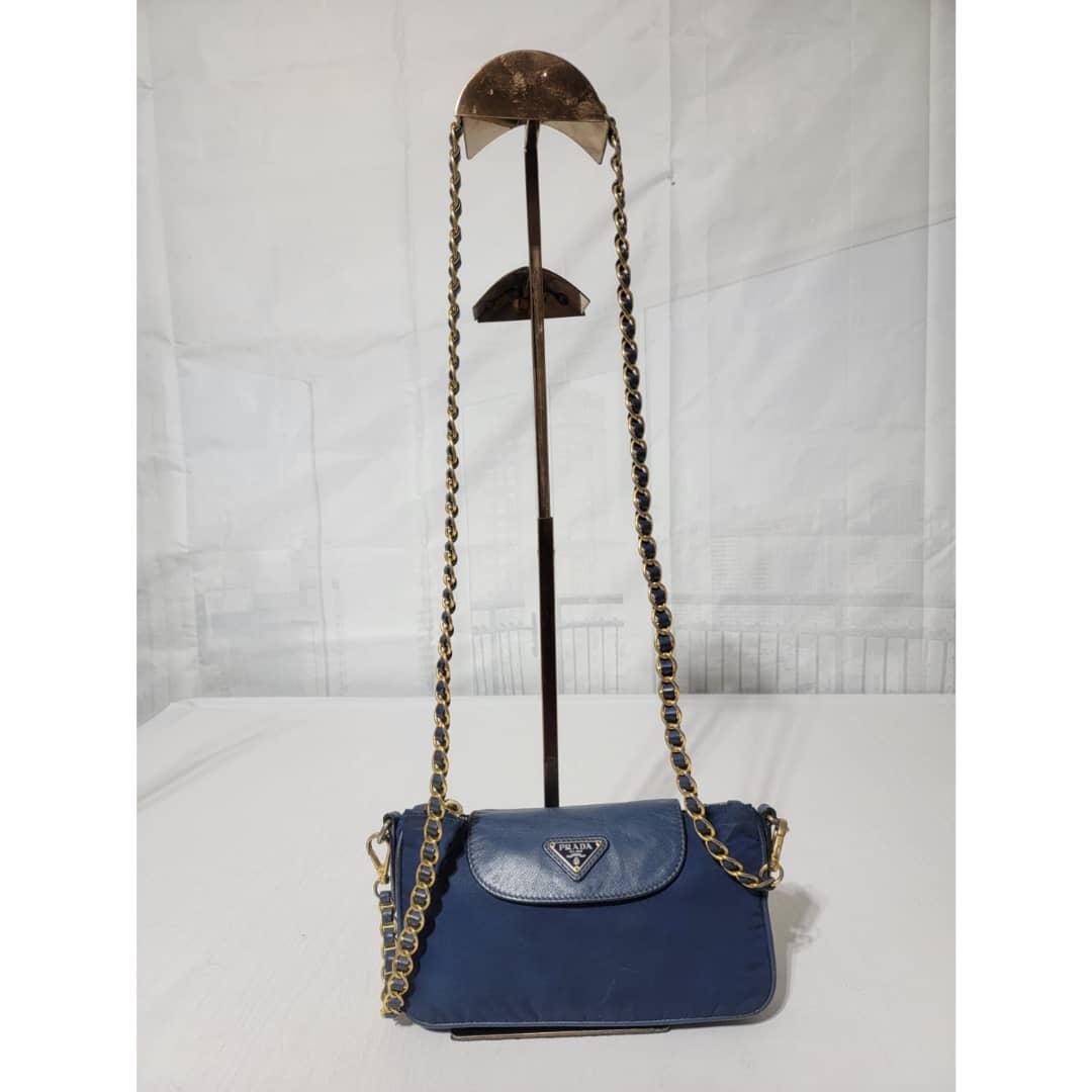 This authentic Prada Tessuto Nylon Saffiano Crossbody Bag Blue is in it’s good pre-owned condition. The exterior is clean and beautiful, base edges shows some scratches, the gold crossbody chain is clean but shows little scratches (Kindly look at pictures above). Interior is clean and beautiful.