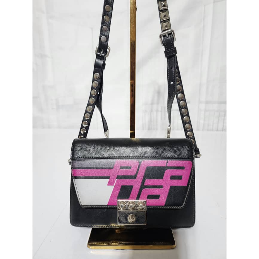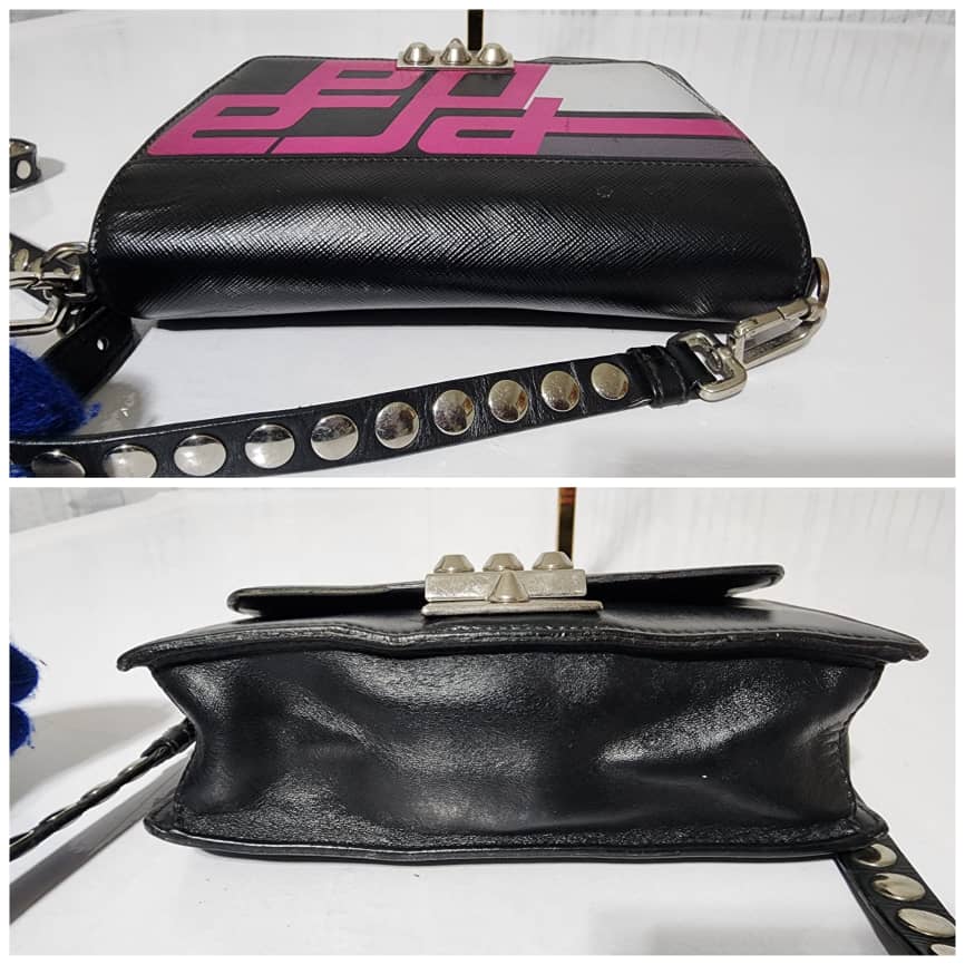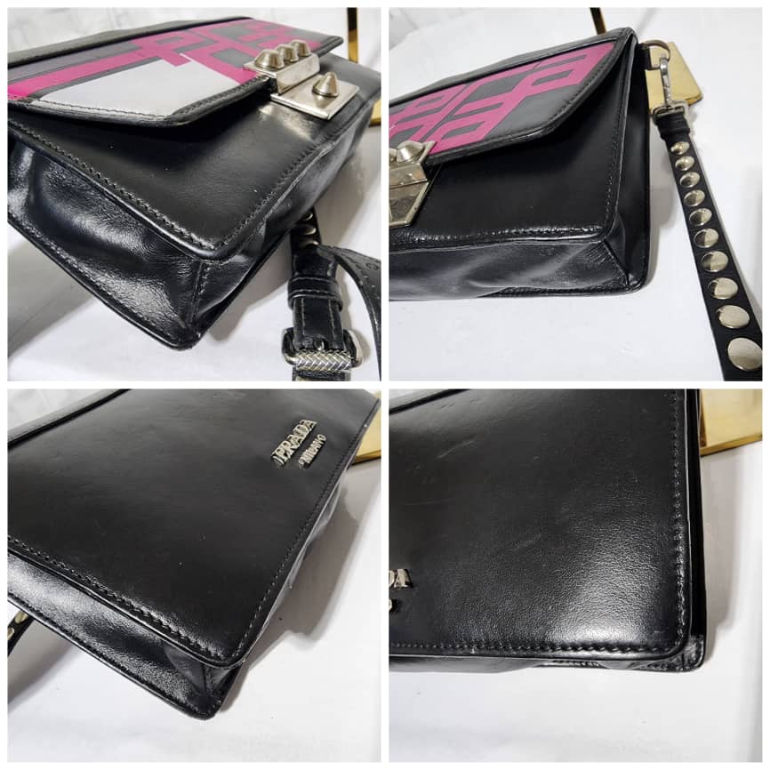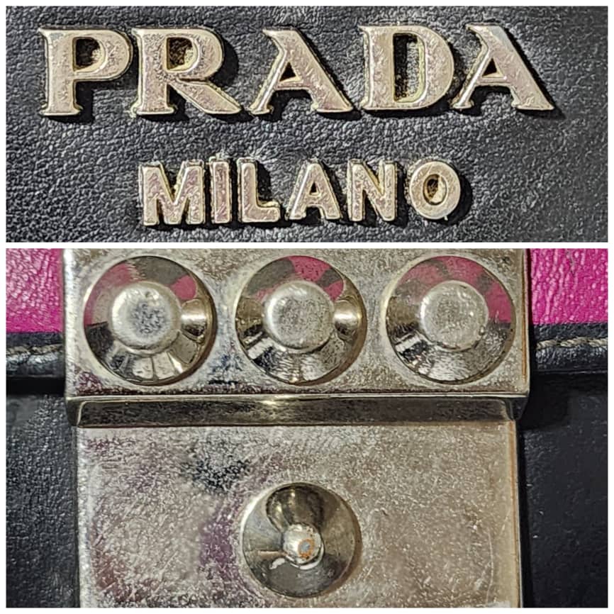 This authentic PRADA City Calfskin Saffiano Racing Logo Elektra Shoulder Bag Fushia pink/Black is in it’s good pre-owned condition. The exterior is clean and beautiful. Interior is clean. The silver hardware shows some slight scratches to it. Great condition, beautiful crossbody bag.