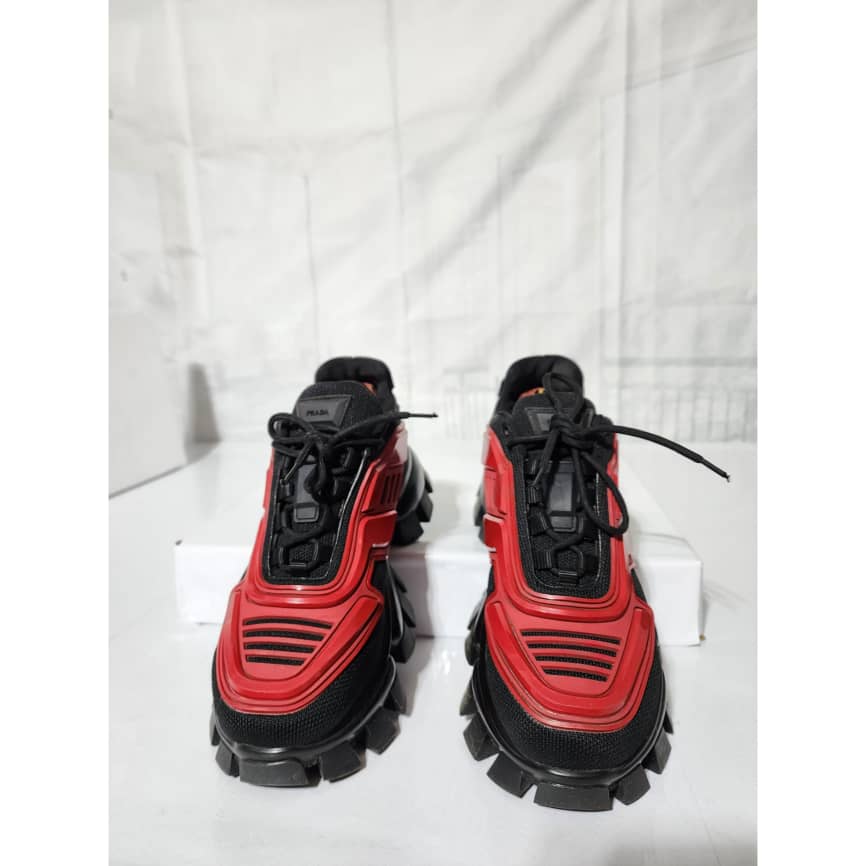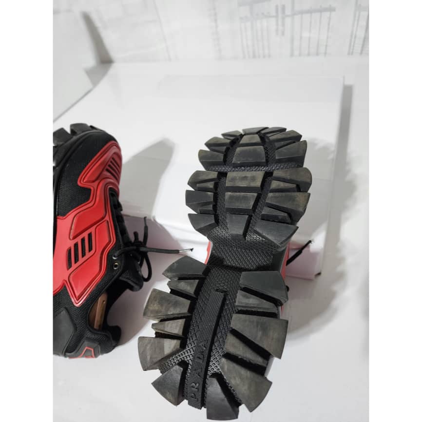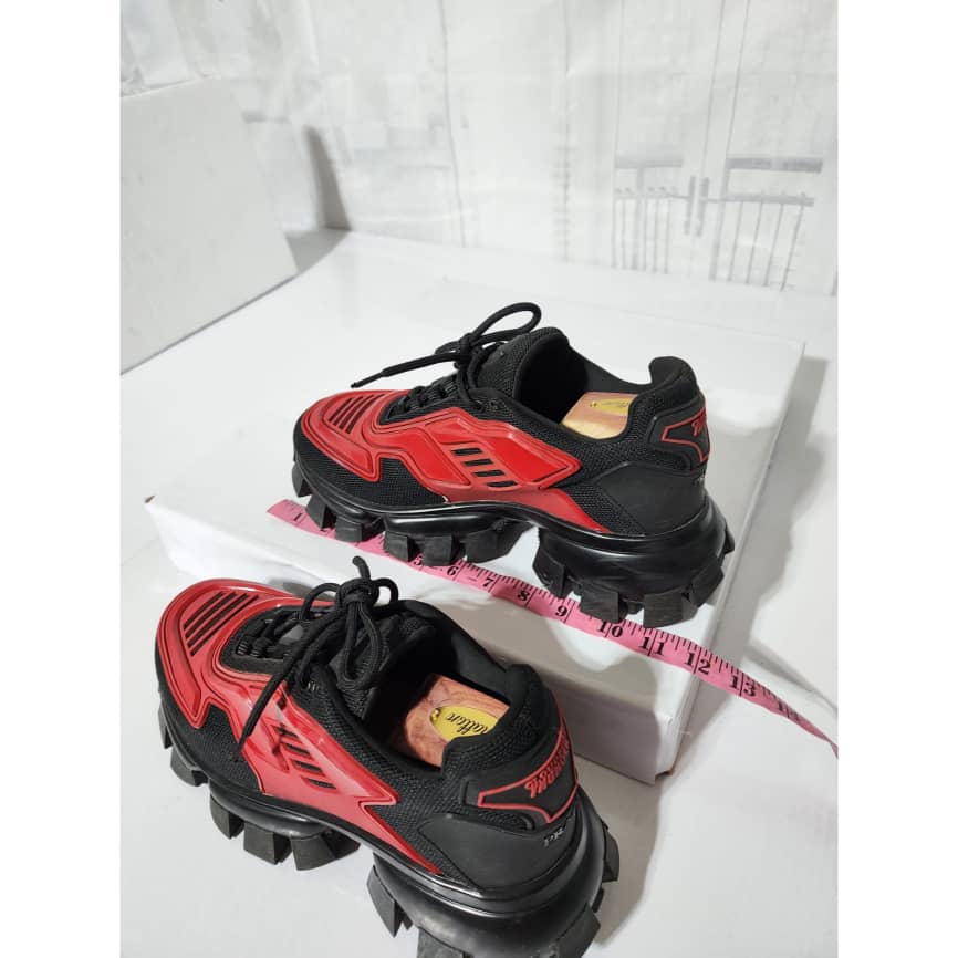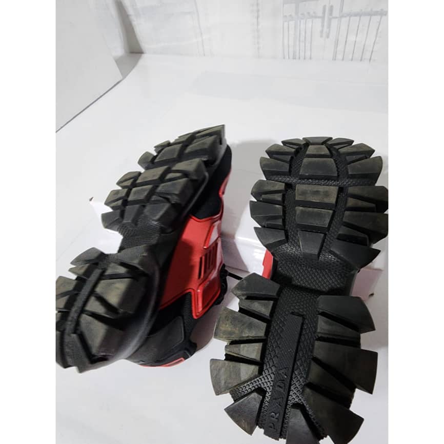 This authentic Prada Cloudbust Thunder Sneakers Red and Black Size 41 is in it’s good pre-owned condition. The exterior is clean and beautiful. The interior is clean. It is a nice sneakers. There are minimum scratches and wear to the sole of the sneakers. There is little rubbing to the red leather on the sneakers. Kindly look at pictures above.