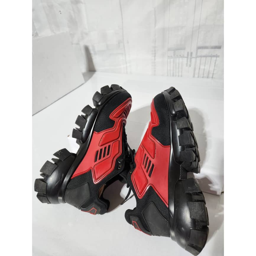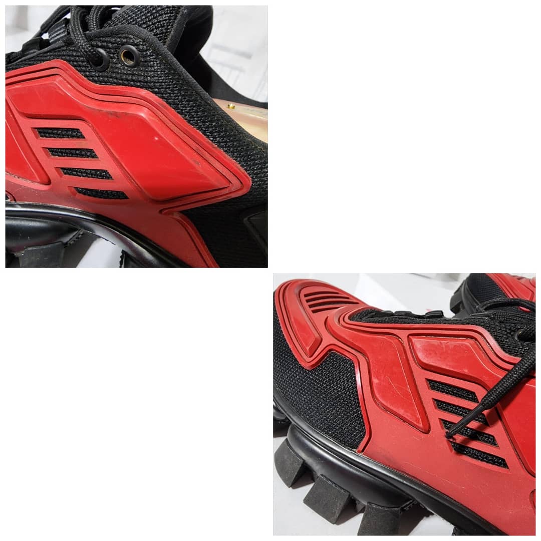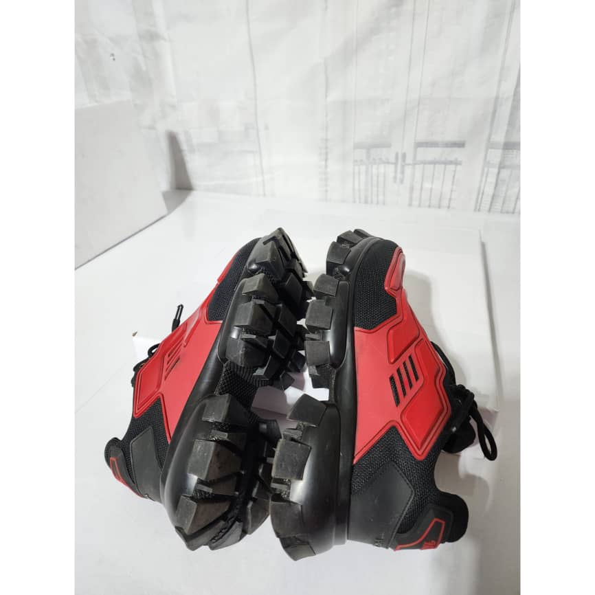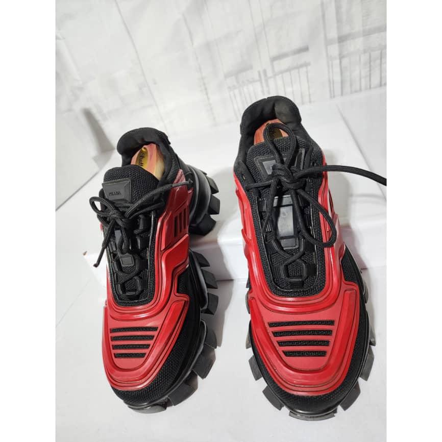This authentic Prada Cloudbust Thunder Sneakers Red and Black Size 41 is in it’s good pre-owned condition. The exterior is clean and beautiful. The interior is clean. It is a nice sneakers. There are minimum scratches and wear to the sole of the sneakers. There is little rubbing to the red leather on the sneakers. Kindly look at pictures above.