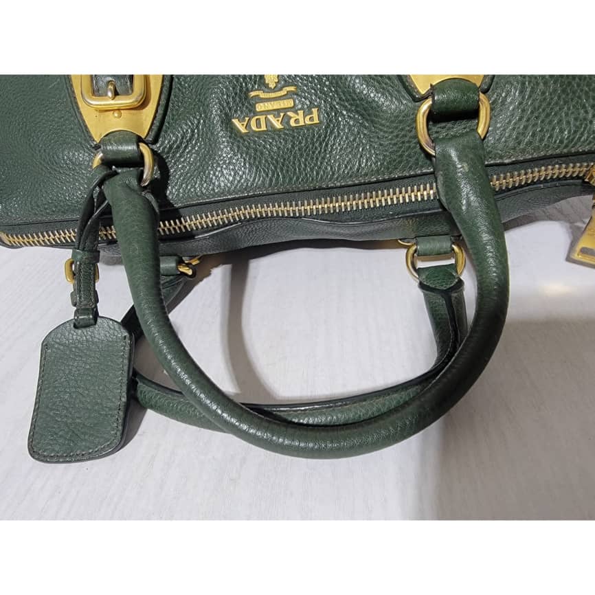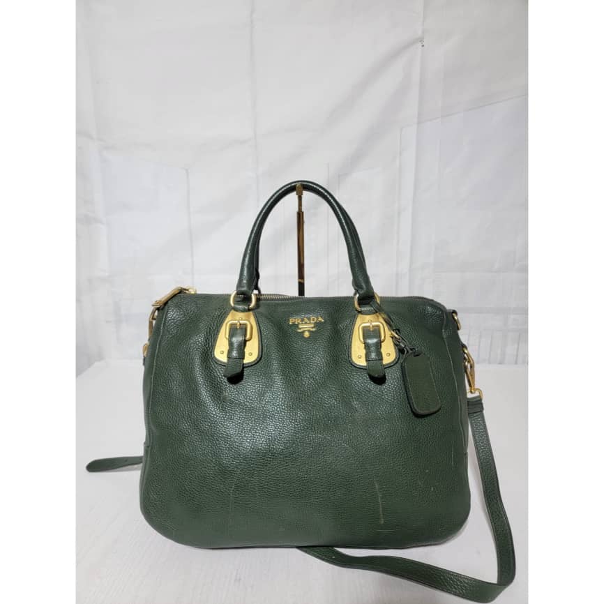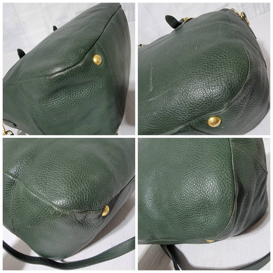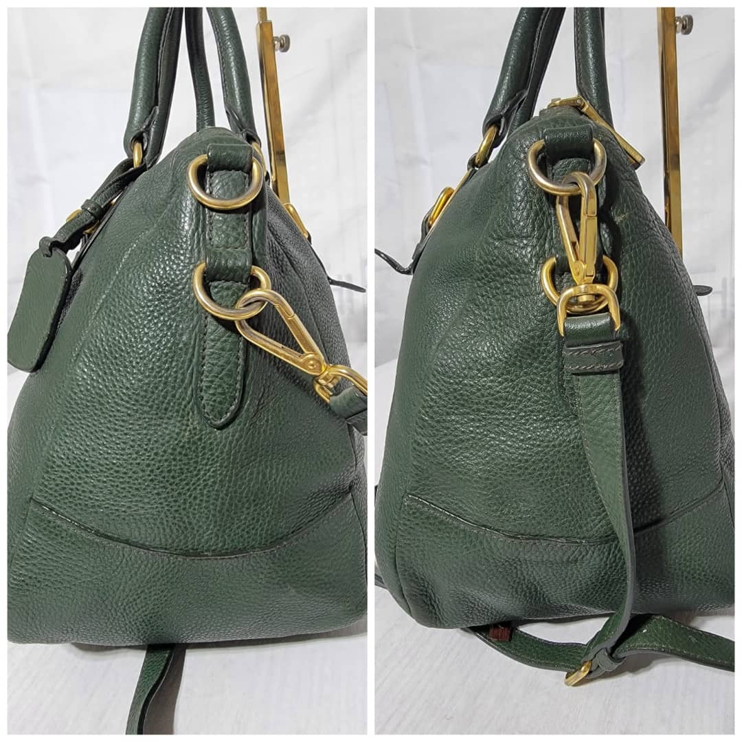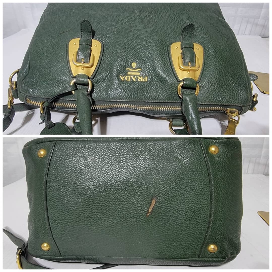 This authentic Prada Cowhide Leather Shoulder Bag Gold Buckle Shoulder bag ( Army Green) is in it’s pre-owned condition. However the exterior front of the bag show some scratches to it. Interior is clean but shows hairy pull to the interior lining. Kindly look at pictures above for more details.