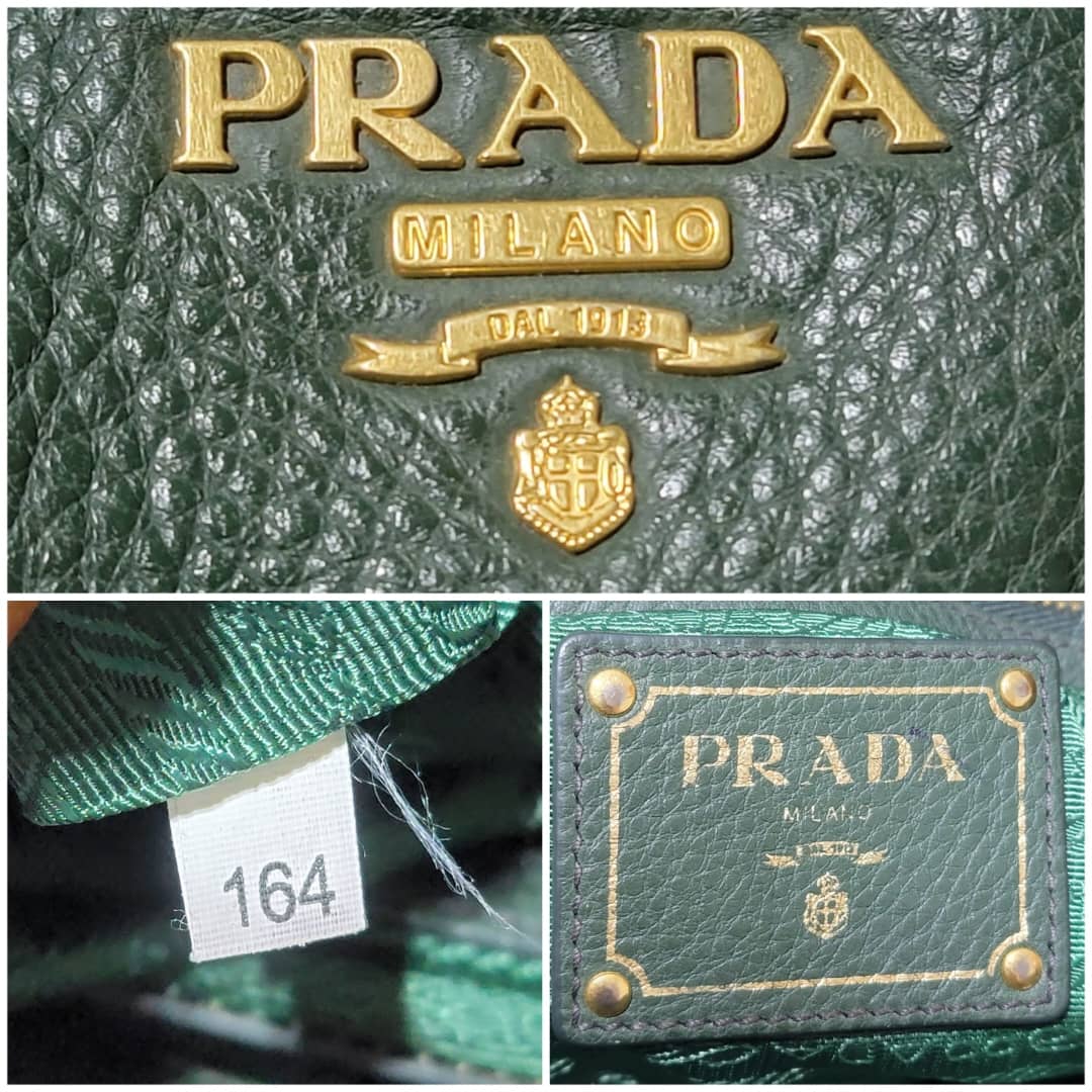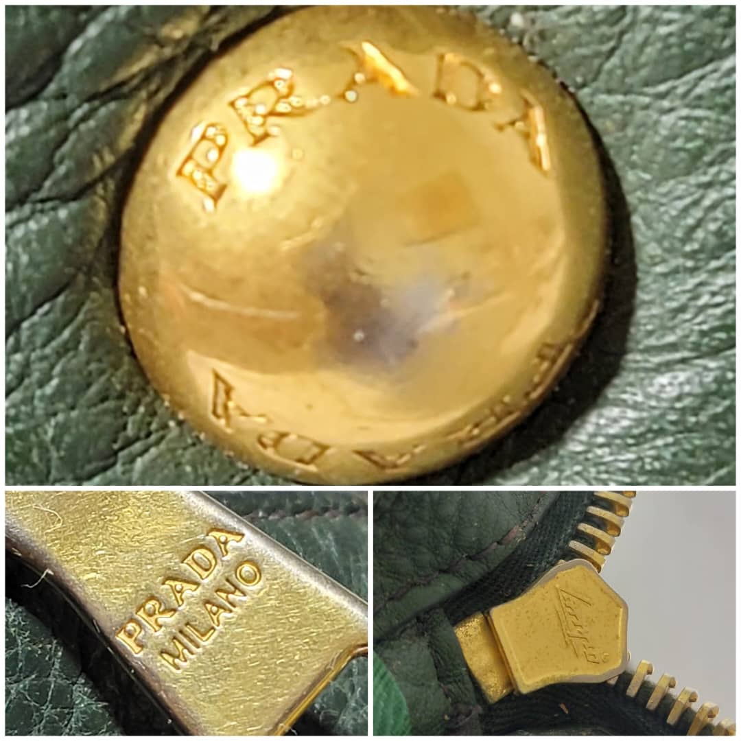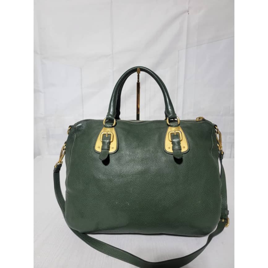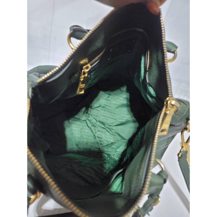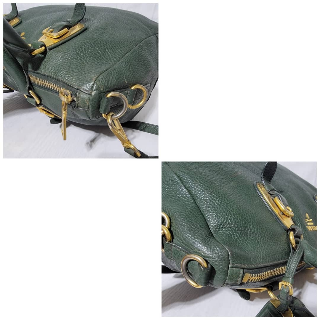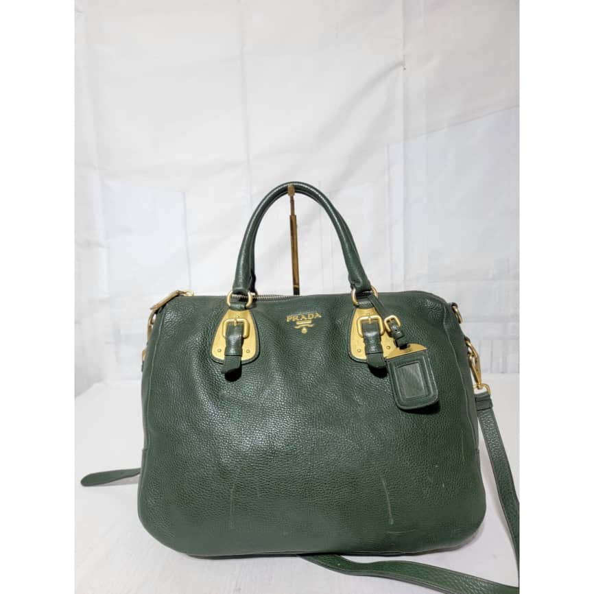 This authentic Prada Cowhide Leather Shoulder Bag Gold Buckle Shoulder bag ( Army Green) is in it’s pre-owned condition. However the exterior front of the bag show some scratches to it. Interior is clean but shows hairy pull to the interior lining. Kindly look at pictures above for more details.