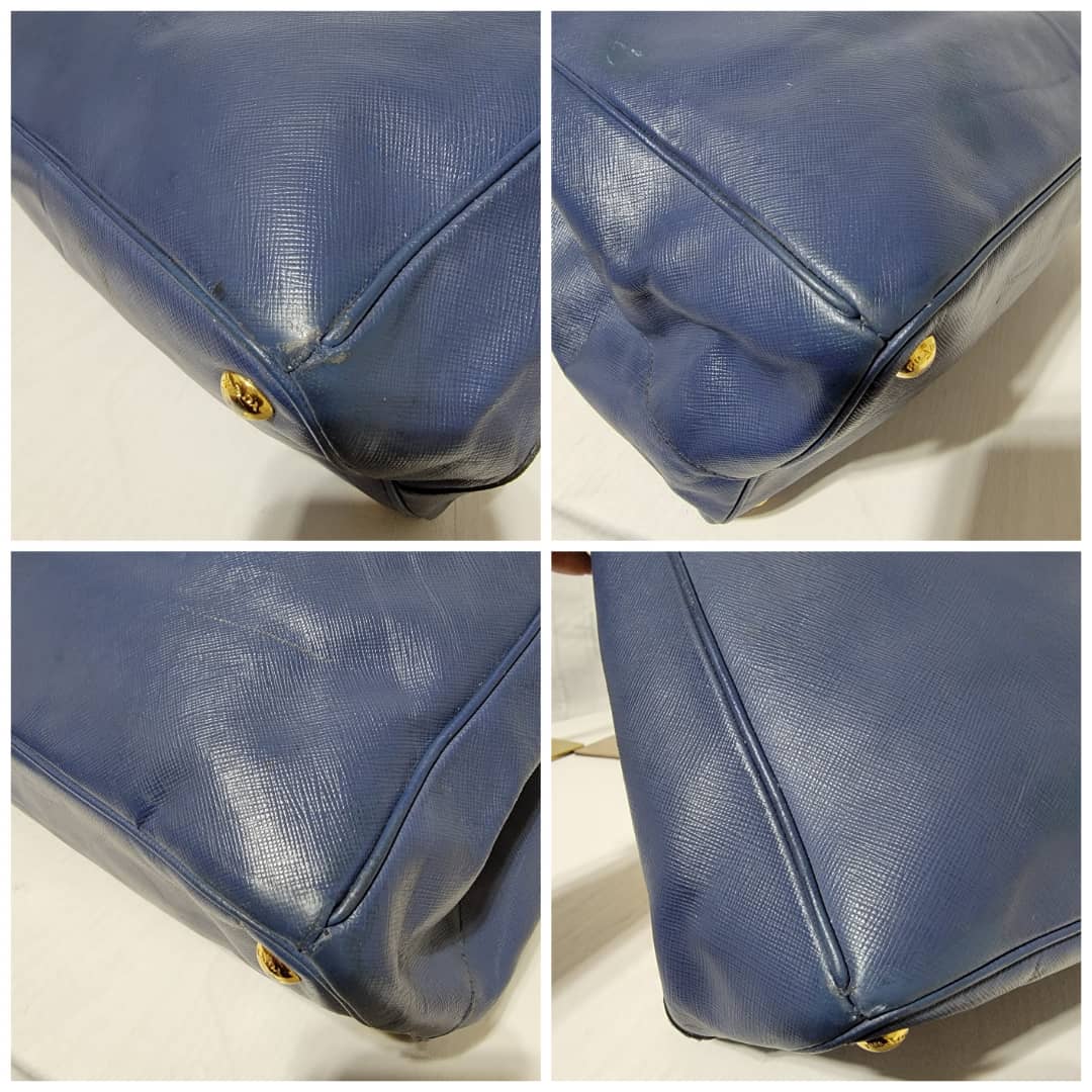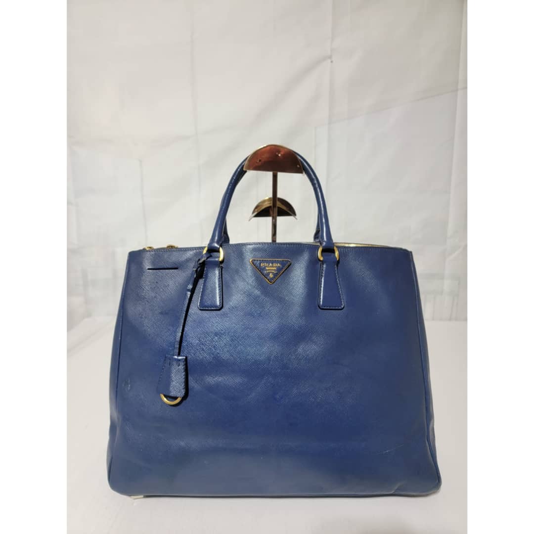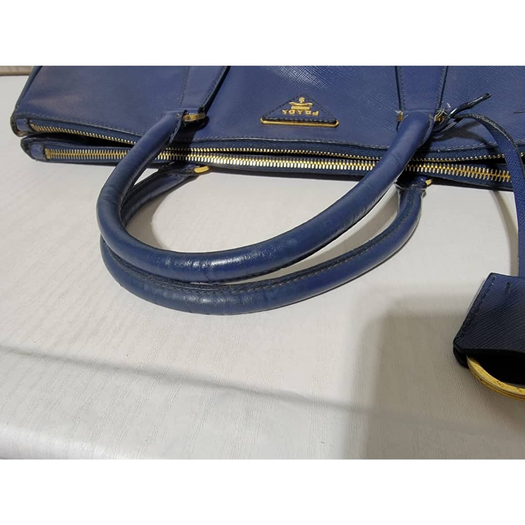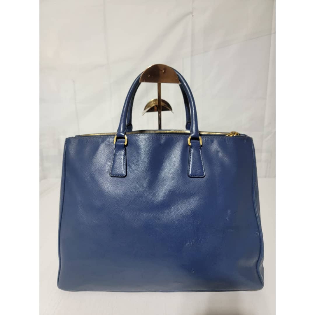 This authentic PRADA GALLERIA SAFFIANO DOUBLE-ZIP TOTE BAG BLUE is in it’s good pre-owned condition. The exterior saffiano leather is clean and beautiful, it shows little scratches to the saffiano leather. Interior is clean. Gold hardware.