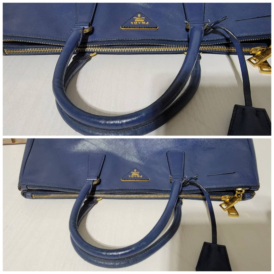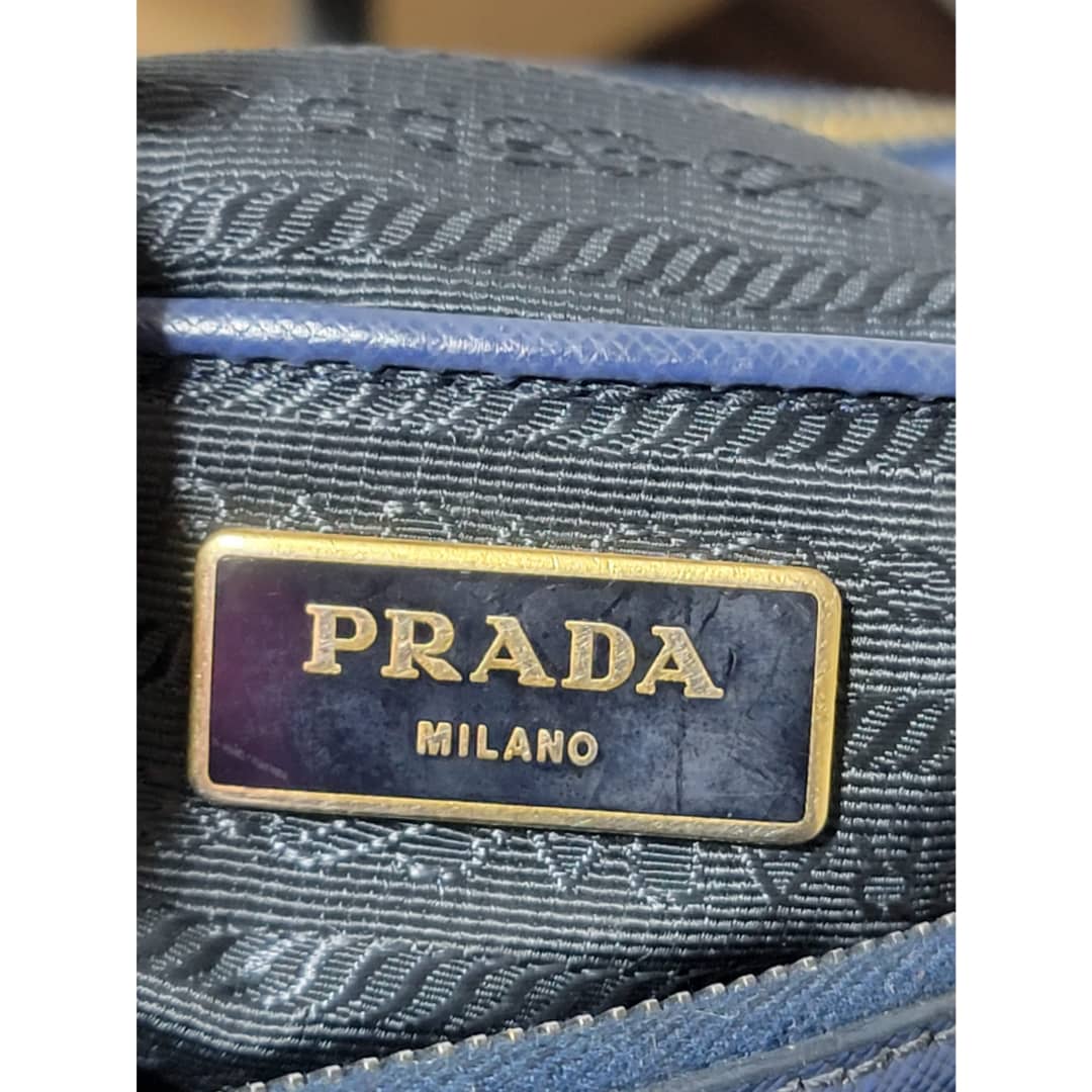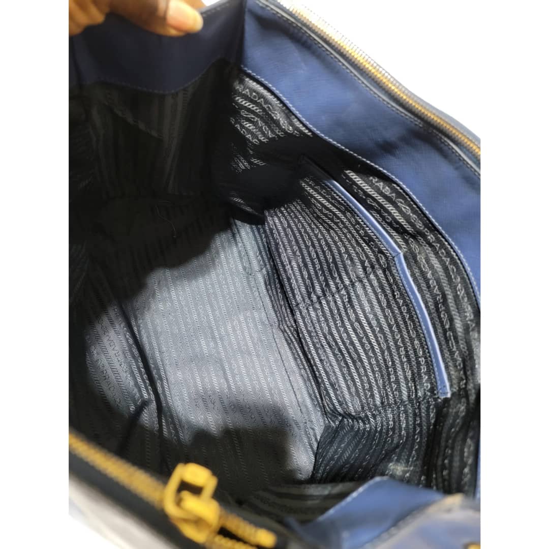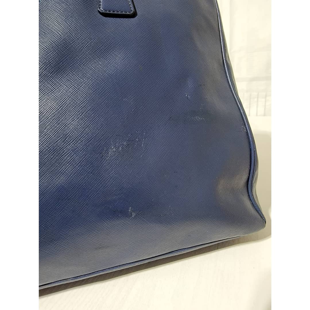 This authentic PRADA GALLERIA SAFFIANO DOUBLE-ZIP TOTE BAG BLUE is in it’s good pre-owned condition. The exterior saffiano leather is clean and beautiful, it shows little scratches to the saffiano leather. Interior is clean. Gold hardware.