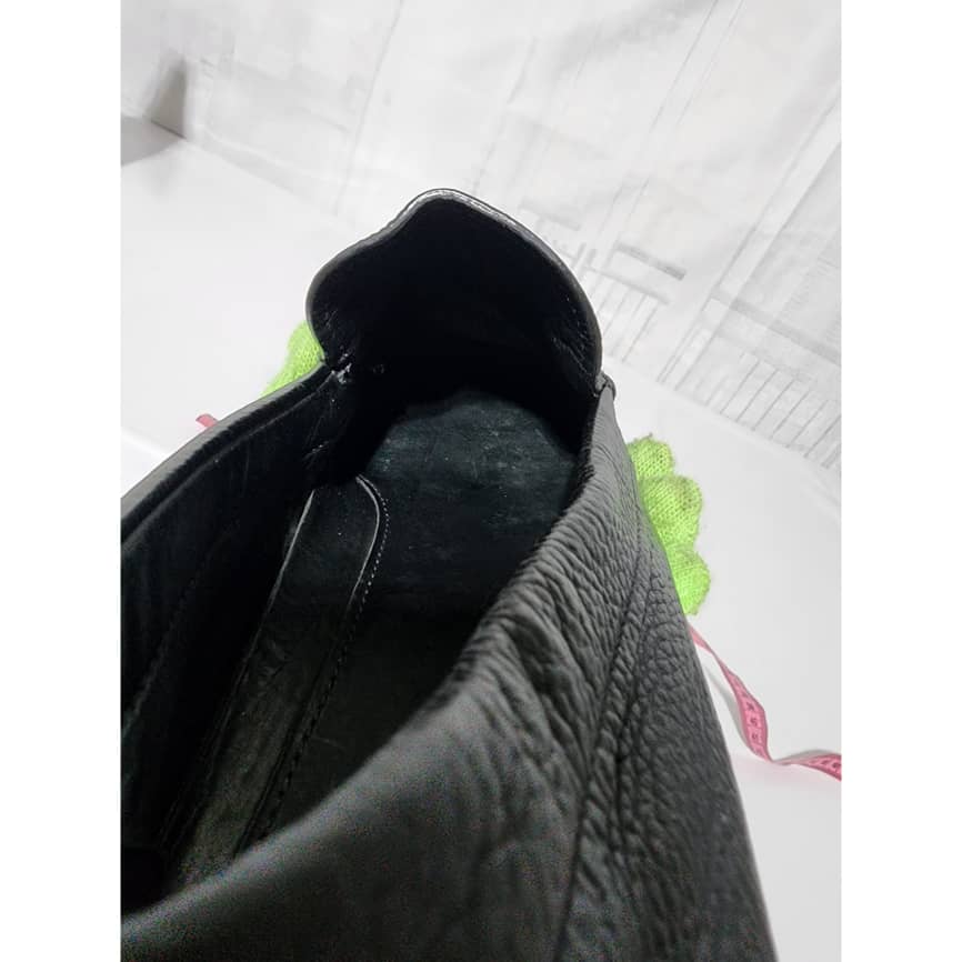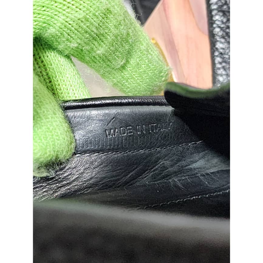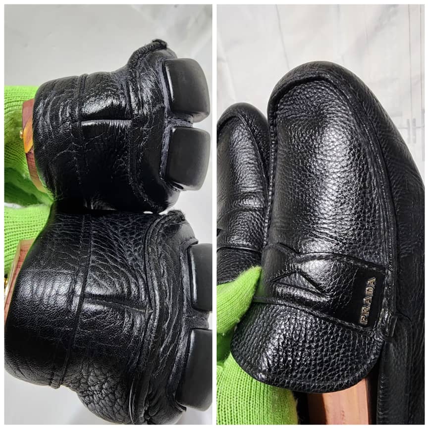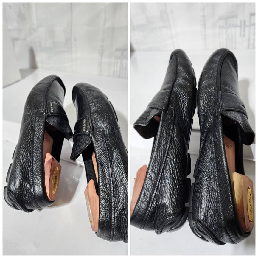 This authentic Prada Leather Slip On Loafers Black Size is in it’s pre-owned condition. The exterior is clean and beautiful. Beneath the shoe is clean. Inside of the shoe shows sign of rubbing in it. The Prada logo in the interior is faded, the date code is visible. Silver hardware. Kindly take note of the rubbing inside the sole of the shoe.