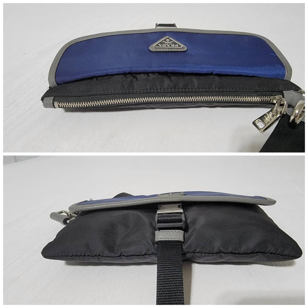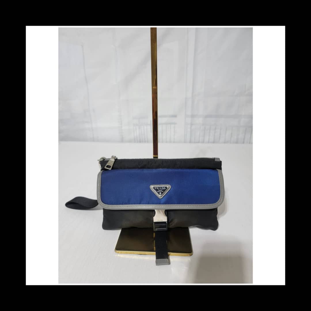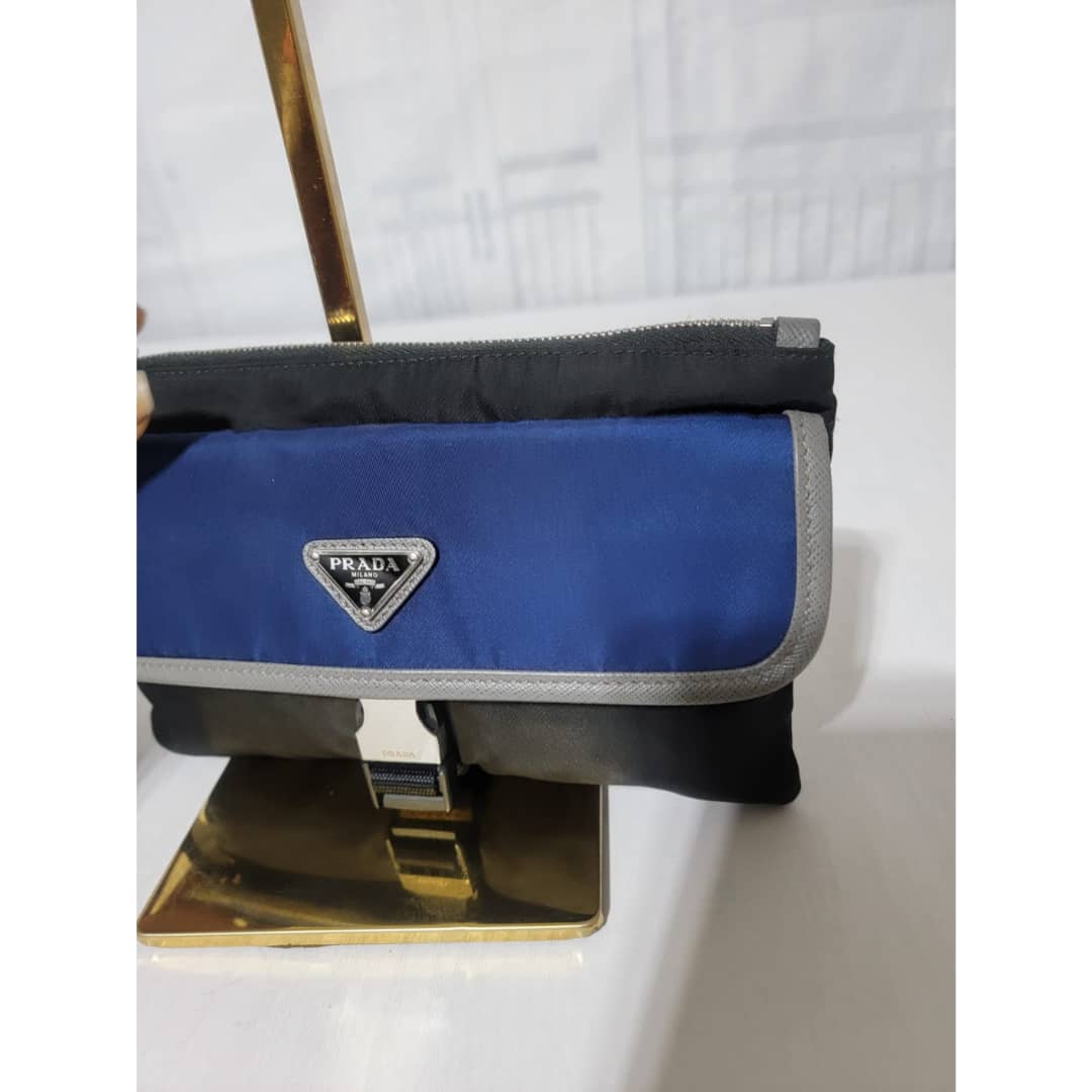 This authentic PRADA MILANO NYLON CLUTCH/WRISTLET BLUE/BLACK/GREY is in it’s good pre-owned condition. The exterior is clean and beautiful. Interior is clean. Silver hardware.