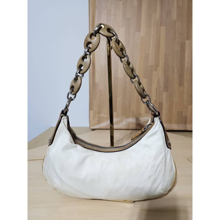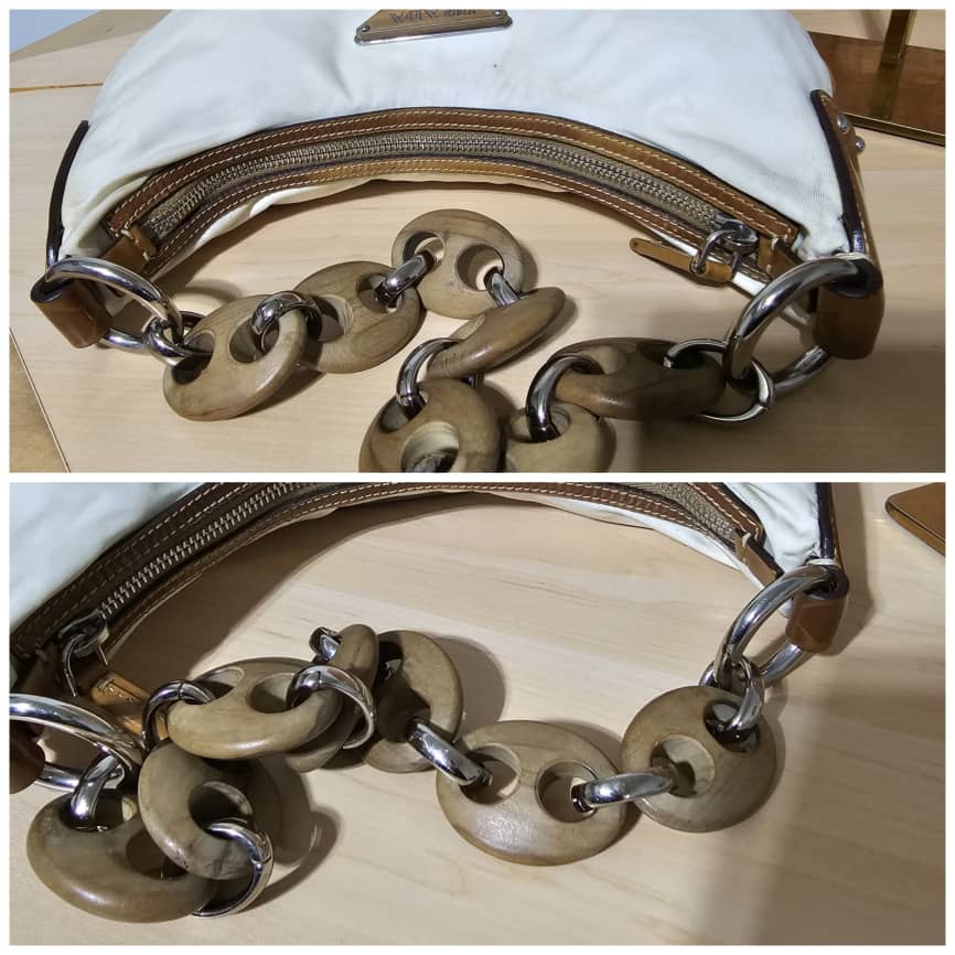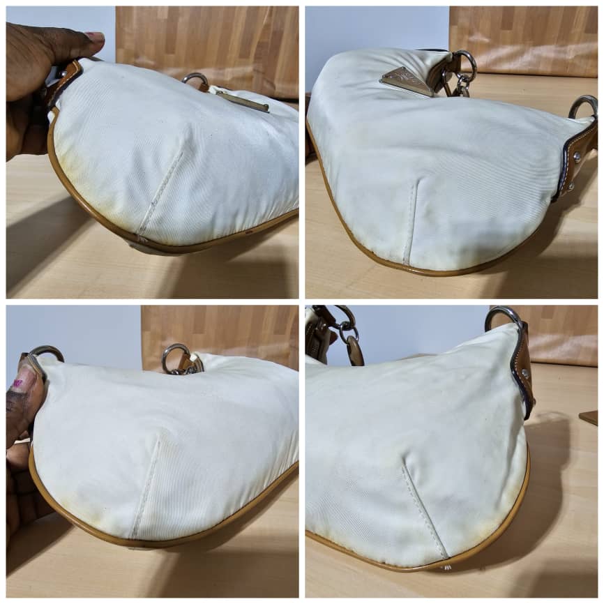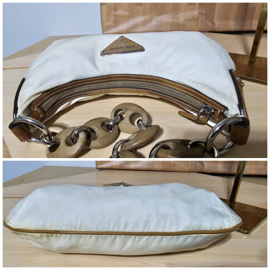 This authentic Prada Nylon And Wood Baguette Bag Off White and Brown is in it’s good pre-owned condition. The interior is clean. The exterior is clean with little slight color wear (Kindly refer to pictures above). It can be worn as a shoulder bag.