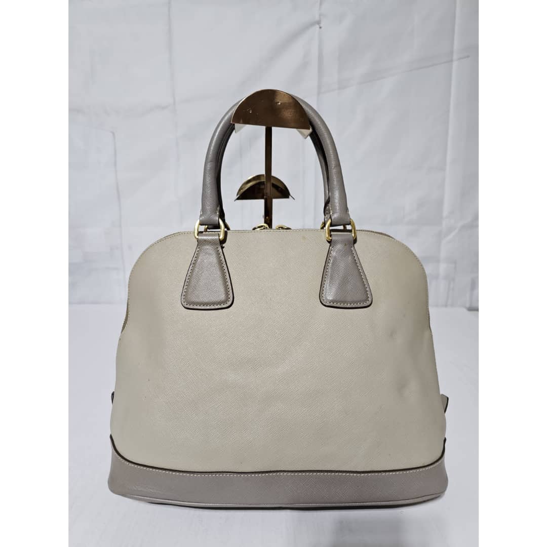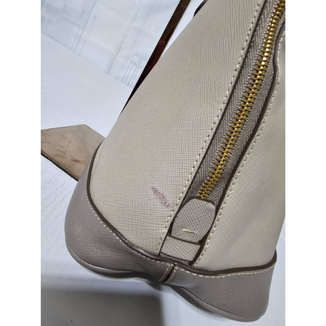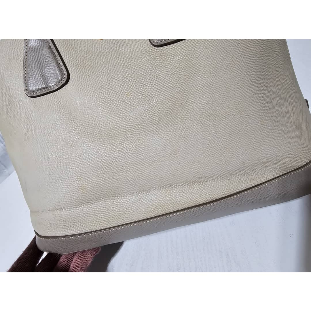 This authentic Prada Pomenade Saffiano Medium Two Tone Leather Dome Satchel Taupe is in it’s good pre-owned condition. The exterior leather is clean and beautiful, exterior shows some dotted stains (Kindly review pictures above). Interior is clean. Handles are clean. Gold hardware is clean and shiny.