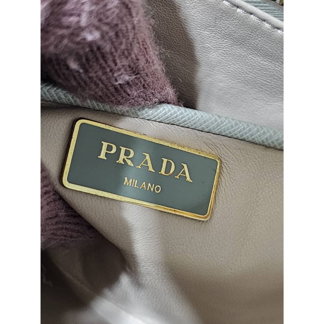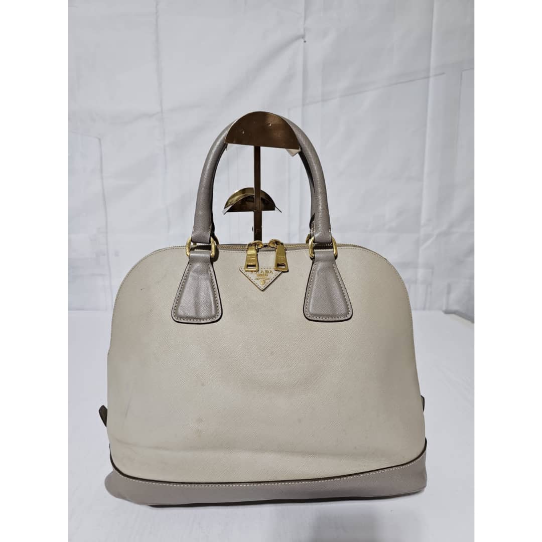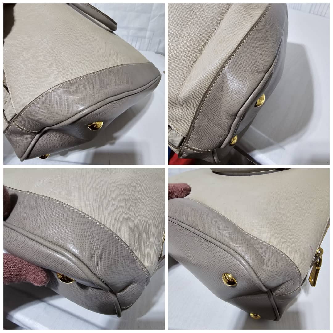 This authentic Prada Pomenade Saffiano Medium Two Tone Leather Dome Satchel Taupe is in it’s good pre-owned condition. The exterior leather is clean and beautiful, exterior shows some dotted stains (Kindly review pictures above). Interior is clean. Handles are clean. Gold hardware is clean and shiny.