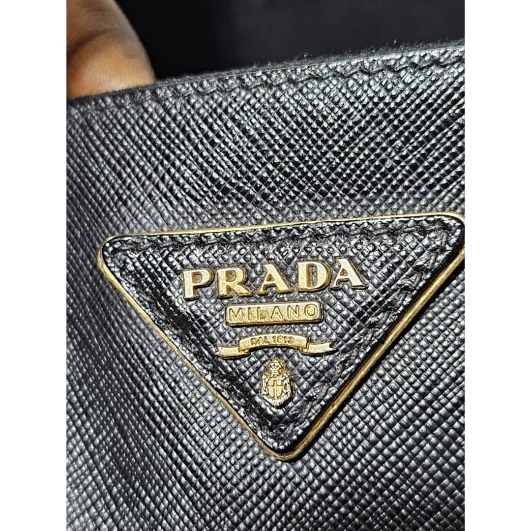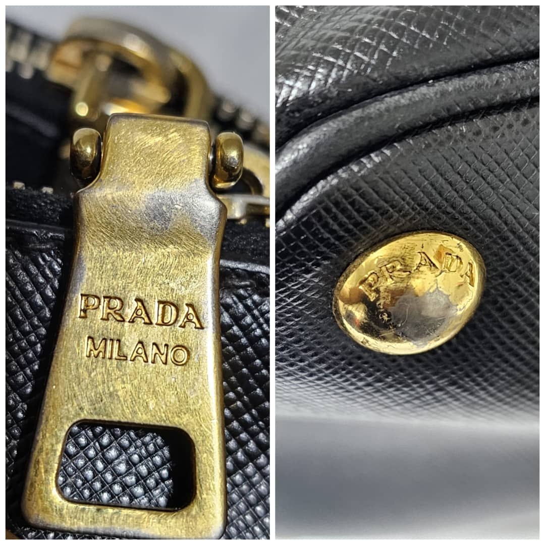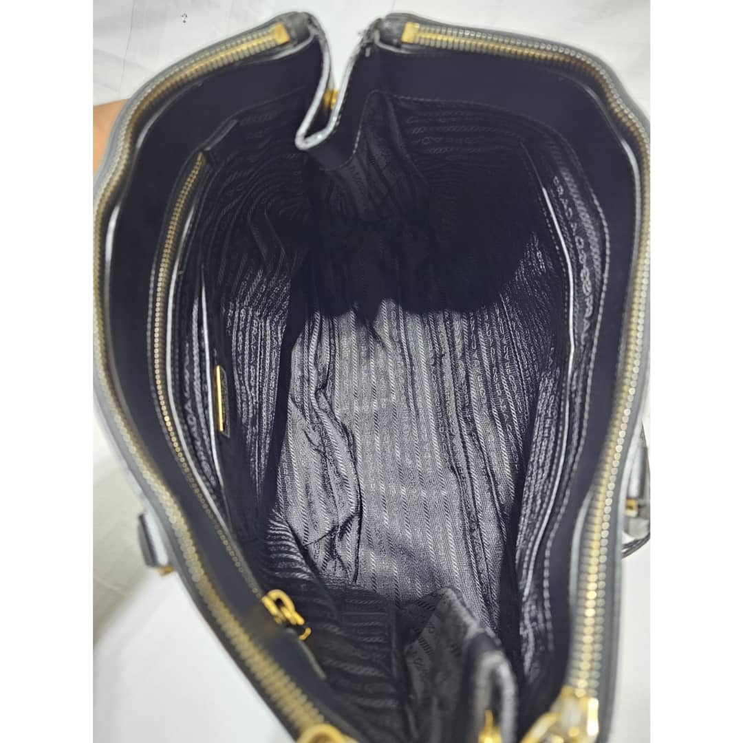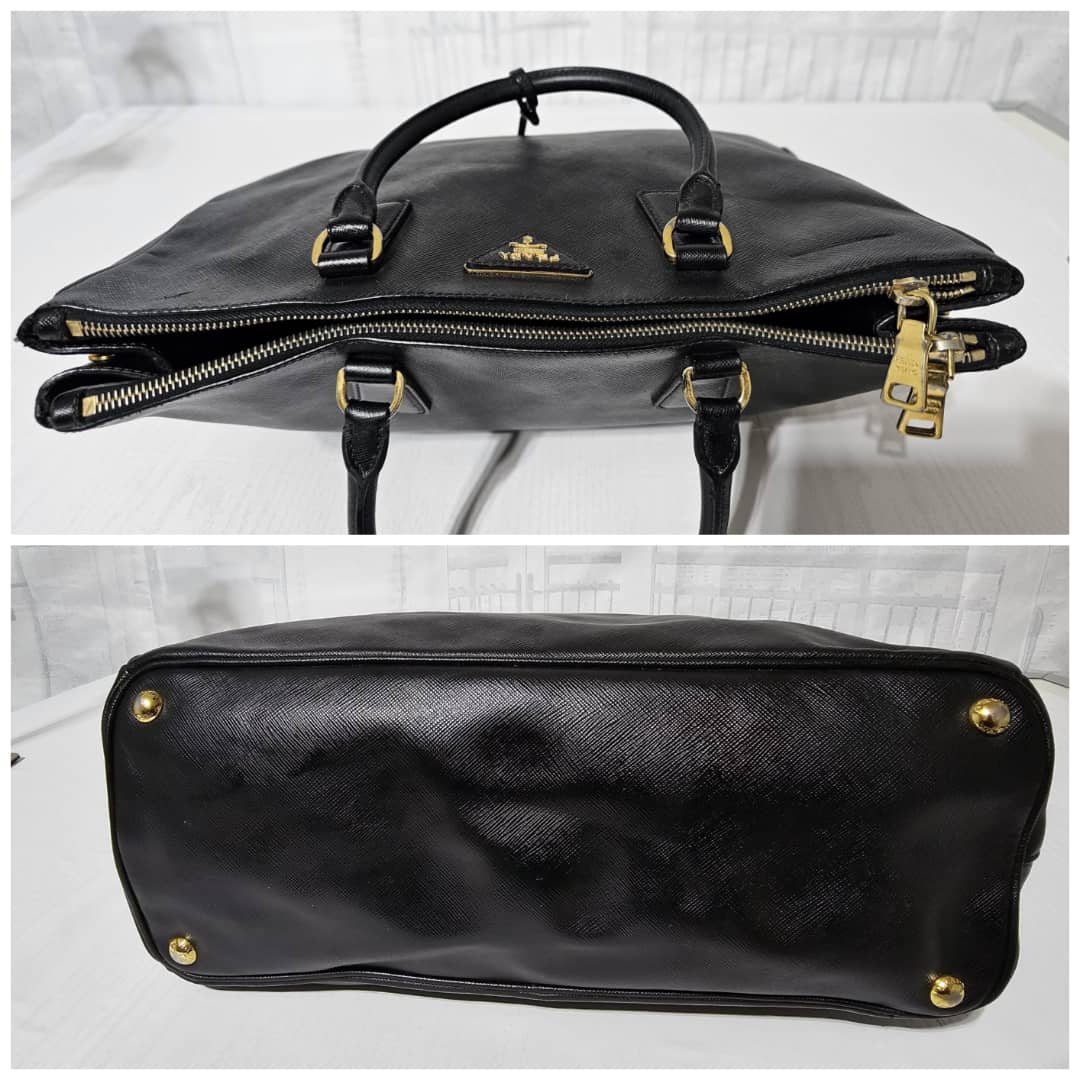 This authentic Prada Saffiano Lux Leather Double Zip Tote Bag Black is in it’s good pre-owned condition. The exterior leather is clean and beautiful. Interior is clean. It comes with a key charm. Gold hardware, shows some scratches. Bag is in good condition.