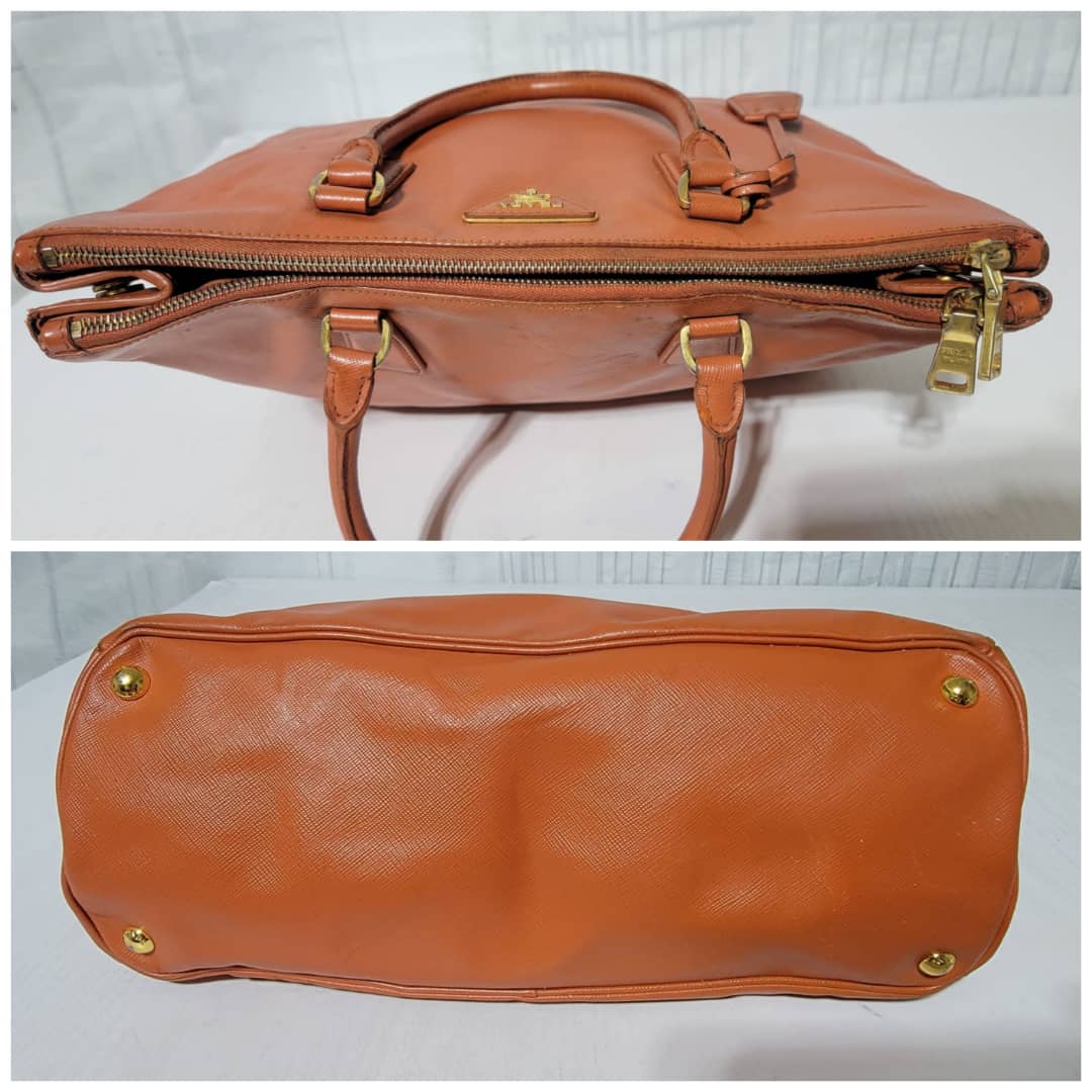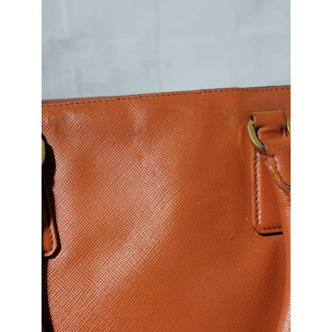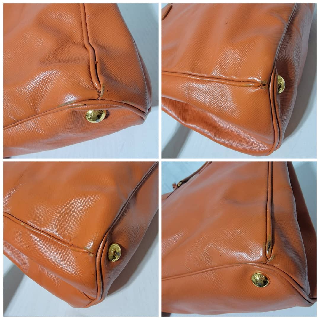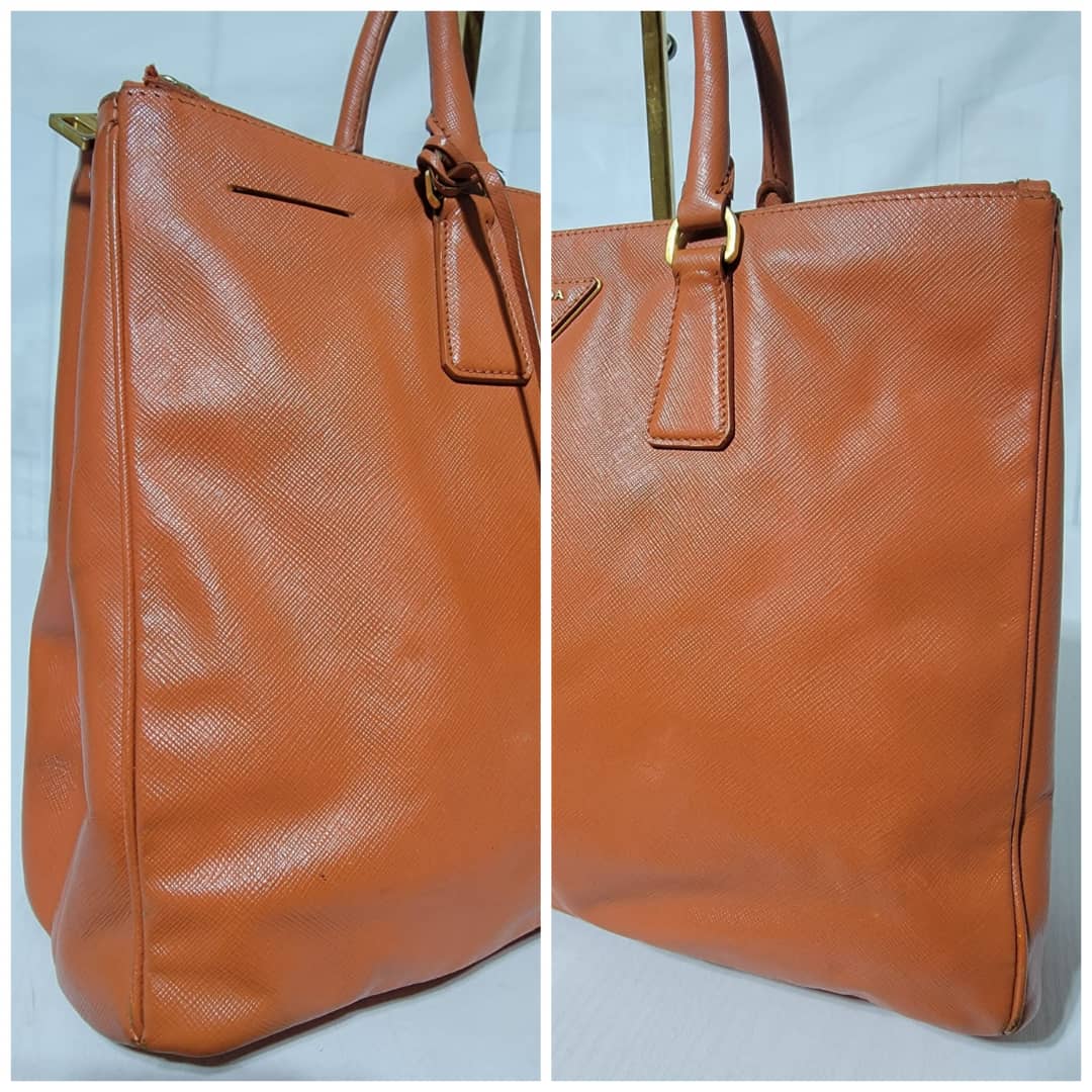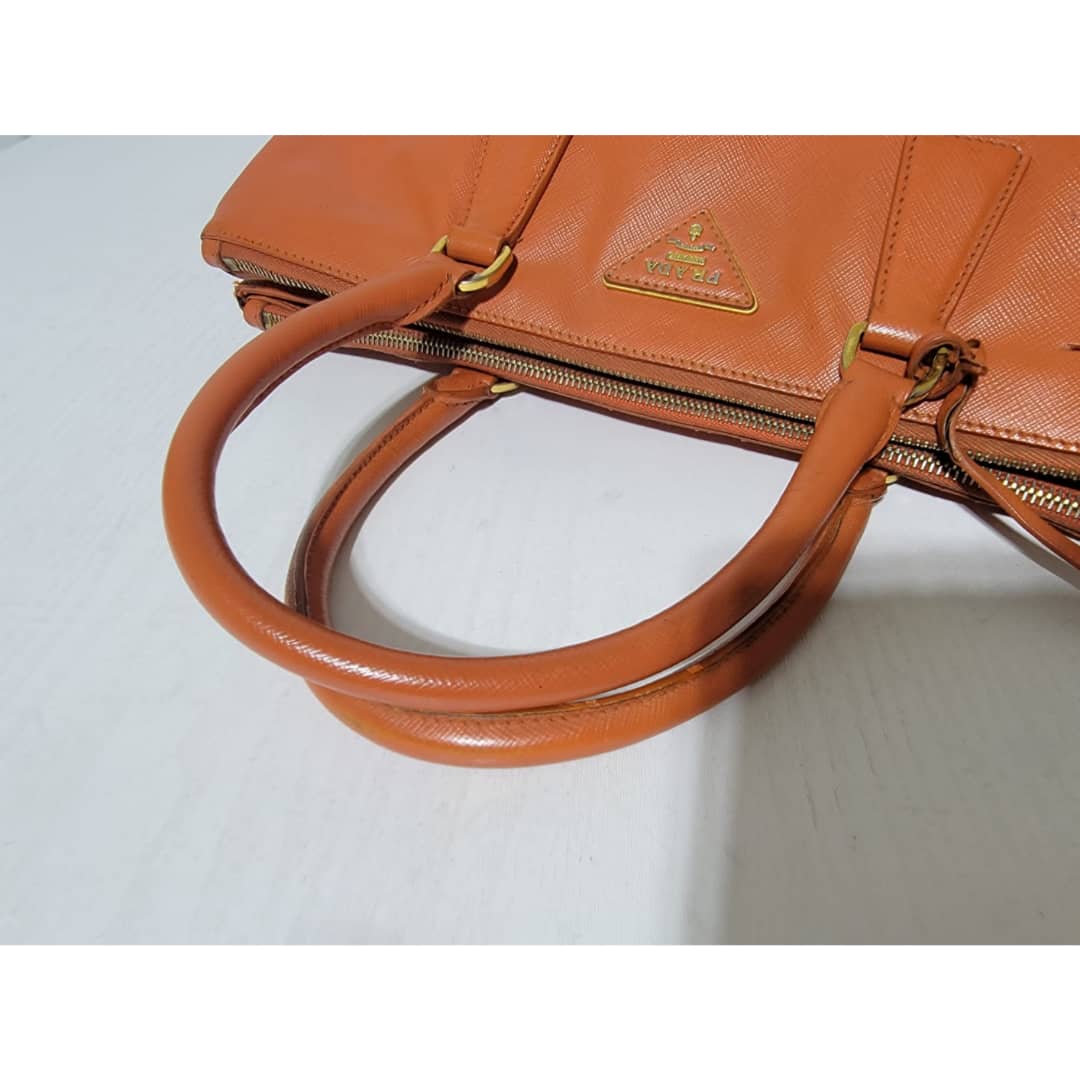 This authentic Prada Saffiano Lux Leather Double Zip Tote Bag Orange is in it’s good pre-owned condition. The exterior leather is clean and beautiful, it shows some scratches to the saffiano leather, the base edges shows some scratches and little scuffs (Kindly look at pictures above). Interior is clean. Gold hardware shows some scratches. Handle shows some rubbing to it.