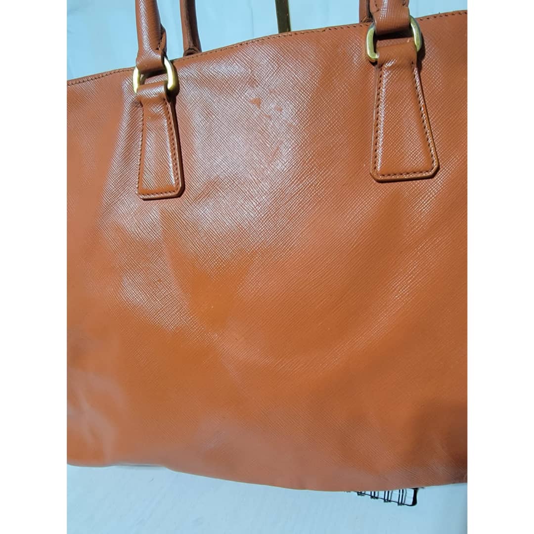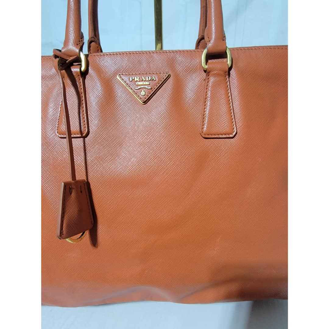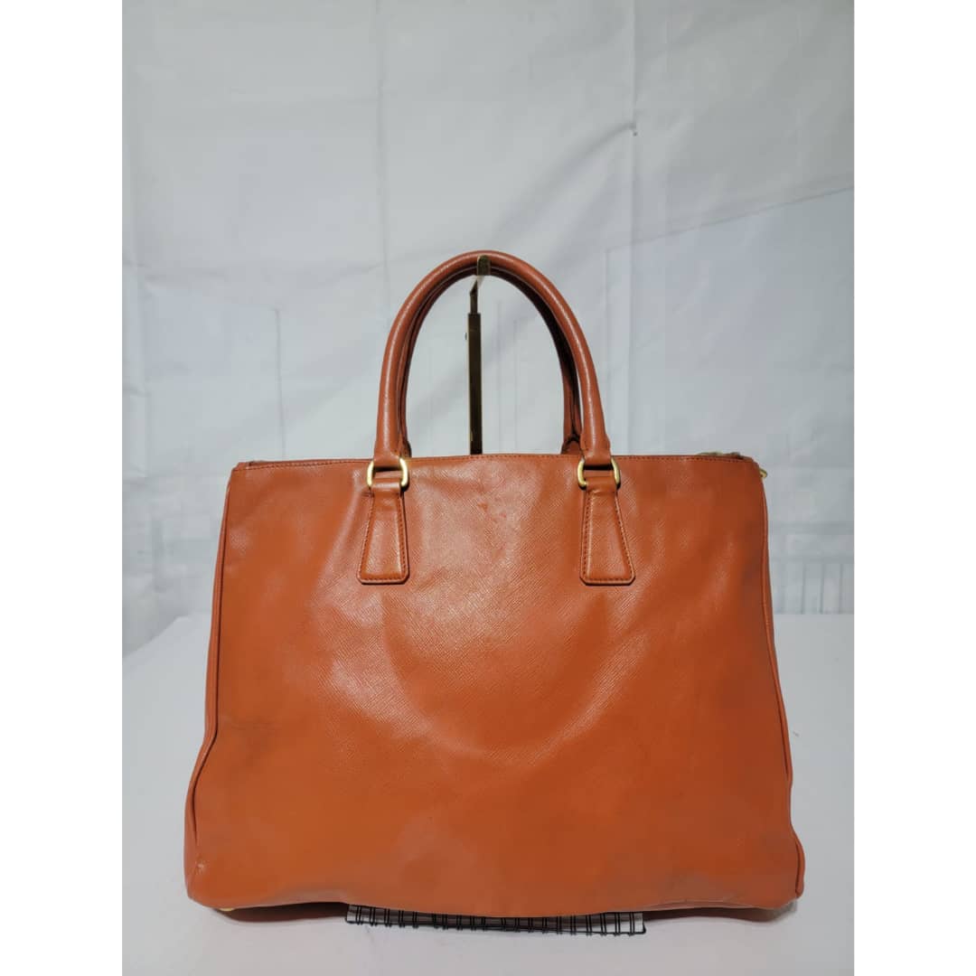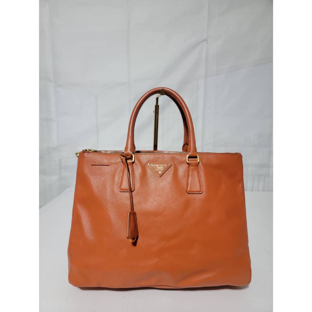 This authentic Prada Saffiano Lux Leather Double Zip Tote Bag Orange is in it’s good pre-owned condition. The exterior leather is clean and beautiful, it shows some scratches to the saffiano leather, the base edges shows some scratches and little scuffs (Kindly look at pictures above). Interior is clean. Gold hardware shows some scratches. Handle shows some rubbing to it.