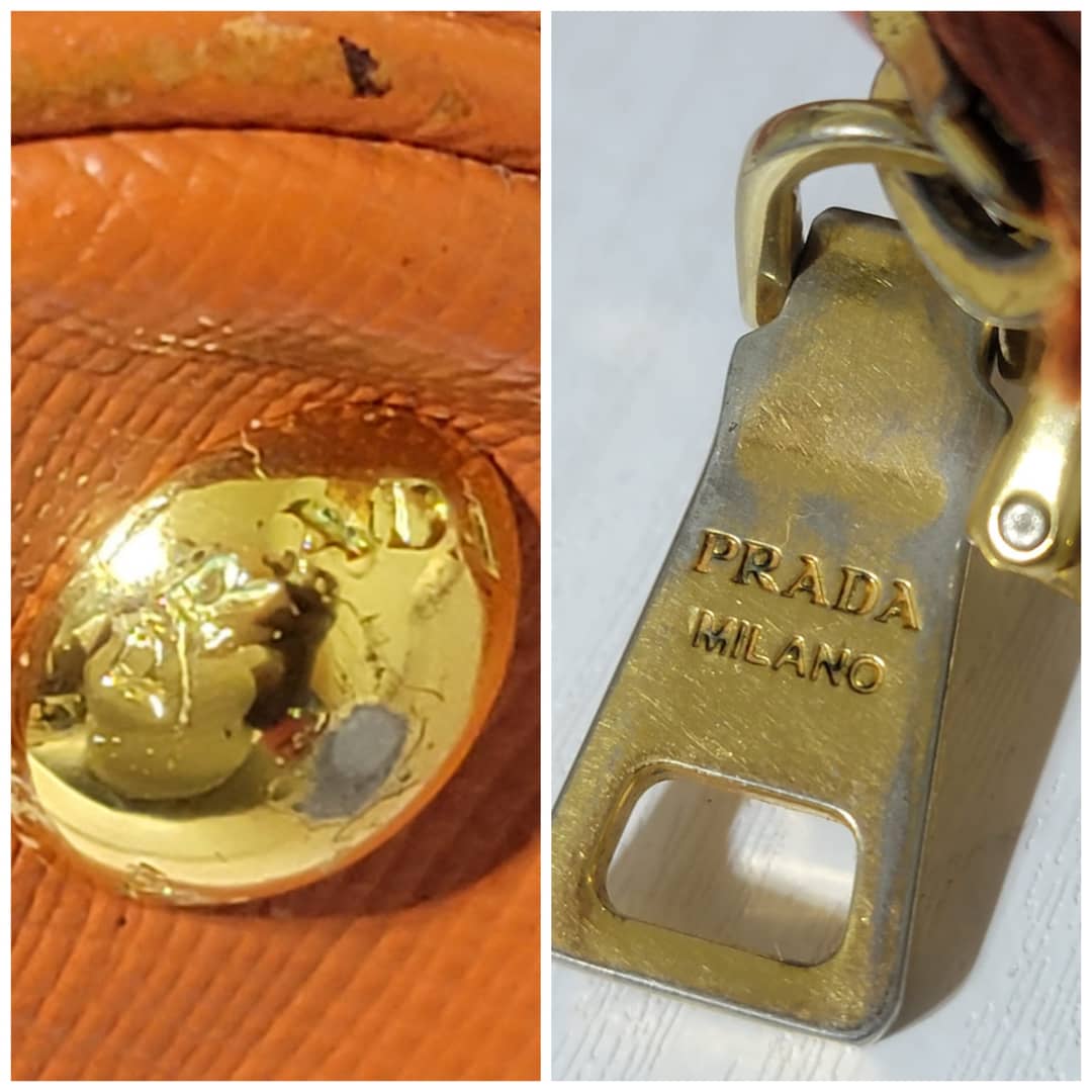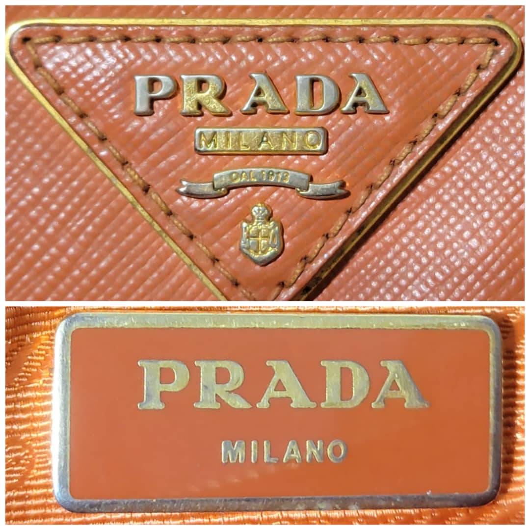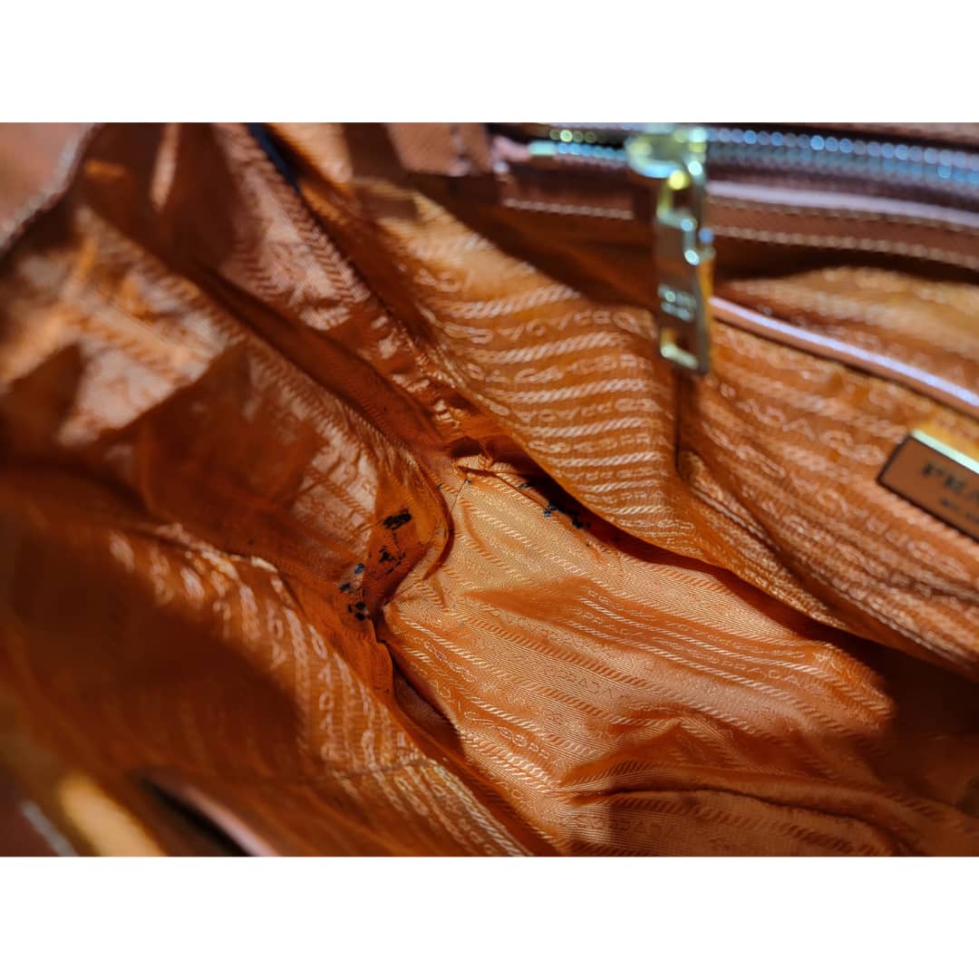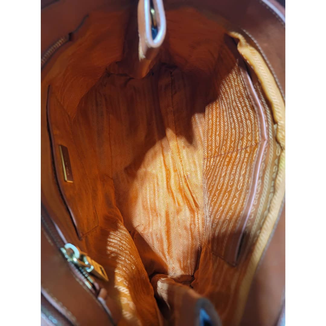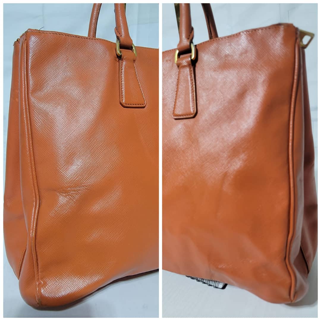 This authentic Prada Saffiano Lux Leather Double Zip Tote Bag Orange is in it’s good pre-owned condition. The exterior leather is clean and beautiful, it shows some scratches to the saffiano leather, the base edges shows some scratches and little scuffs (Kindly look at pictures above). Interior is clean. Gold hardware shows some scratches. Handle shows some rubbing to it.