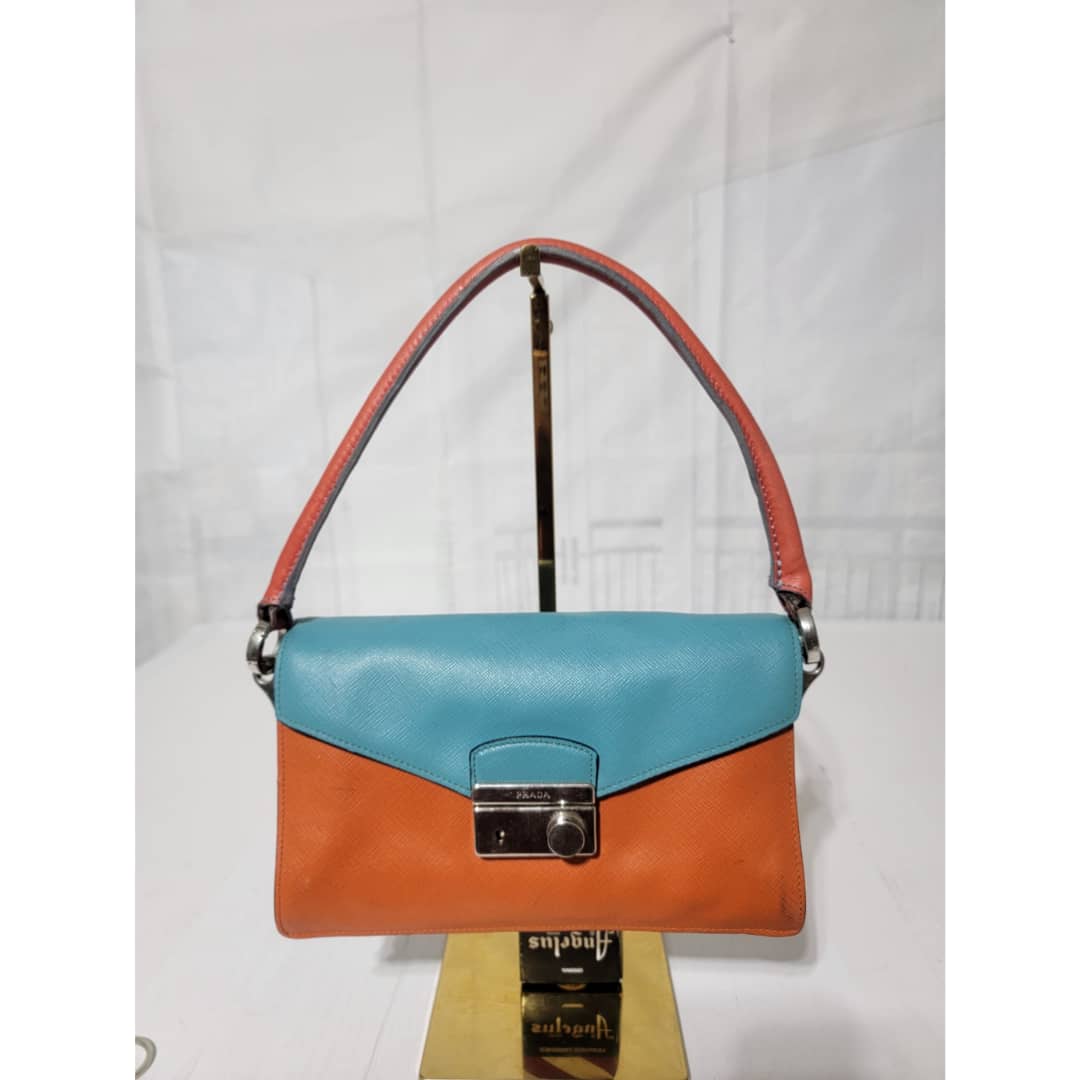 This authentic Prada Saffiano Sound Lock Pochette Shoulder Bag Orange/Blue is in it’s good pre-owned condition. The exterior is clean and beautiful, there is a little bit of dark scratch on the side of the bag, (Kindly look at pictures above). Interior is clean. Silver hardware.