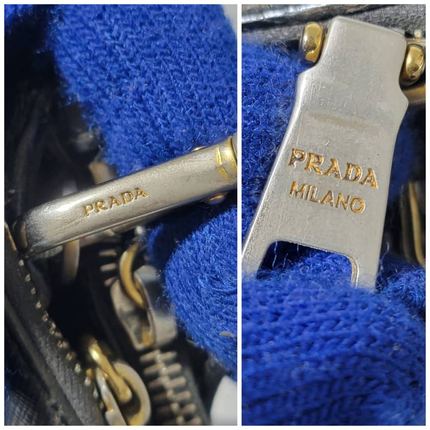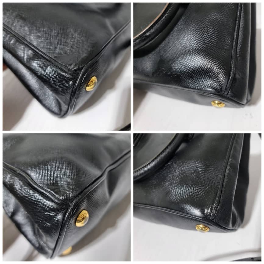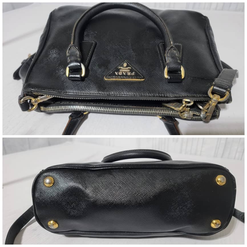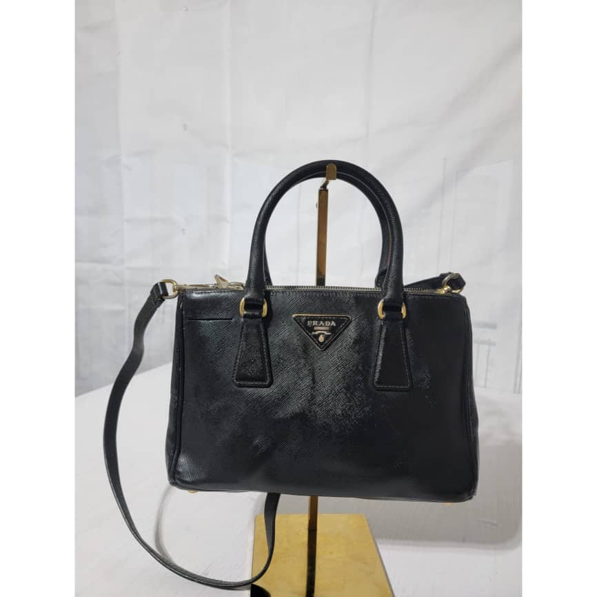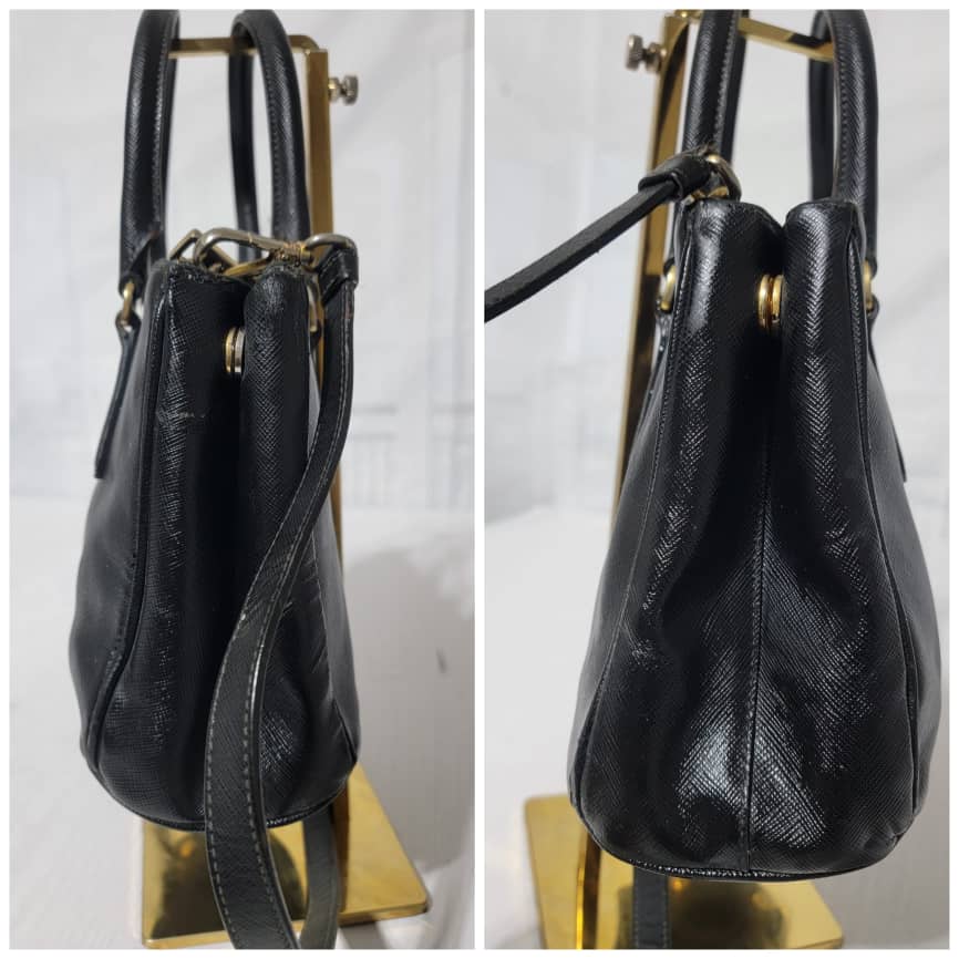This authentic PRADA Saffiano Vernice Mini Galleria Double Zip Tote Black is in it’s pre-owned condition. The exterior is clean. Interior is clean. The top trim shows some scratches to it. The gold hardware shows some rubbing and scratches to it. The edges shows some scratches to it.
