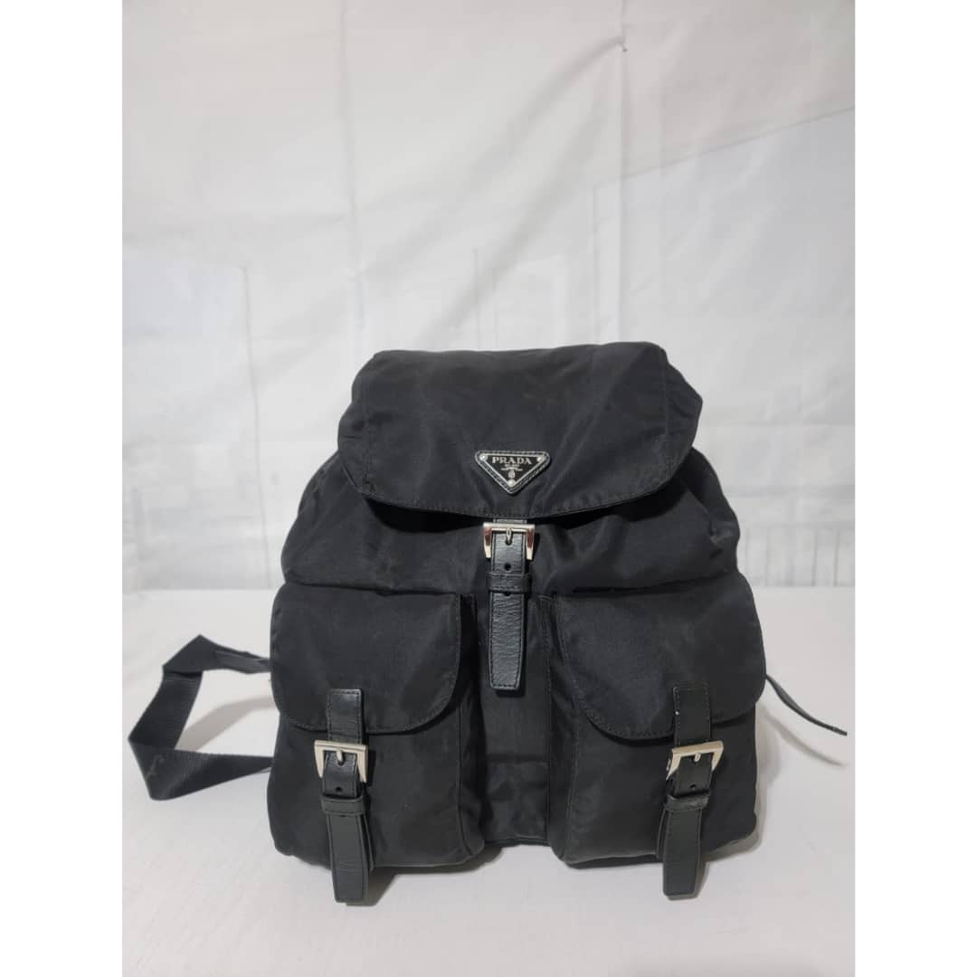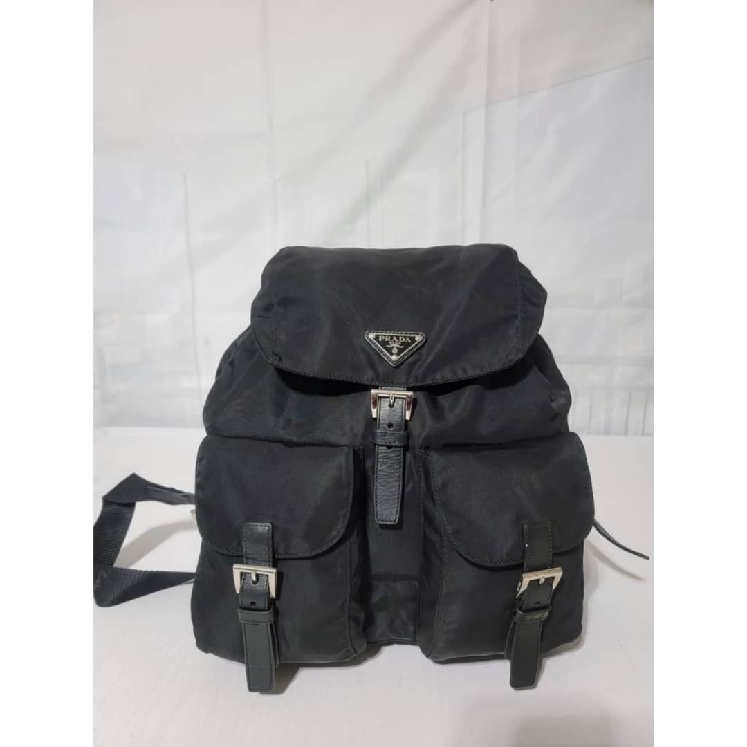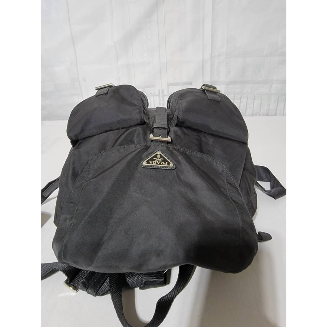 This authentic Prada Tessuto Double Pocket Backpack Black is in it’s good pre-owned condition. The exterior is clean and beautiful. Interior is clean. Silver hardware.