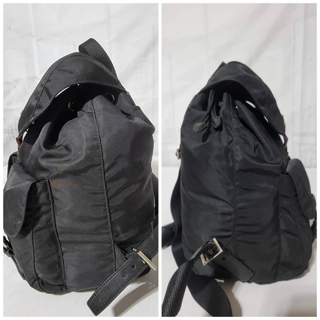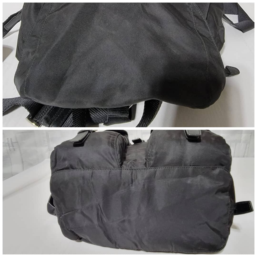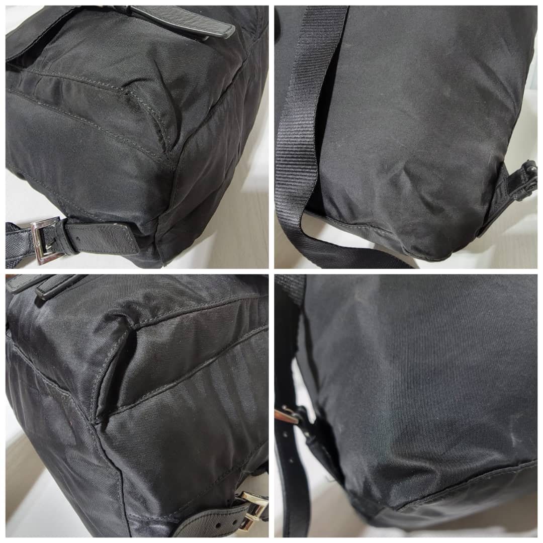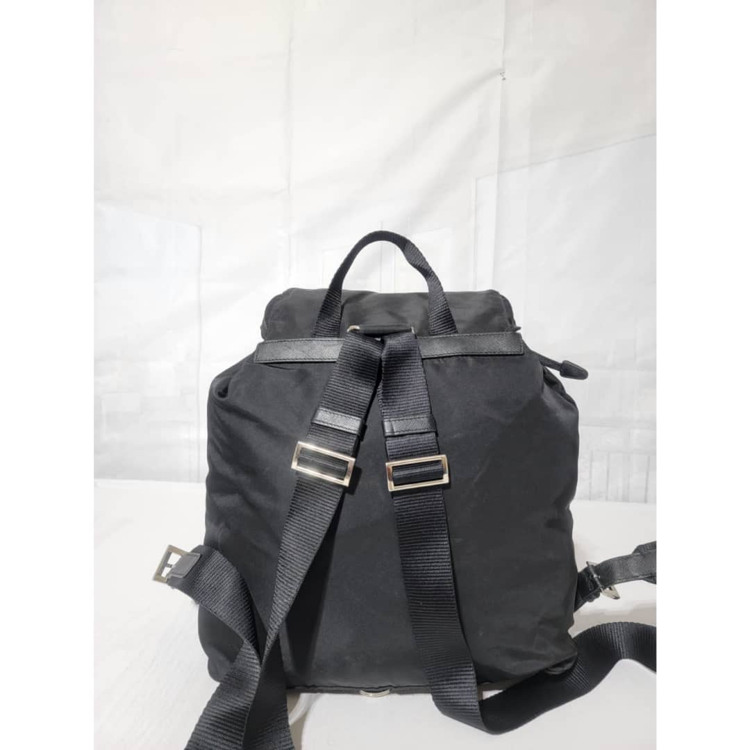 This authentic Prada Tessuto Double Pocket Backpack Black is in it’s good pre-owned condition. The exterior is clean and beautiful. Interior is clean. Silver hardware.