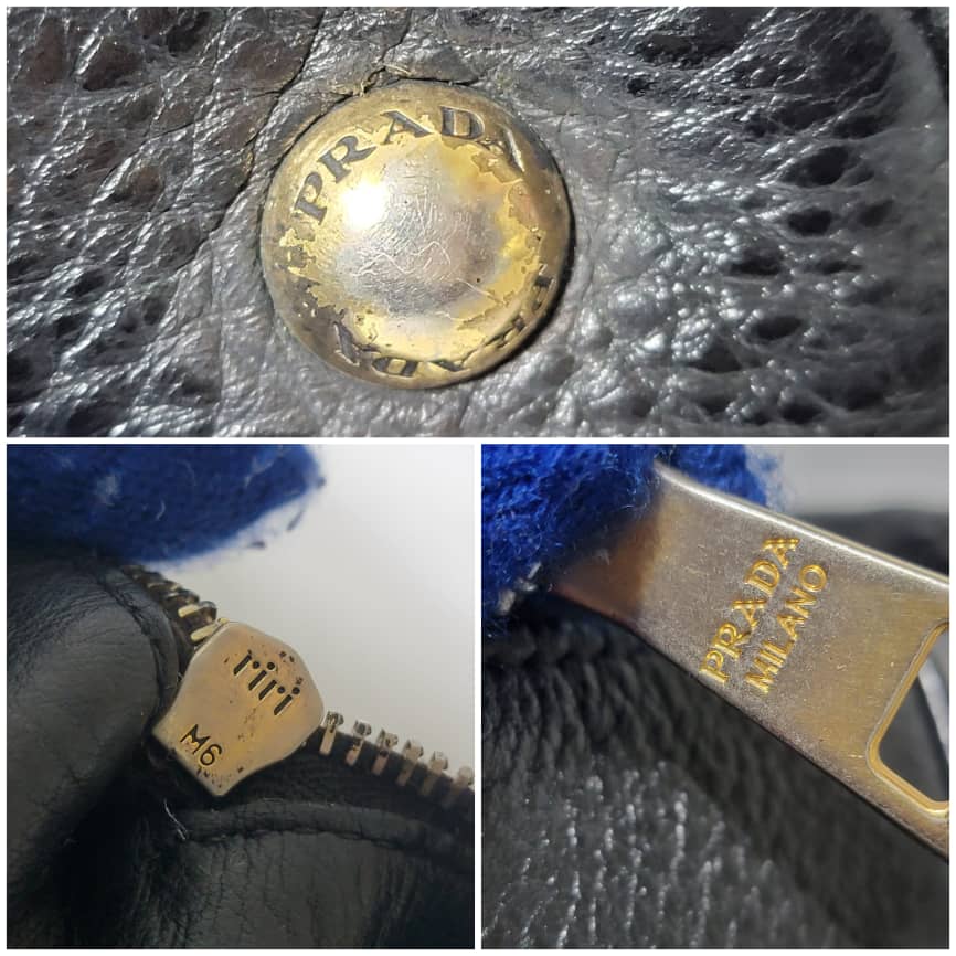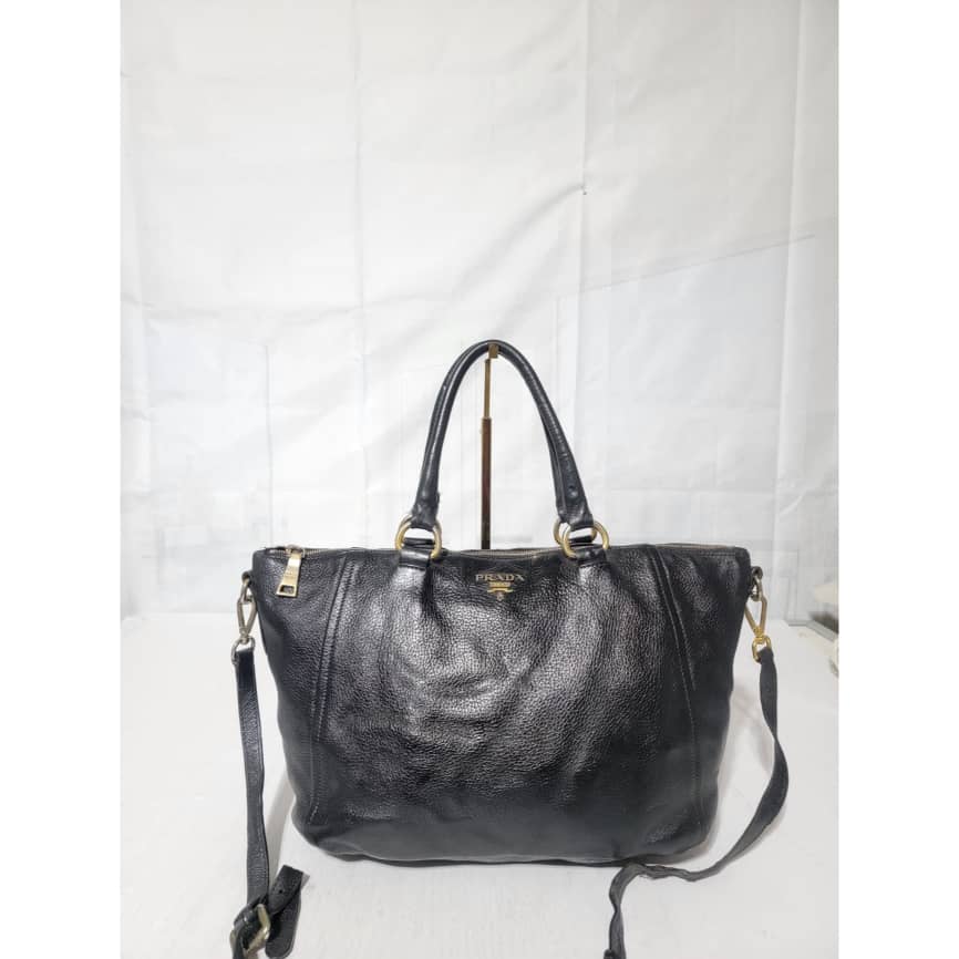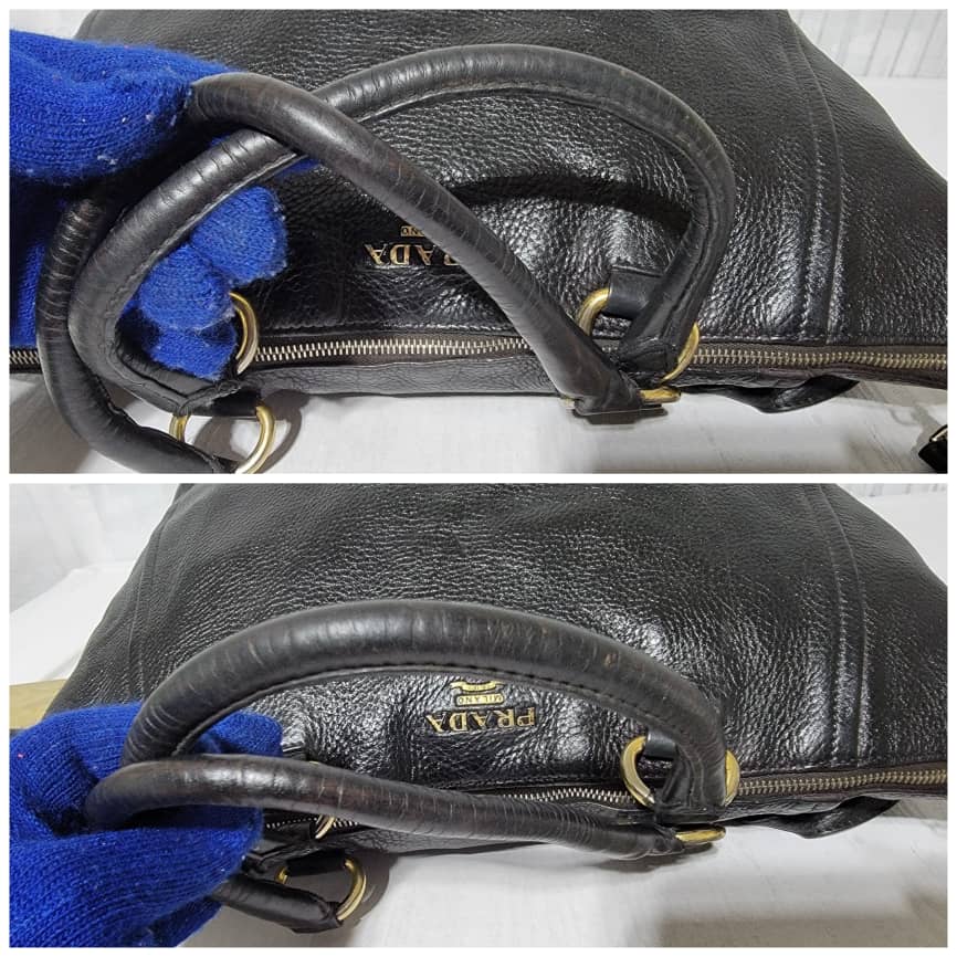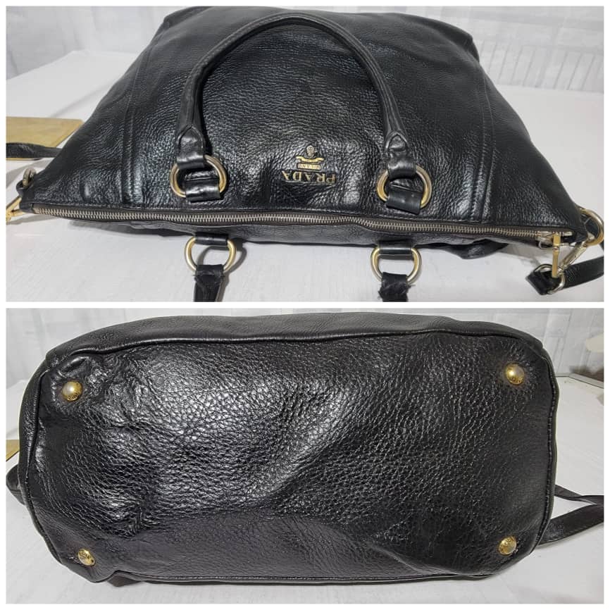 This authentic Prada Vitello Daino Pebbled Leather Satchel Bag Black is in it’s pre-owned condition. The exterior pebbled leather is clean. Interior is clean shows some hairy pull to the interior lining. Gold hardware shows some scratches and rubbing to it. The handle shows sign of use. It comes with a long strap.