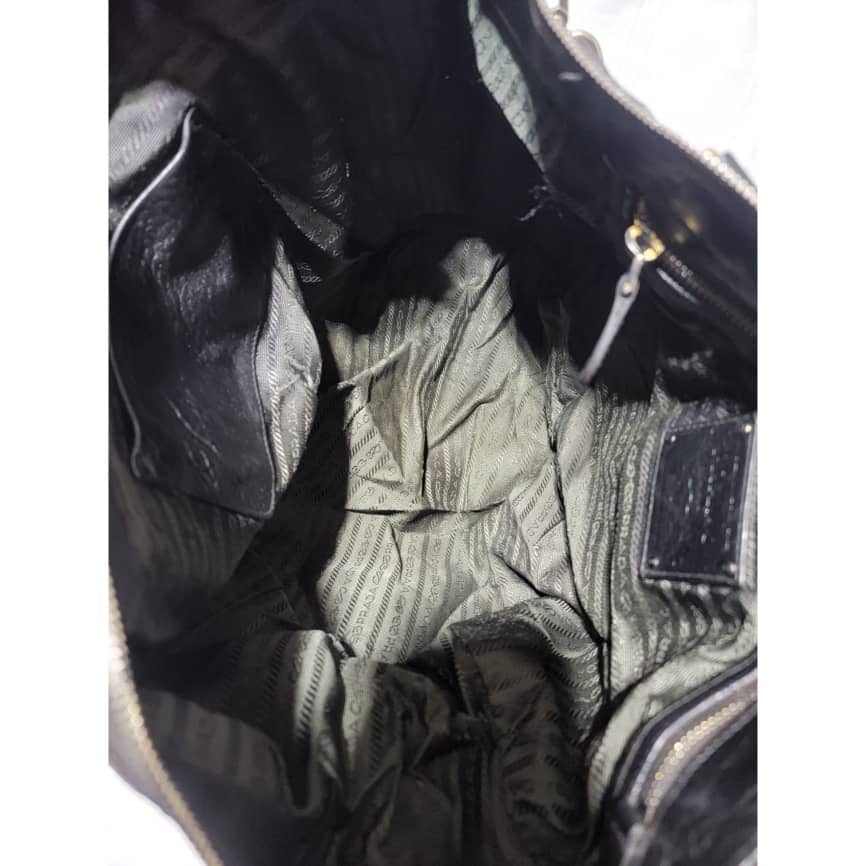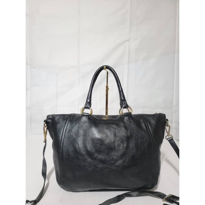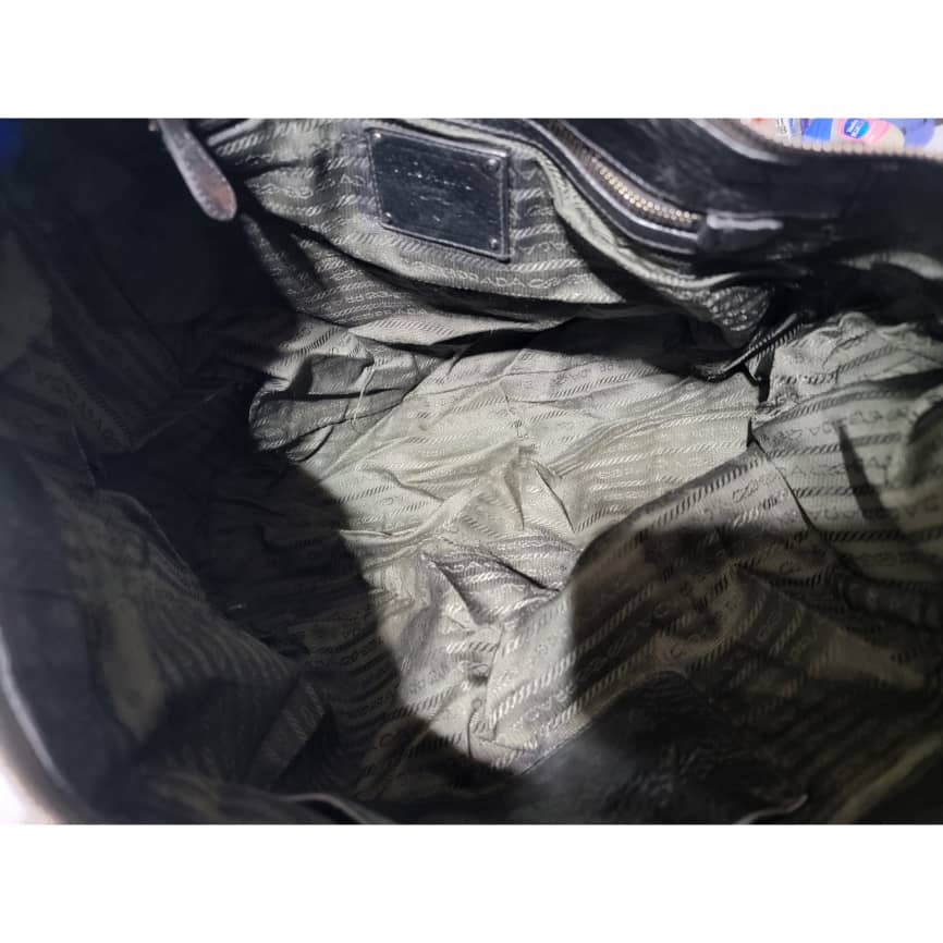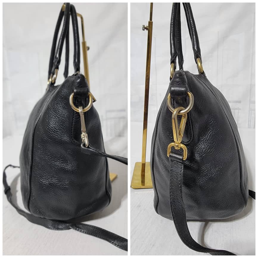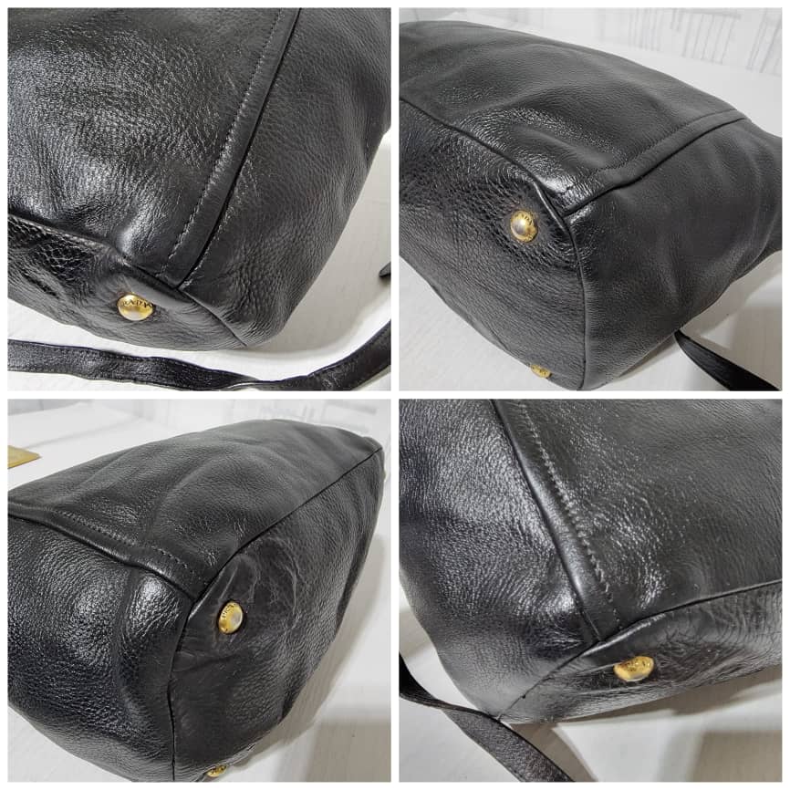 This authentic Prada Vitello Daino Pebbled Leather Satchel Bag Black is in it’s pre-owned condition. The exterior pebbled leather is clean. Interior is clean shows some hairy pull to the interior lining. Gold hardware shows some scratches and rubbing to it. The handle shows sign of use. It comes with a long strap.